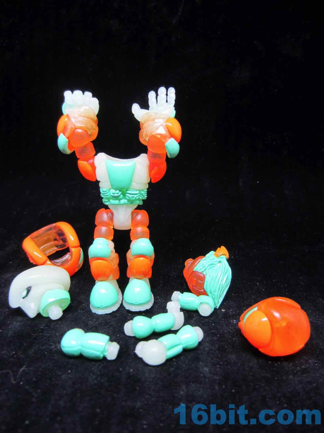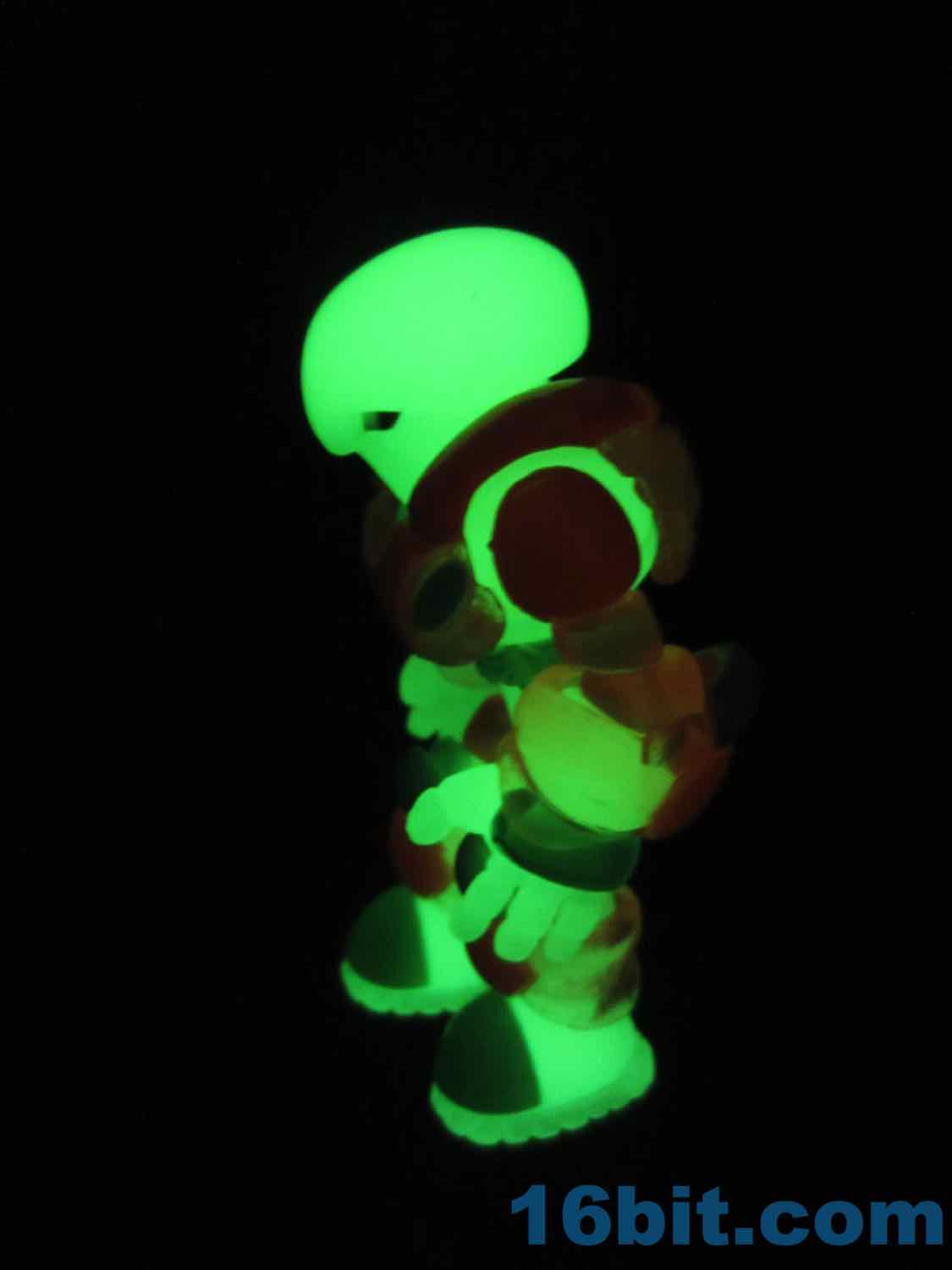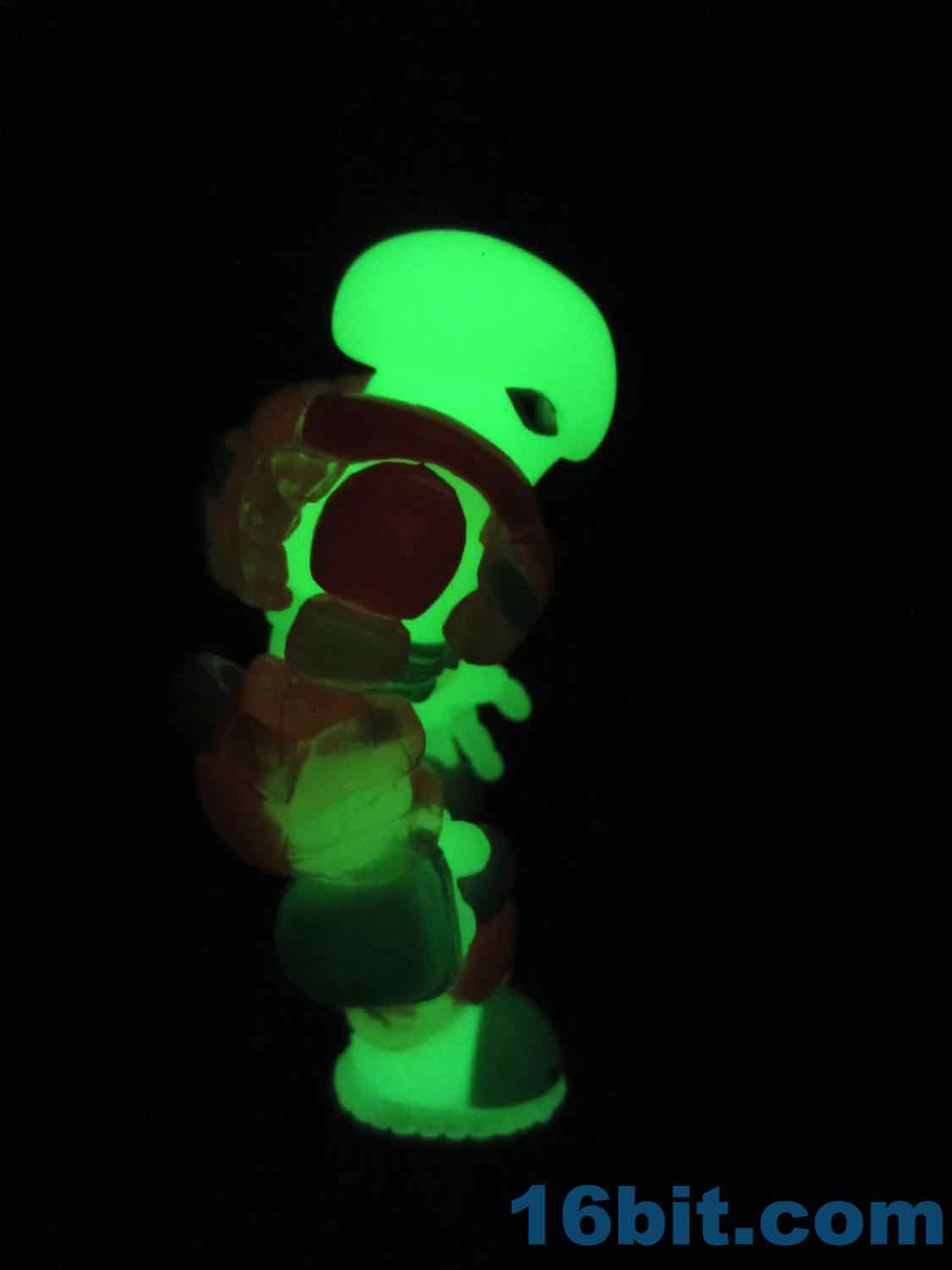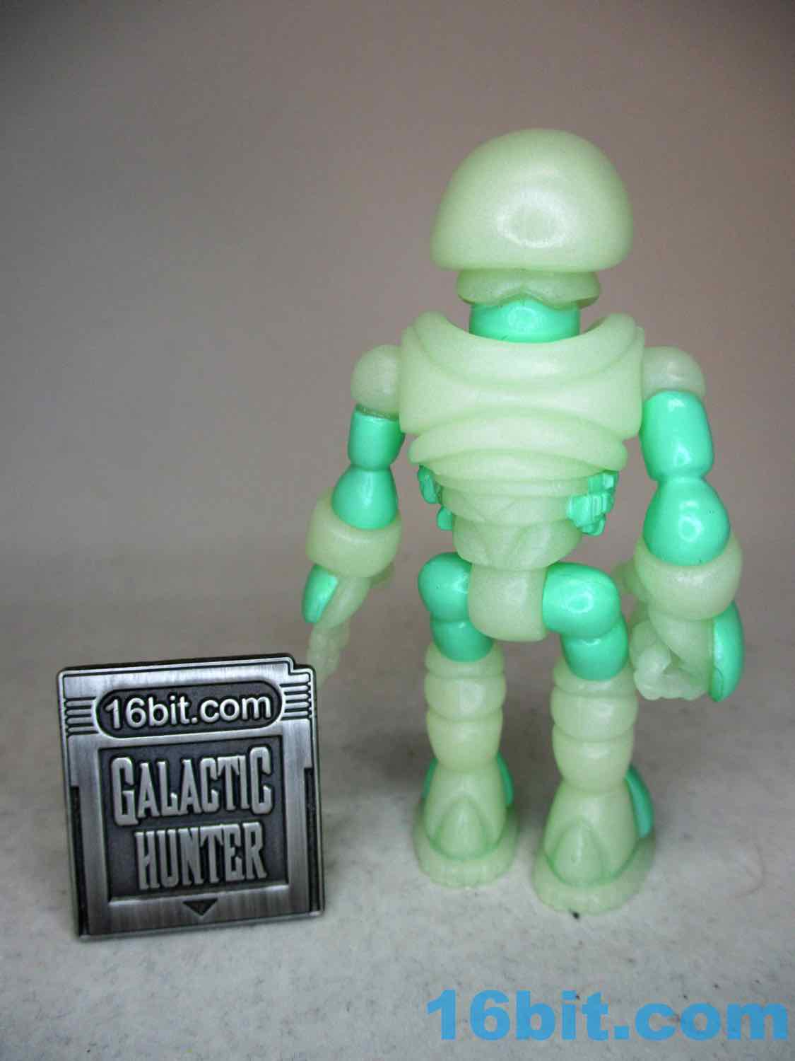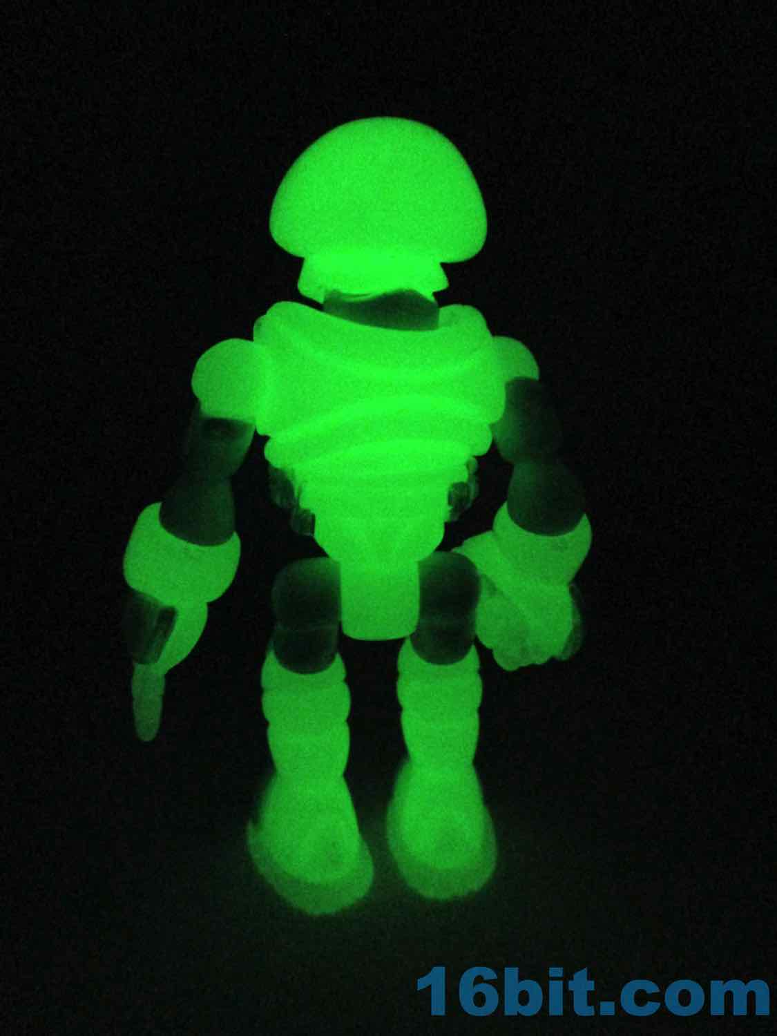 As usual, Pheyden has 13 pieces and 12 joints, cast in that off-white-ish green glow plastic we all know and love. It does a great job of lighting up a dark room, and this time he has extra green painted details on his knees, the backs of his hands his belts, and the toes of his boots. The eyes are black, green, and white, and he stands about 2 3/4-inches tall. He can pop apart at each joint, and you'll need to make use fo that feature if you want to dress him up in his Glyarmor or swap out the heads.