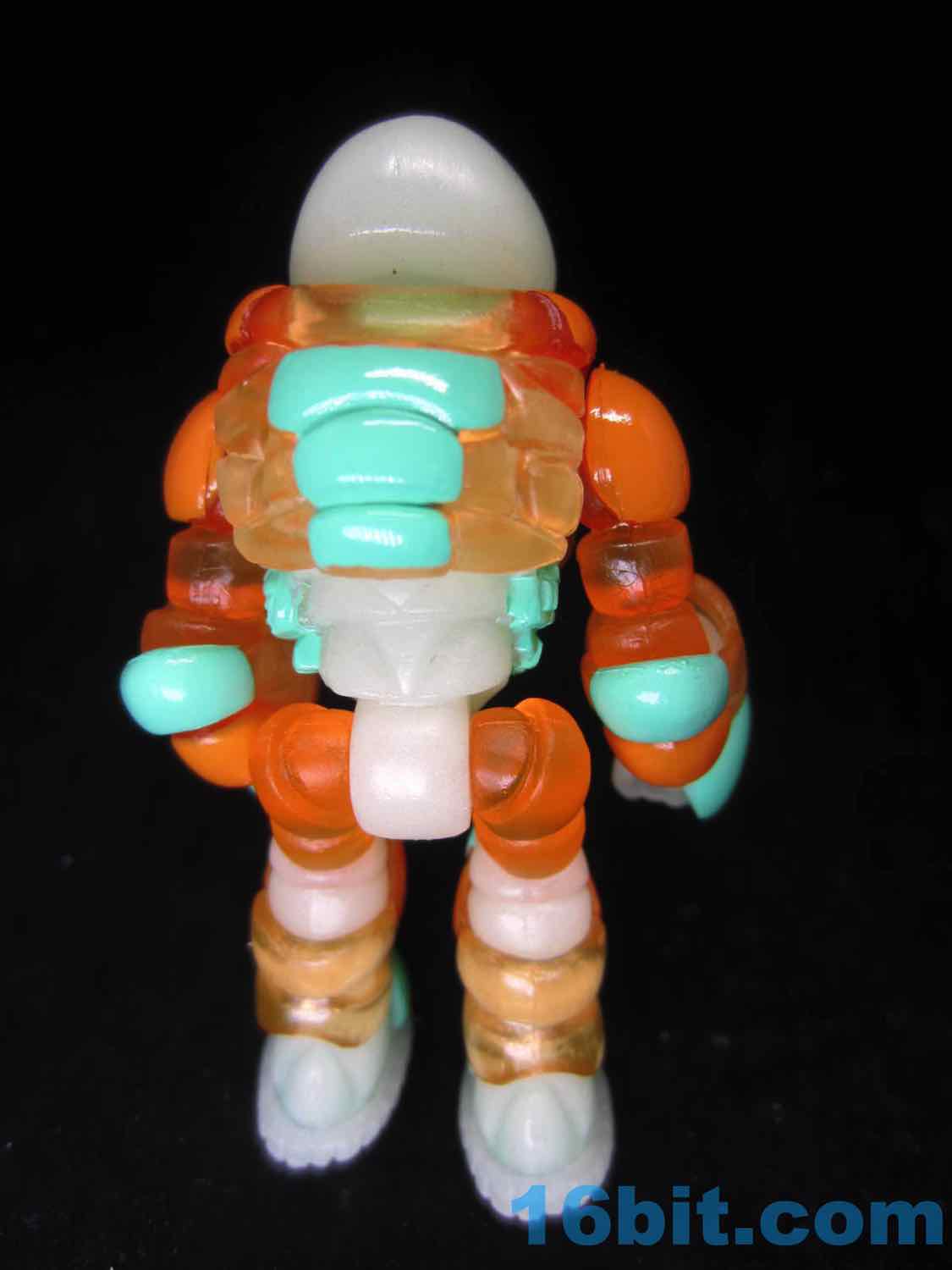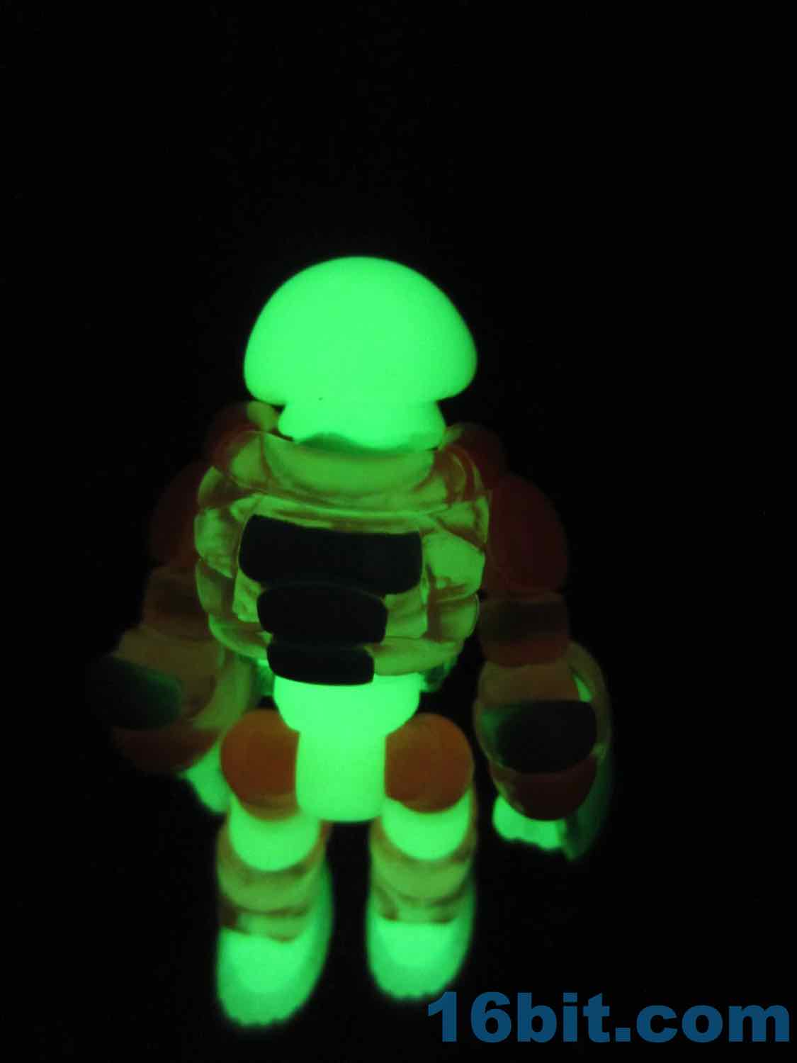 The chest armor goes on easily, just pop off the head, clip it on, and you're done. It also has alternate orange shoulders and hips, which match the armor nicely. You can easily slide the armor pieces over the figure's glow shins, but the wrists have to be carefully twisted on. They have a death grip otherwise, so don't fight them or you're likely to tear something. When he's all dressed up, he's a bulky warrior that looks good in pretty much any light... provided you charged him first. The armor matches the style of other Onell Design figures, and also clamps over Quallerran (or Noboto) bodies nicely. It's a nicely versatile upgrade pack, although having so many extra heads certainly gives one decision paralysis when it comes to how you want to display these guys.