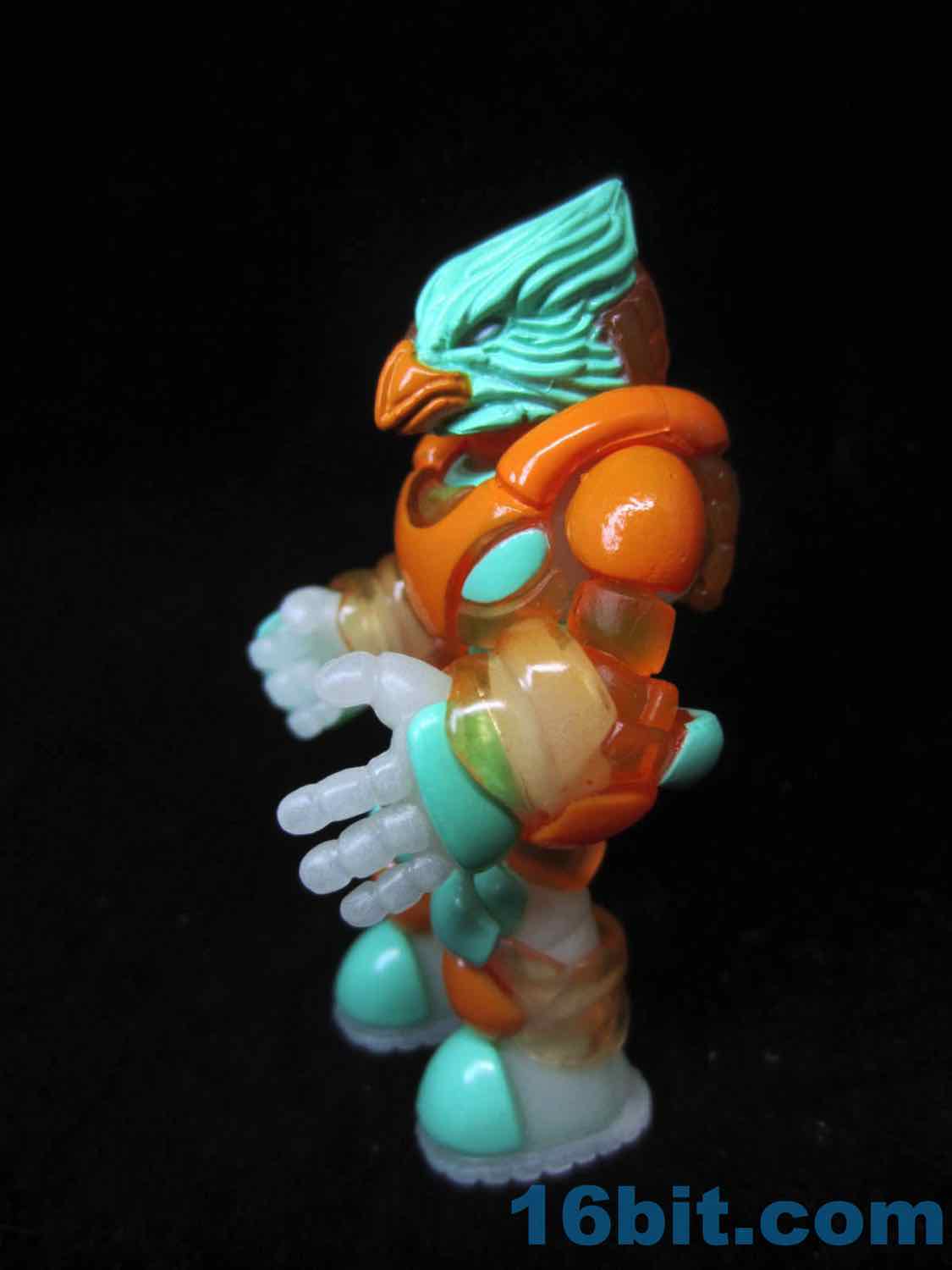 The clear orange Glyarmor pieces are what shift Pheyden from being pretty good to great, at least in terms of your options. (Keep a bag for storage.) A two-piece Neo Sarvos head - that's the helmet with the green visor - joins the cyborg bird Varteryx head.