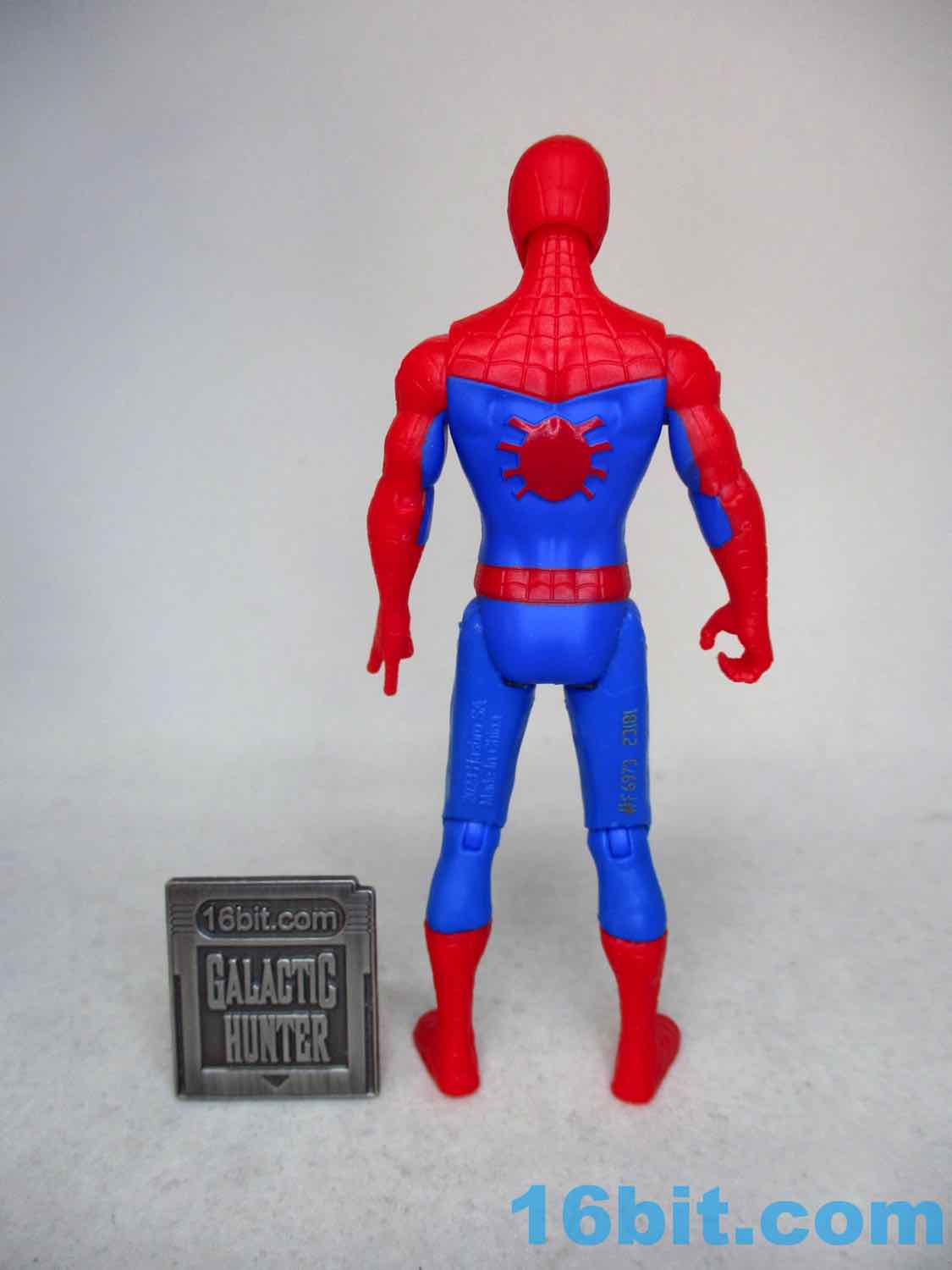 The sculptor did a good job with the web, which has little oozy tips and webby bits in it. Similarly, the figure sculpt is pretty good - but a bit weird. The knees look like they have pads and the arms are a little short, but otherwise? It's a nice Spider-Man. He has big eyes with painted white and black elements. The spiders on his front and back look fantastic, and the ribbing in the costume looks perfectly good. The bulk of the blue on the figure is painted - not molded in color like Spider-Man [FOTD #2,453] from the bagged line. Notably, the upper and lower legs seem to be blue plastic with molded red plastic for the feet to keep costs down.