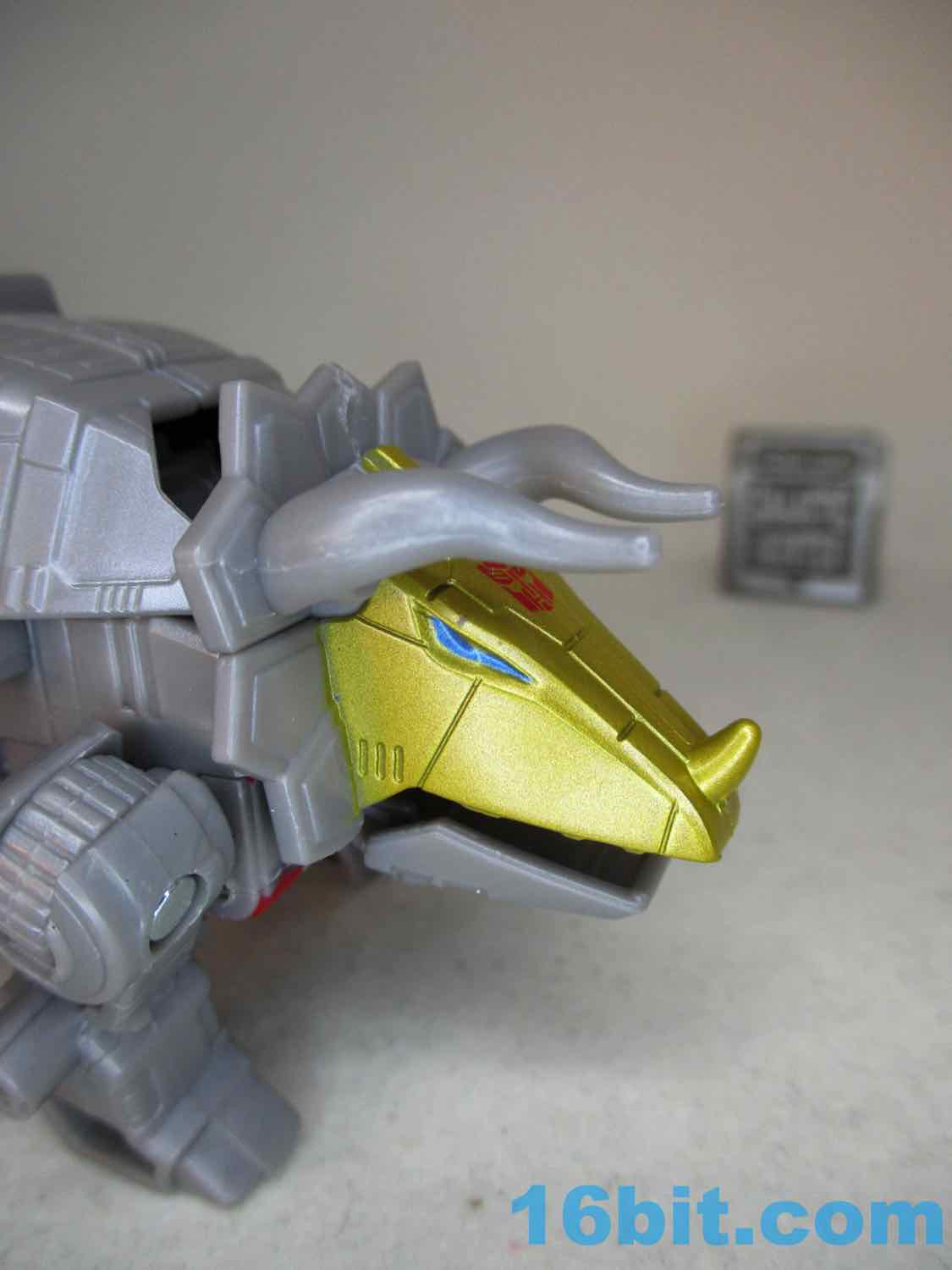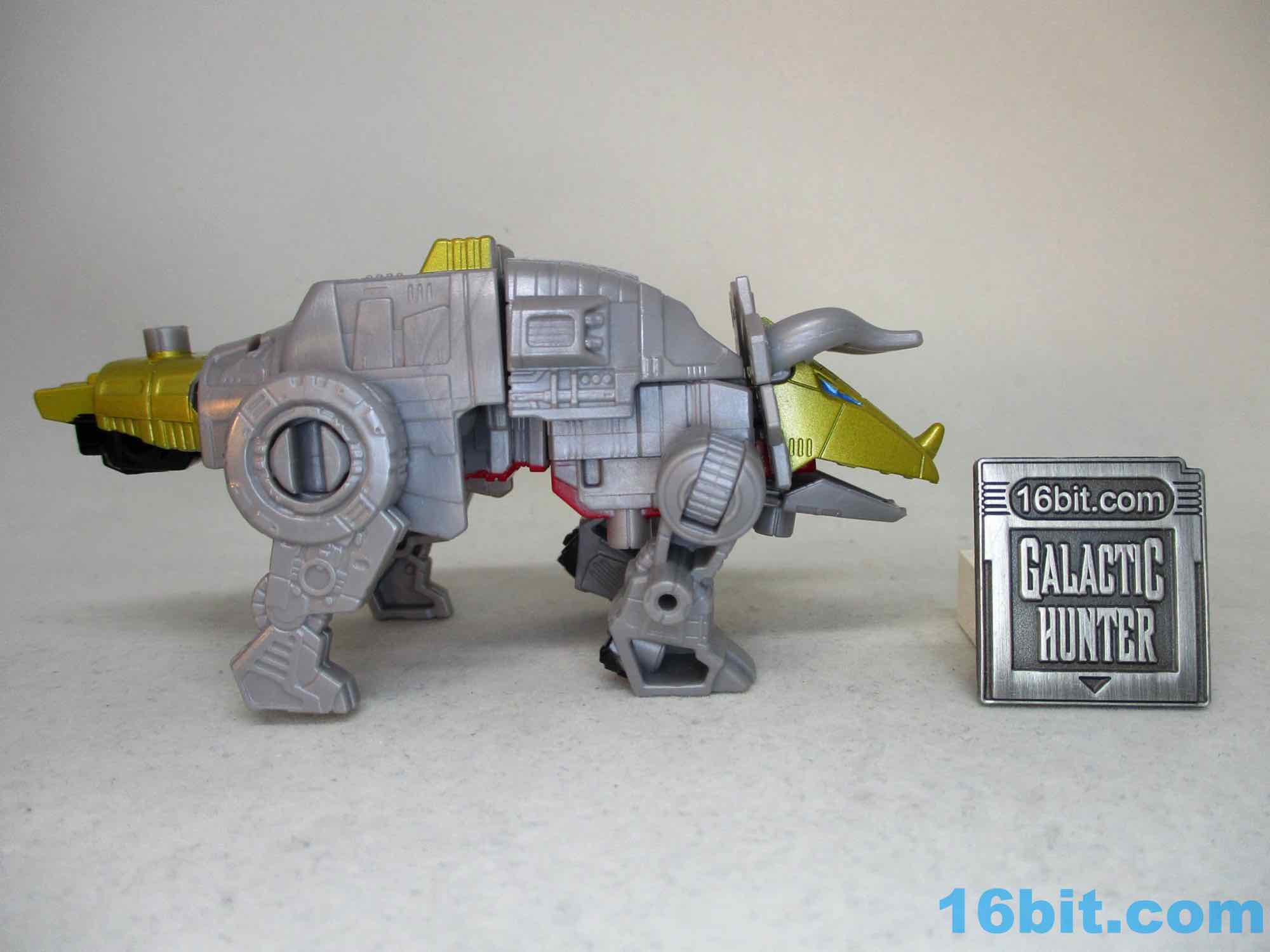 The robot is a little stiff, but it looks like cartoon Slag - or Canadian Slag - in that he has a red face. One detail I absolutely love about the figure is the articulated neck - the entire triceratops head swivels with the red robot face inside, which is a big improvement over the expectations of a neck that would be frozen solid. The elbows swivel and can go out, which is nice, and the legs have both hip and knee joints. Sadly there are no elbows, and the "weapon" is kind of dumpy, but you get a nice-looking robot that certainly delivers on what most older fans see as the dinobot formerly known as Slag.