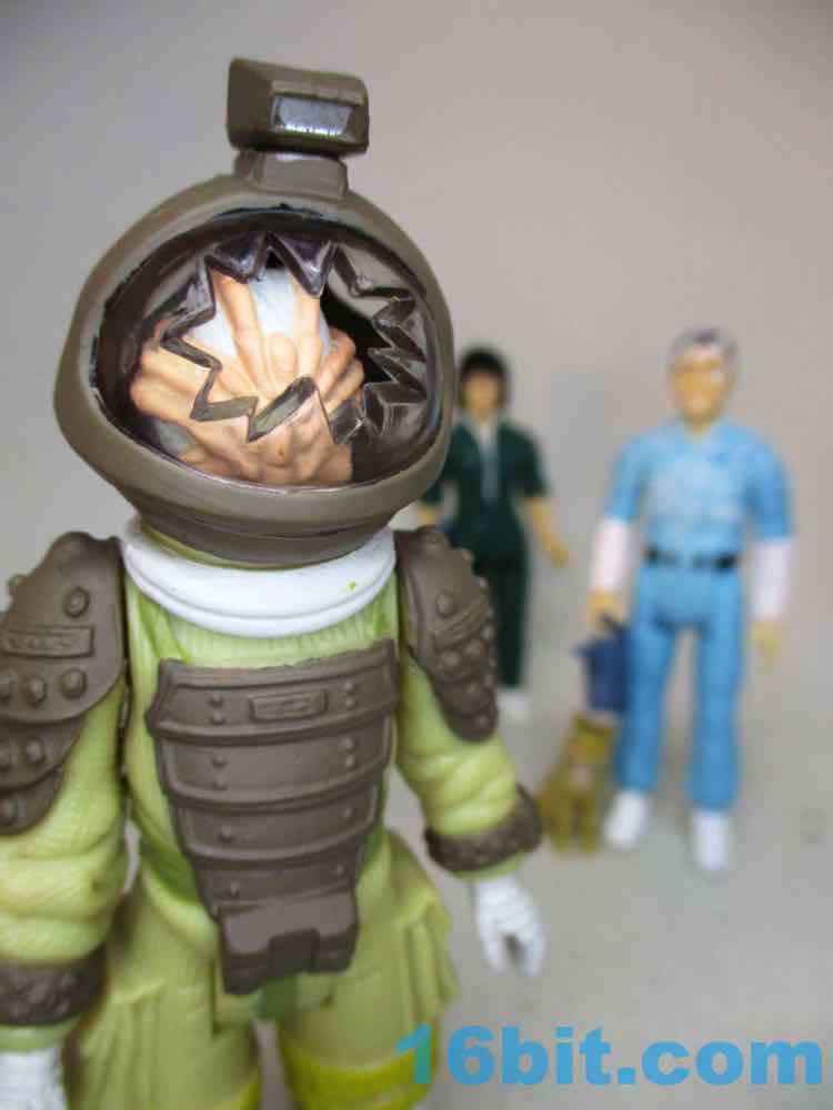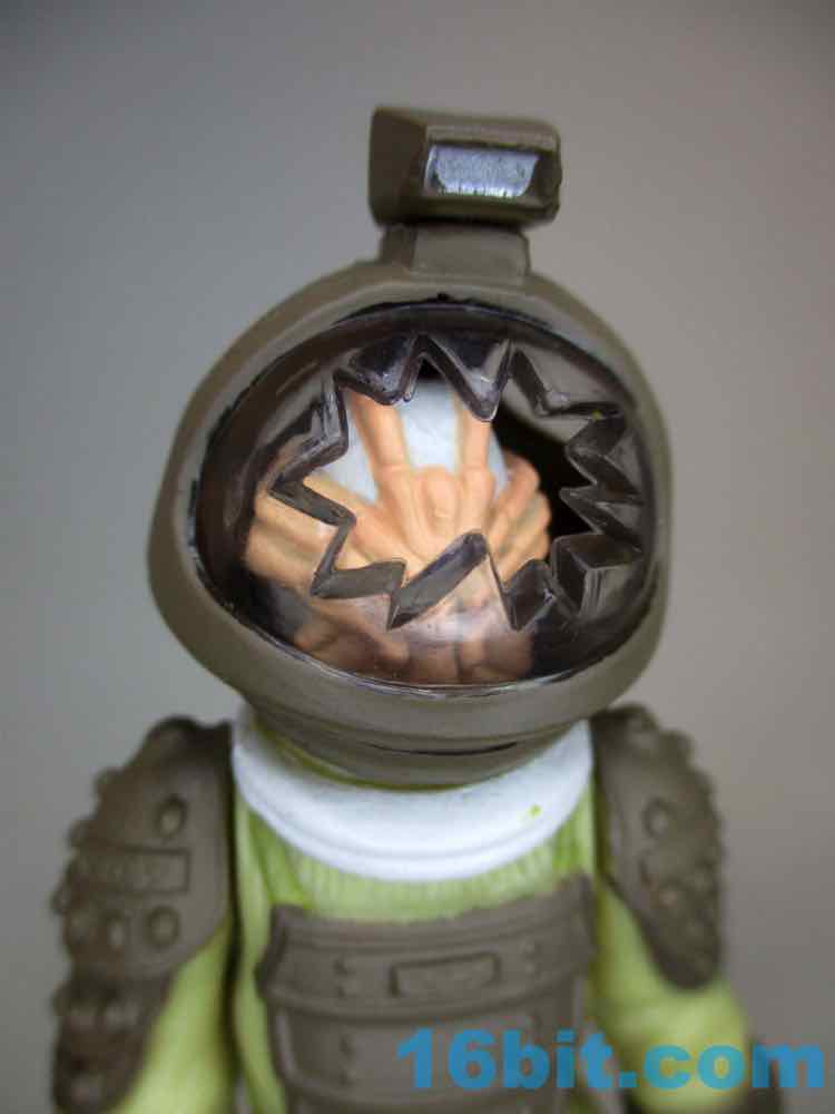 Kane has been made a few times. All three of these figures are riffs on unmade Kenner designs, and this is one of three "realistic" space suit Kane toys. (Weirdly, the one from the space suit 3-pack that I had had a helmet that... I don't know what happened to it, but check out the pictures below.) The head is a new sculpt with a molded-on Facehugger, and the helmet has a crack in it. The sculpt is incredibly similar to the previous release with new copyright markings - Funko is no longer involved - and a paint job more true to the movie. The funny thing is each version looks good for different reasons, my favorite of which is probably that first Funko release. The Kenner colors looked great, but I really do like how these are all different and interesting.