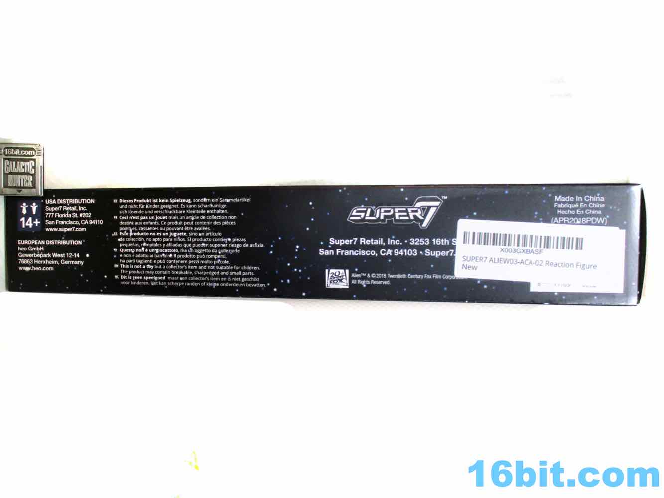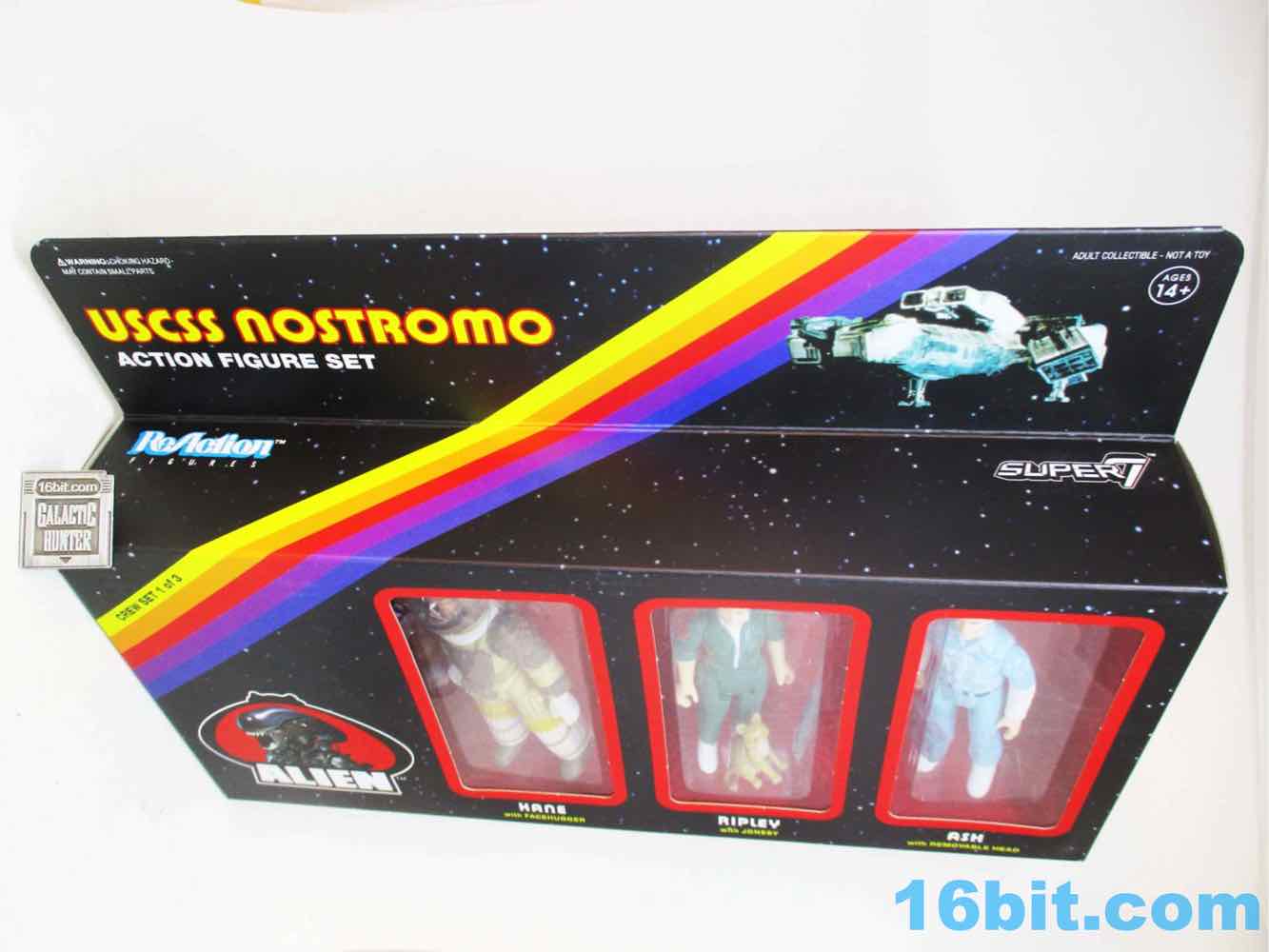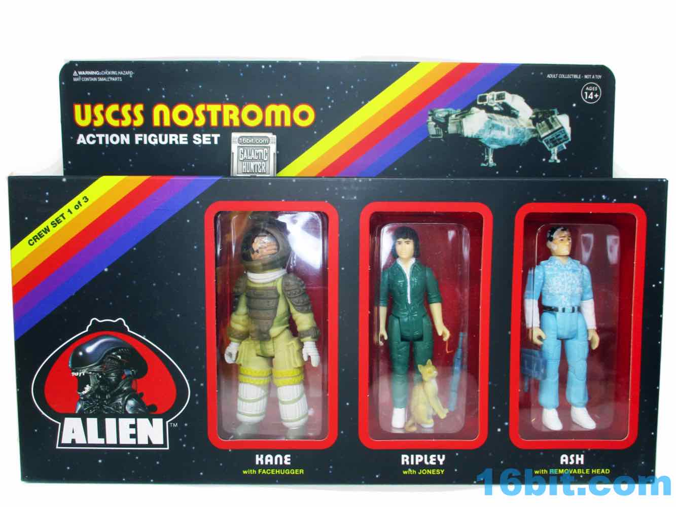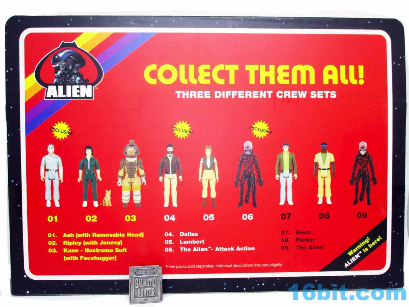 Item No.: No. ALIEW03-ACA-02 Manufacturer:Super7 Includes:Kane's helmet, Jonesy the Cat, Ripley's flamethrower, Ash's Motion Detector Action Feature:Ash has a removable head, Kane has a removable helmet Retail:$44.99 Availability: 2018? Other: One of many ReAction Alien sets