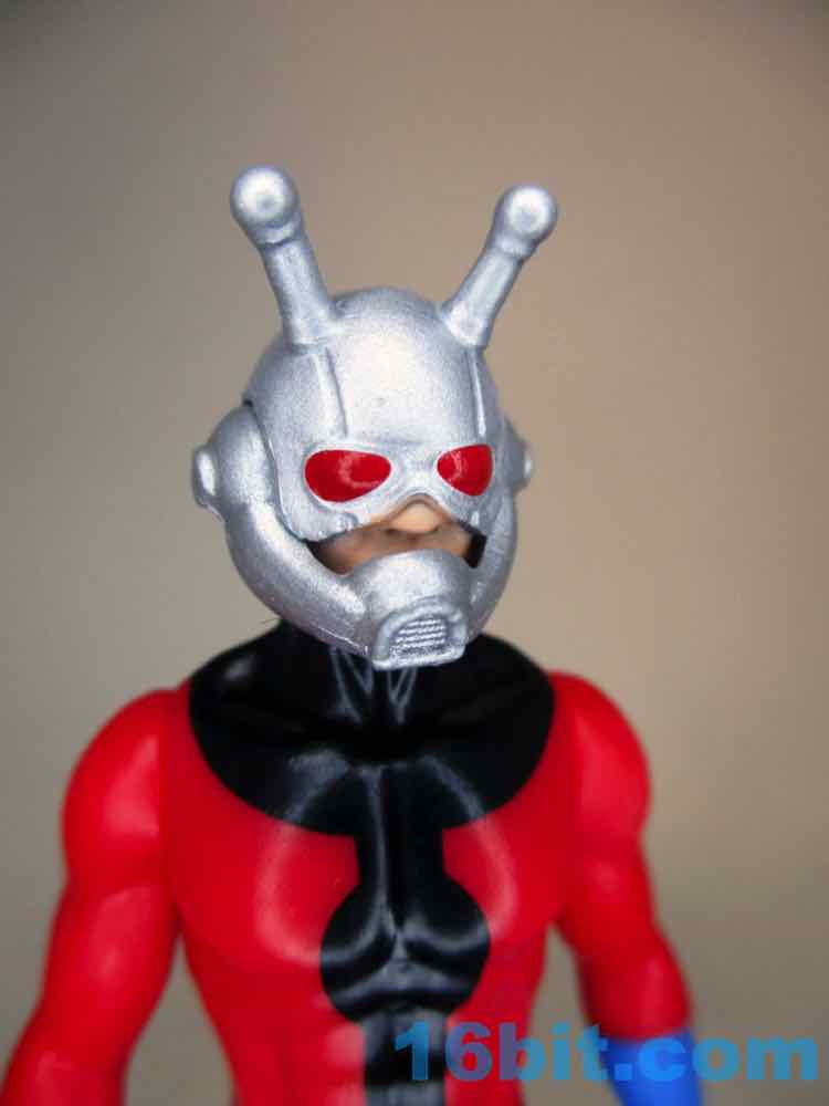 What makes this figure stand out is the head. Usually, Ant-Man is depicted without the lenses, which this figure has. Previous Hasbro comic Ant-Man figures left them off, but hey, they look kind of cool and a little weird. The head and helmet seem to be at least two pieces, so you get the antenna - that's good - and the segment that hangs from the ears and covers the mouth looks like a separate element. If this were a real 1980s figure, it'd just be one piece, and you probably wouldn't be able to tug down the soft plastic piece to see his sculpted mouth. And you can here! That's pretty cool.