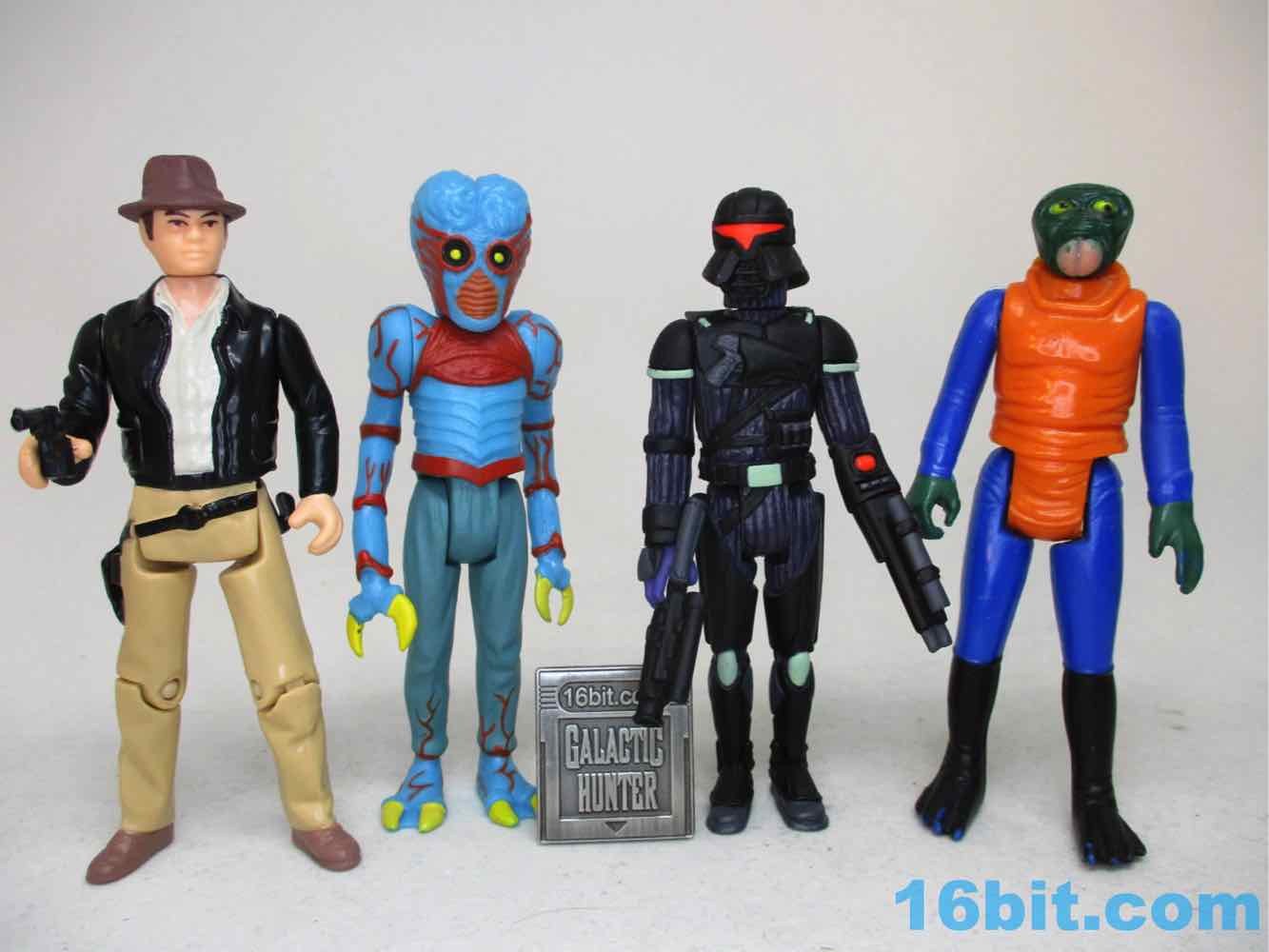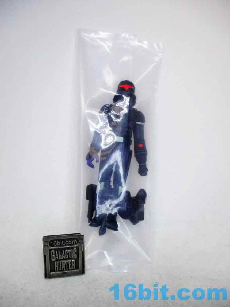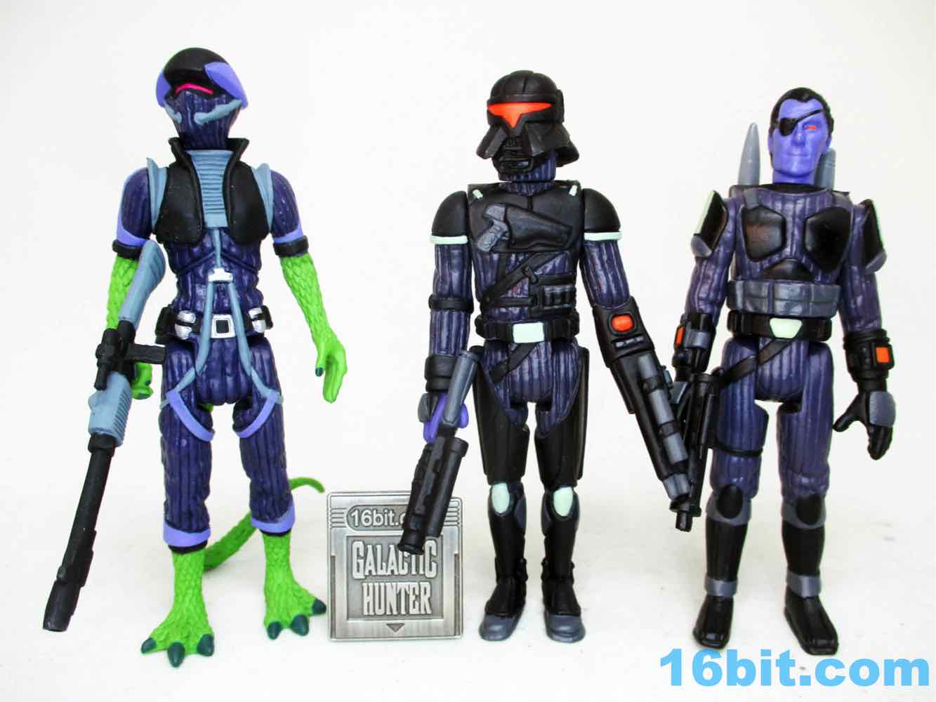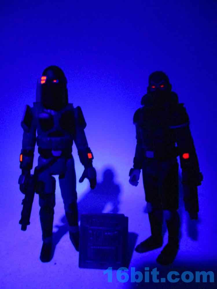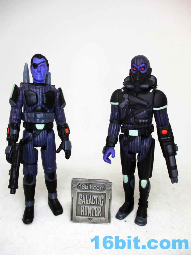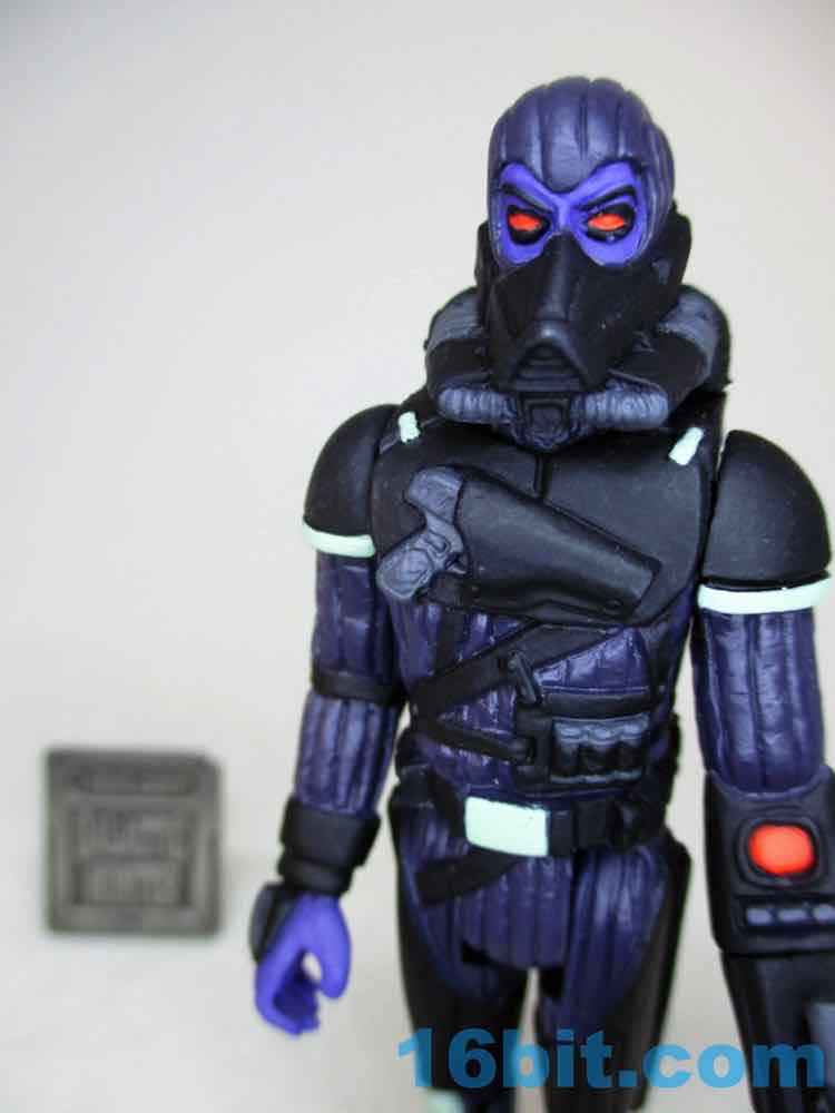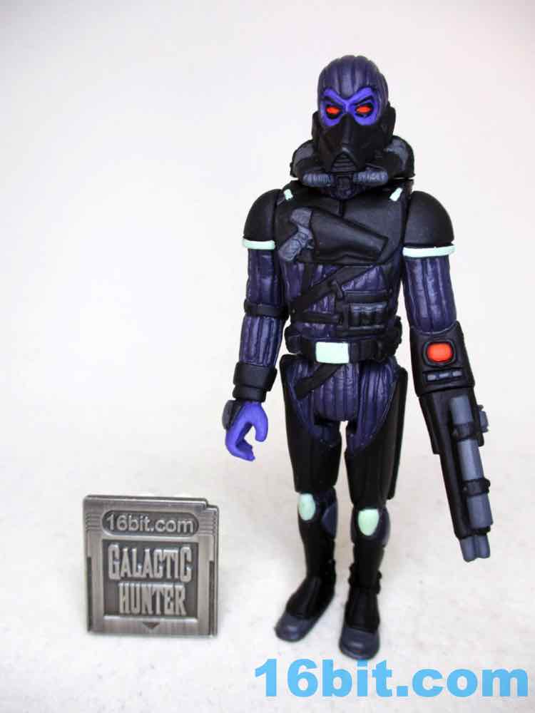 I like this one a lot. I expect a white and black "Stormtrooper" Trooper is on the way, and so far I prefer Healey's more original - or at least, harder-to-spot-the-inspiration - colorways like this one. With dark blue skin and incredibly vivid red eyes (and visors!), these figures positively sing under UV light. The green bits look like they glow in the dark, but sadly, do not. While that's a shame, the figure looks a lot like what Kenner probably would have made by the late 1980s or 1990s had they continued to produce new Star Wars action figures. With this one in particular, you can see a Thrawn-like face un the unmasked head, a Boba Fett-like blaster, and a helmet that looks like it could be a back-up dancer for Cylon and Garfunkel. I hope you got one, because he sold out within hours.