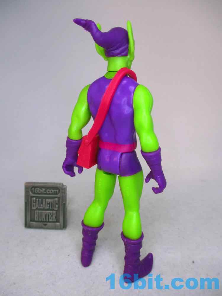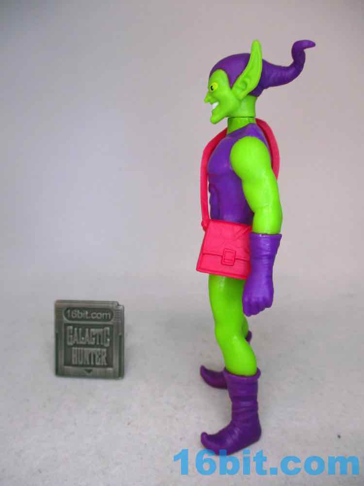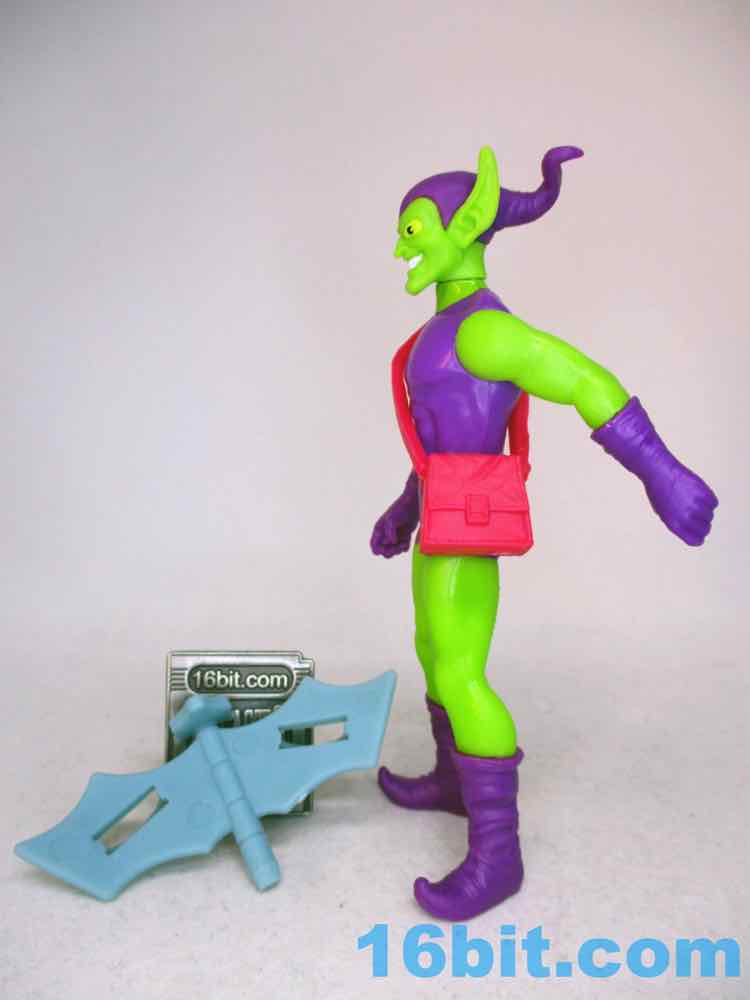 I love the bright colors, and he stands great on his own. Green Goblin fits in old Kenner vehicles quite nicely, although the disconnect between the nicely detailed hands and boots from the rest of the body is kind of weird. It's also the kind of thing Kenner frequently would do, taking a comic/movie-style Robin action figure, altering the head to the stylized 1990s animated look, and releasing it with no additional sculpt changes. I know it's kind of a slam to have lower expectations for some Kenner-style figures, but taking shortcuts is very much the kind of thing we saw a lot back then. It's still a nice figure, and that pink bag certainly adds to the sculpted detail without having to change the torso - and the belt is merely painted-on.