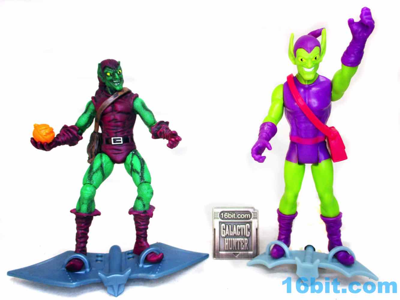 Hasbro used the same basic buck for most of the toys, but mercifully Green Goblin got some new parts to make him better. The hands, feet, satchel, and head are all new, as is the glider accessory. The chest, arms, and legs are recycled from several figures dating back a few years. It would be nice if he was a bit different in his build than the younger Spider-Man, but hey, whatever, we got one and odds are they'd be skinny had Kenner made them in the 1980s. Due to parts reuse, the green "skin" lacks the scales or detailing from the old comic books, but at least you get the pointy ears and giant, silly hat. Of note, that hat is a separate purple plastic piece affixed in palce - it looks great and should hold up to play wear. Assuming anyone were to play with it, that is. The satchel looks nice and fits well, and the figure's curly boots slip right in to the glider - but the glider won't balance with the figure standing on it. That's a downer. You'll need to make him lean forward with his arms out to balance, or put something under the glider to keep it up.