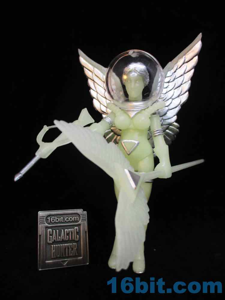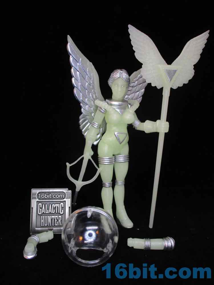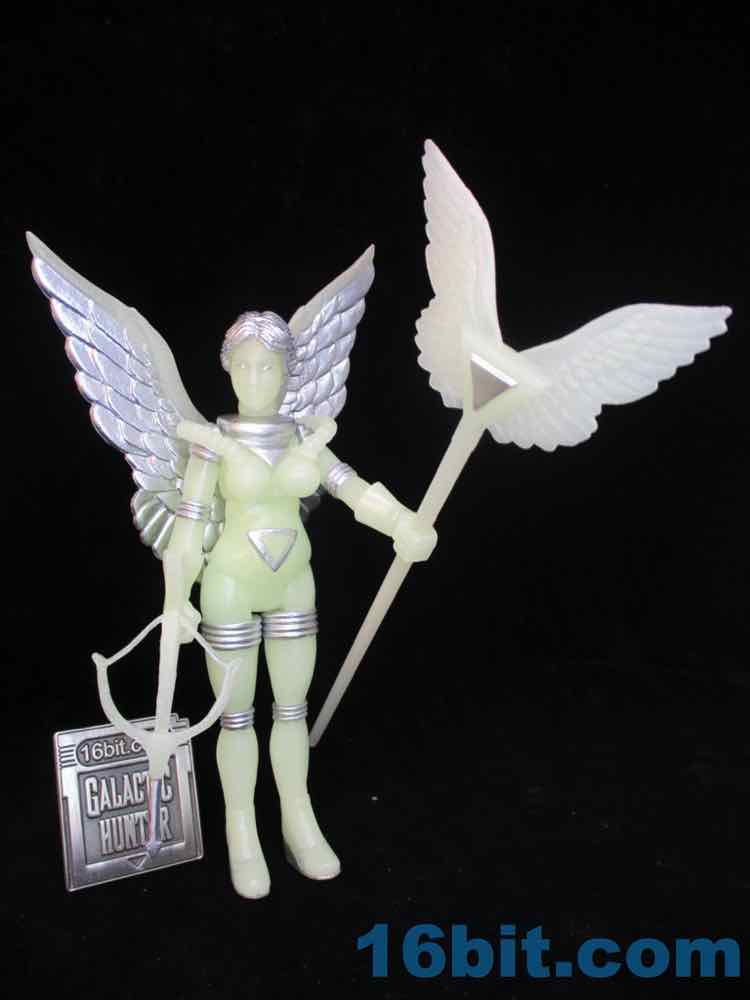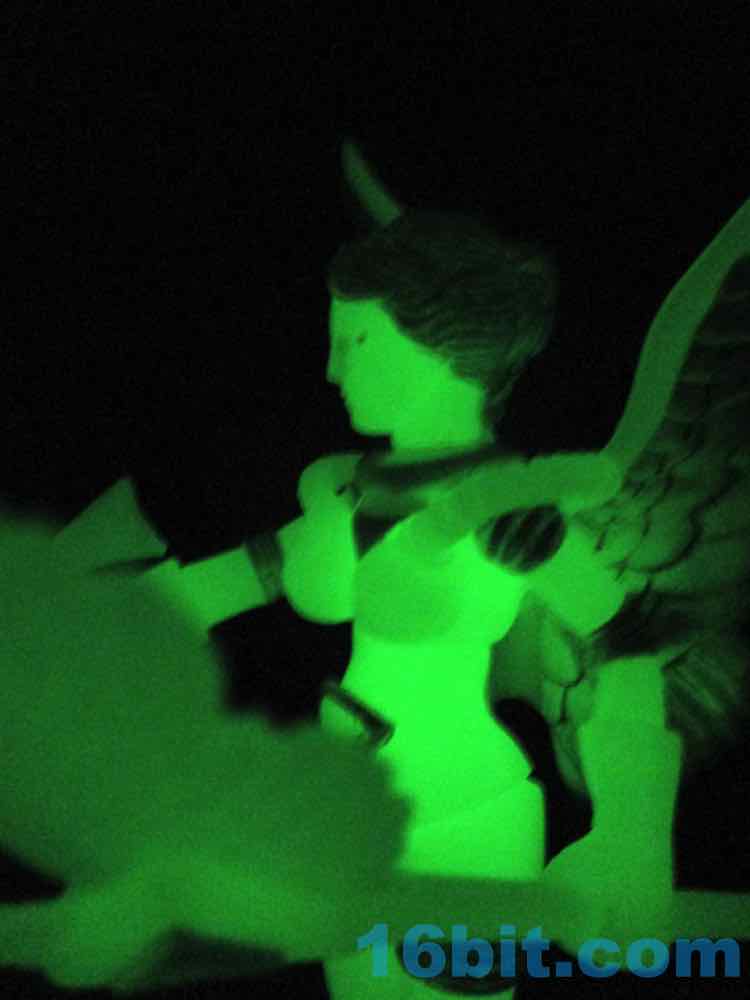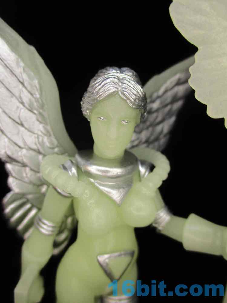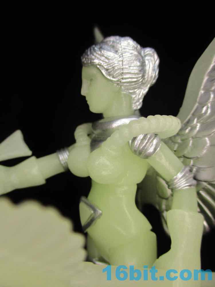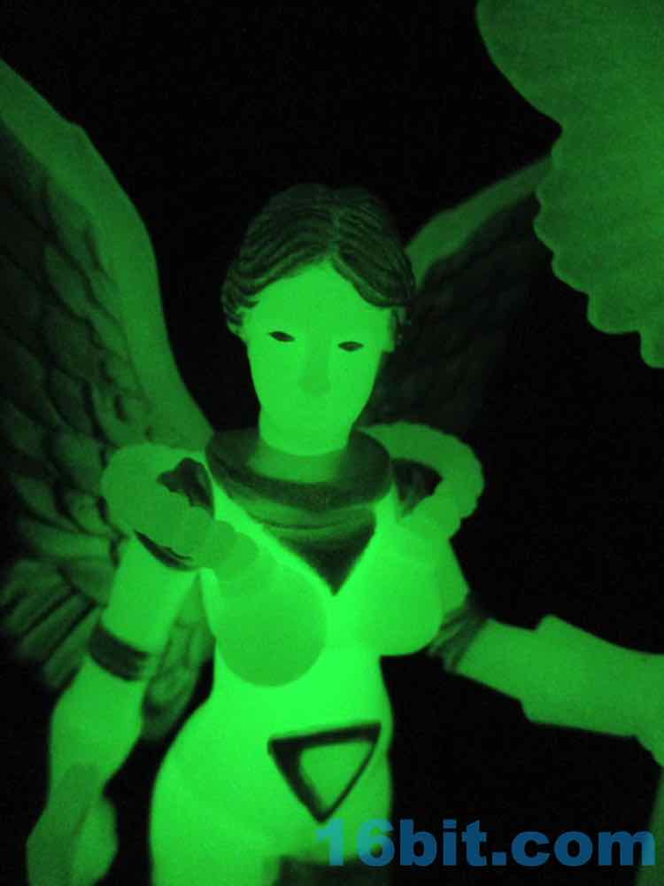 What makes this figure work is a small smattering of silver. If she were all glow, her eyes wouldn't "pop" when she glows, and the triangle on her staff would just fade into the wings. Her silver feathers look spectacular, and the crossbow is just plain glow - can't win 'em all. I like the silver "joint" bands on her arms and legs, and her proportions are consistent with those of Nixon-era men's magazines comic strips. Or so I'm told.