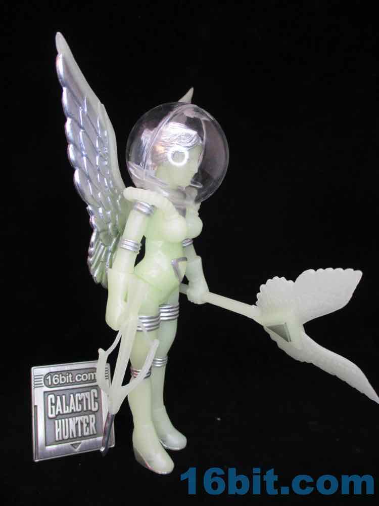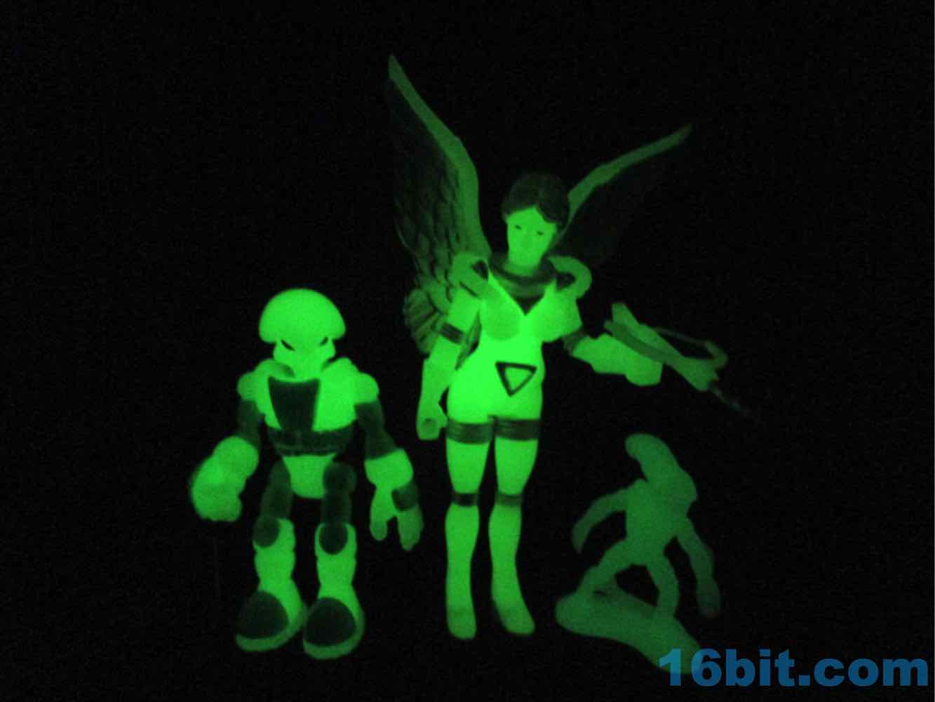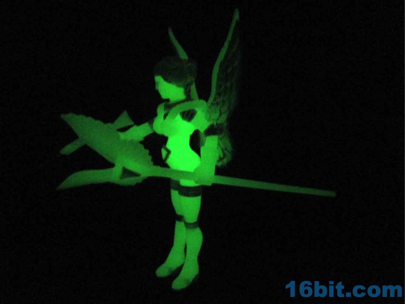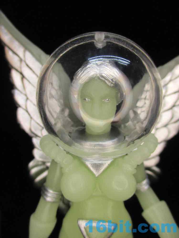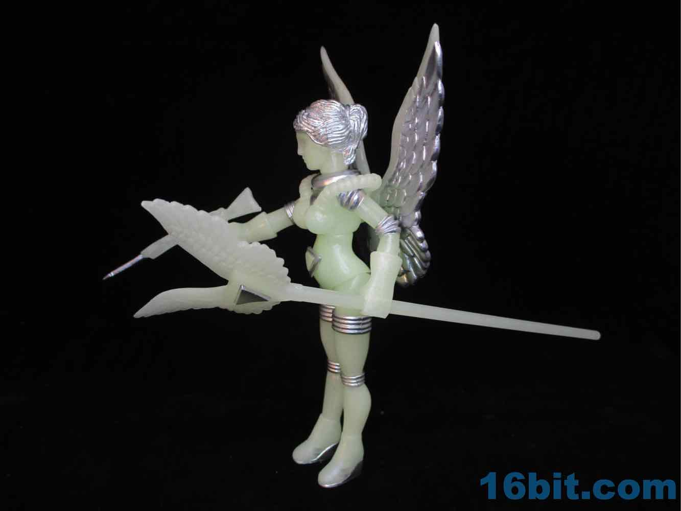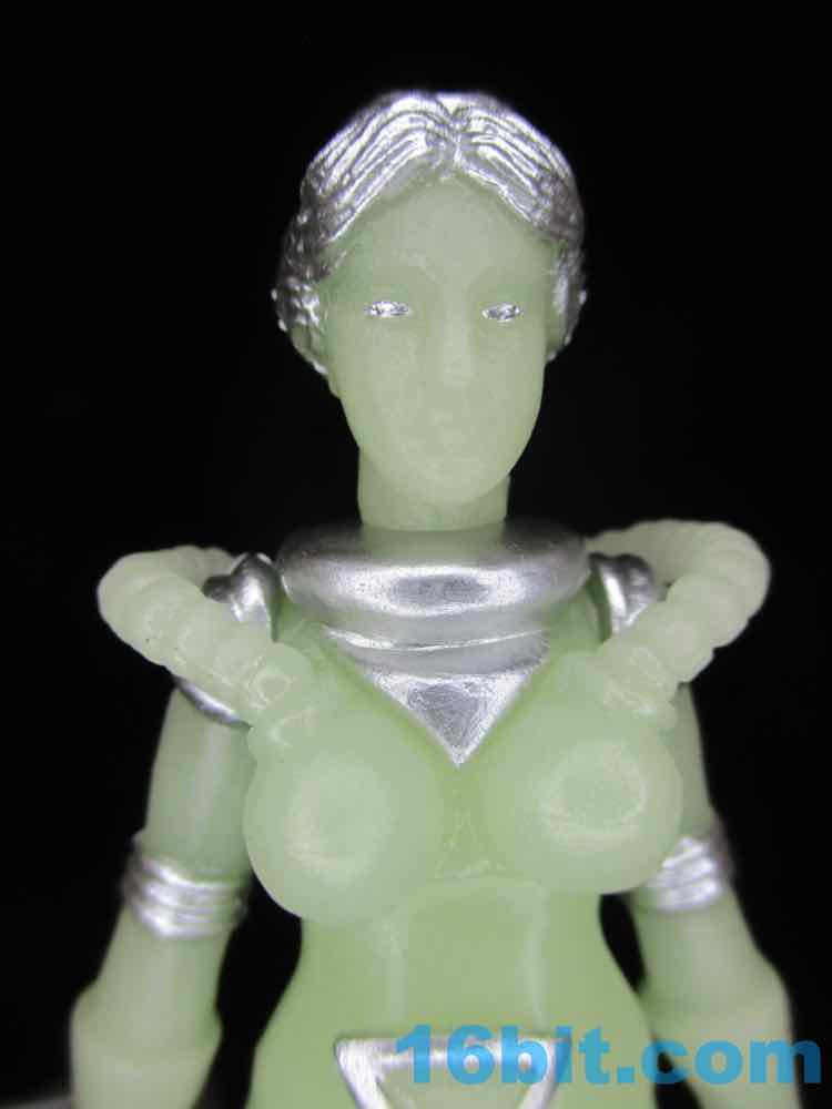 What makes this figure work is a small smattering of silver. If she were all glow, her eyes wouldn't "pop" when she glows, and the triangle on her staff would just fade into the wings. Her silver feathers look spectacular, and the crossbow is just plain glow - can't win 'em all. I like the silver "joint" bands on her arms and legs, and her proportions are consistent with those of Nixon-era men's magazines comic strips. Or so I'm told.