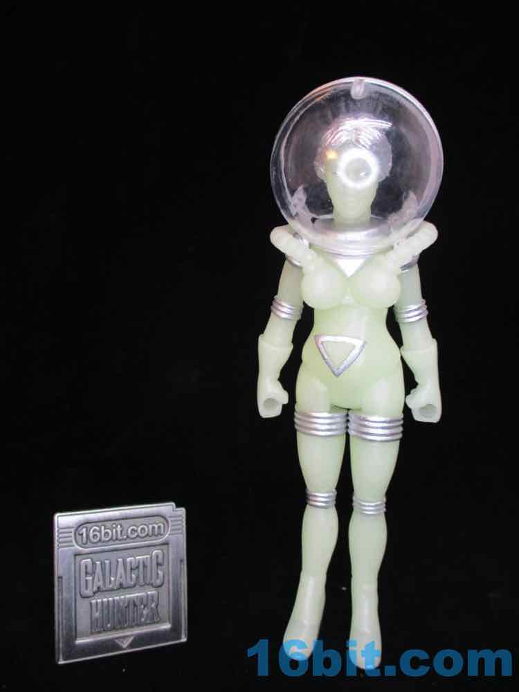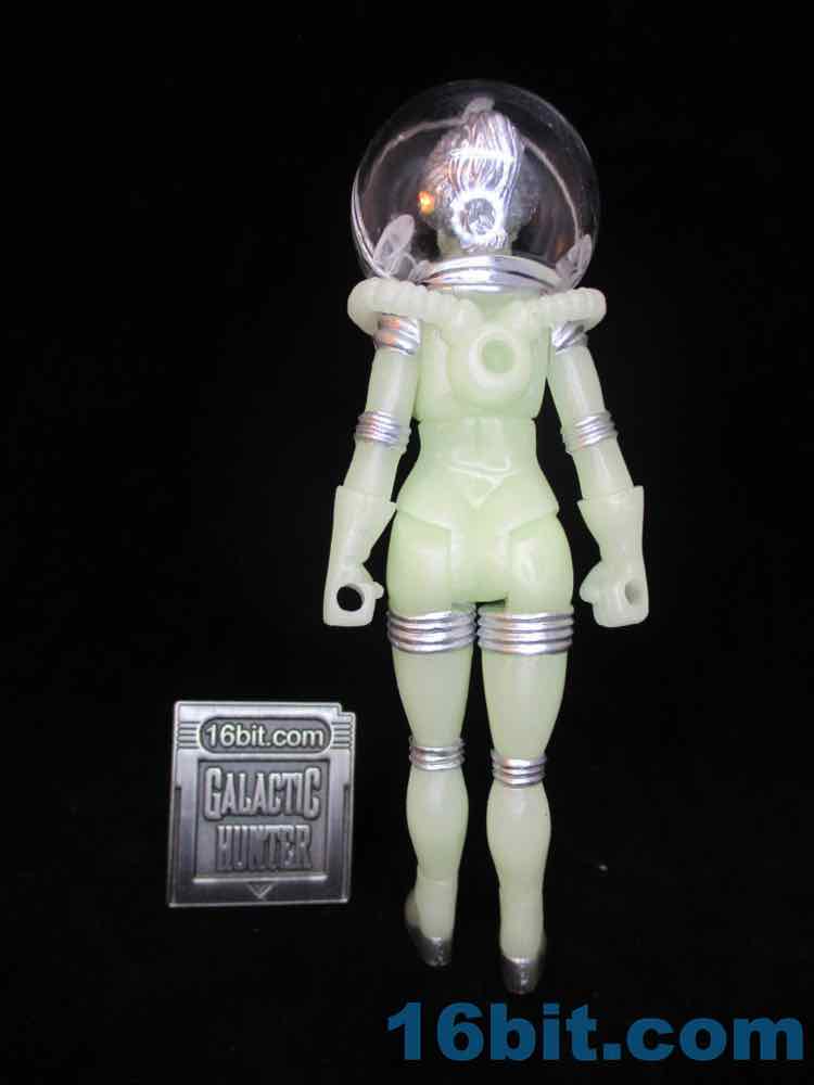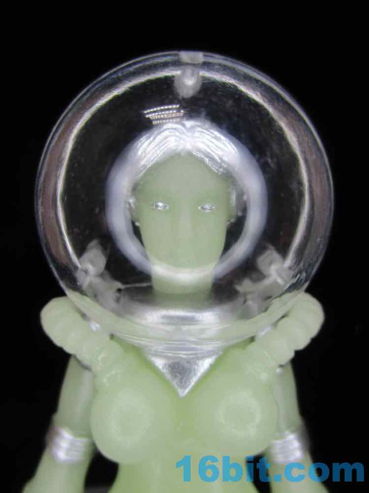 If you've been reading this site, you know that these are some of my favorite figures for collectors. They're more or less compatible with 3 3/4-inch Star Wars, and bring a mid-century era of space race action to toys that was missing in my lifetime. This time around, she's cast in glow plastic with silver highlights and a clear colorless helmet.