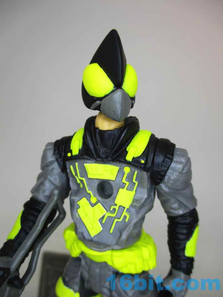 The smashed-in left eye on the default head has a painted eye underneath, plus a fairly strange visible mouth. In flesh colors, it's just odd - but it looks consistent with the first pizza guys. It's still compelling, and if you don't like the idea of a burned pizza slice on his head you can swap it out with the big fin head with massive eyes. With a high crest on top, it looks like some awesome lost Super Sentai design. Maybe it was off-camera on an episode of Kamen Rider nobody ever made. Being Glyos, you can flip it around and it still looks pretty awesome, this time a point on the back flips forward and looks a little like a beak. It could be a coincidence, but I have to assume it's intentional.