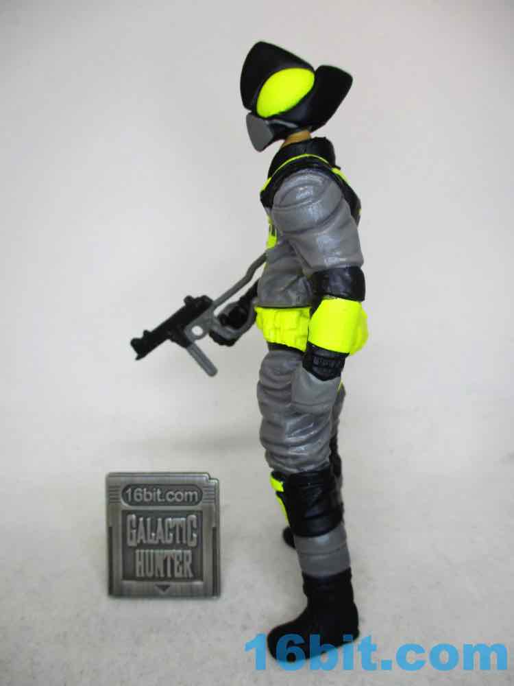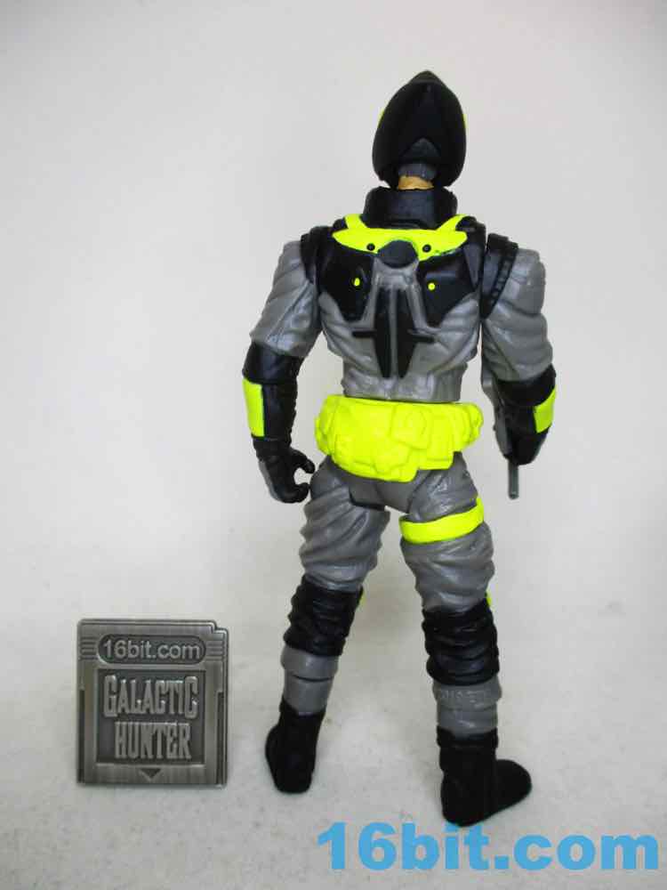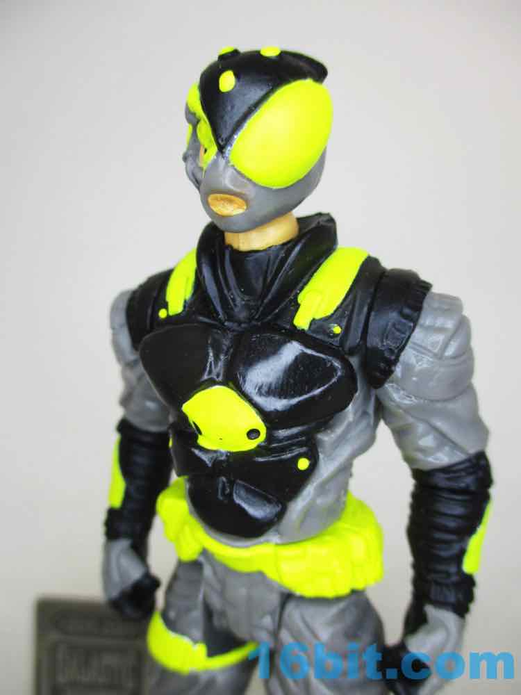 The action figure has a ball joint at the neck and Glyos pegs at the shoulders, waist, wrists, knees, and hips. There's another peg inside the chest armor, so you can pop it off and see the insides if you like. I found it a little tough to pry off at first, but if you do you'll be rewarded with yellow circuits painted in there. There are also little circuits and gizmos under the armor side, but those weren't painted. His utility belt and ornamental pepperoni are just some of hte other things painted yellow, giving you a figure that may say "I am the night!" but also "I don't want to get hit by a car." Safety first, wear bright colors!