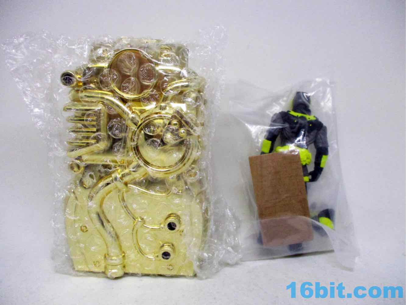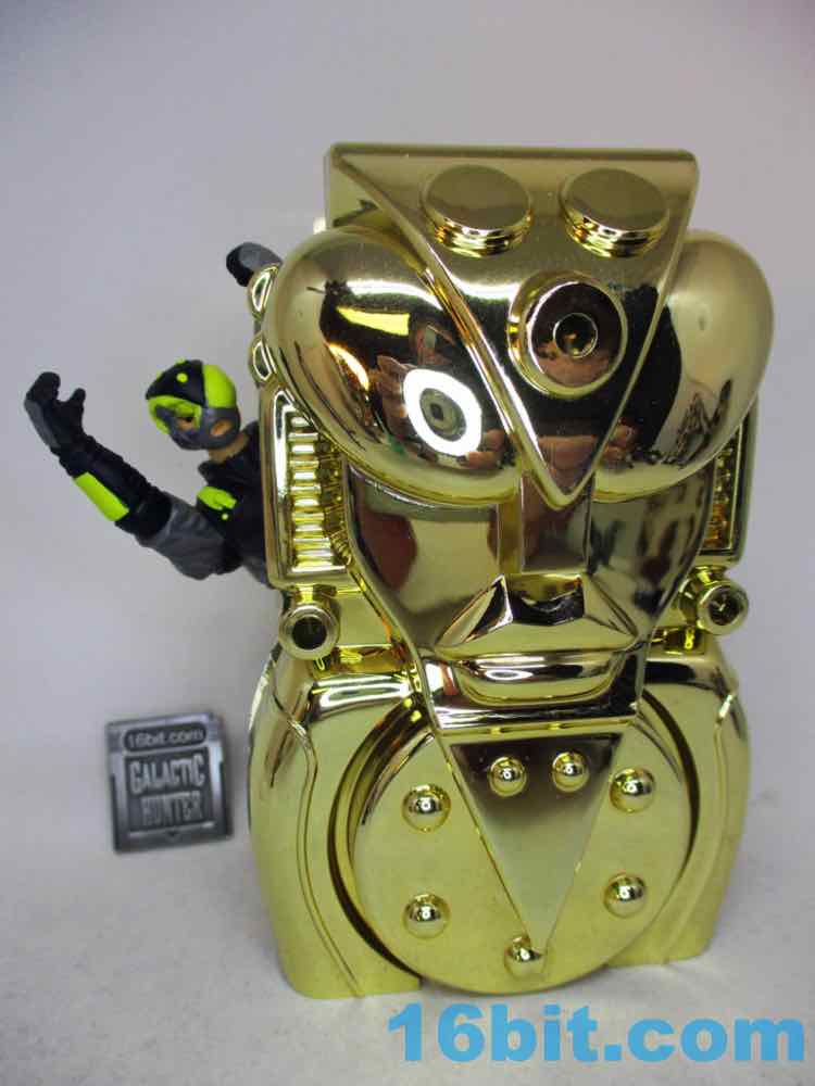 There are many, many cool armored dudes in the Knights of the Slice range. This one is a pretty solid redesign of the Pizza Knight-esque figure, or the Jump Armor upgrade. This time around he's got more sensible pants, a battle-damaged helmet, and a gun. I admit, he looks weird in spots but he's still pretty excellent in Batman colors, while his "carry case" companion is more or less perfect in gold.