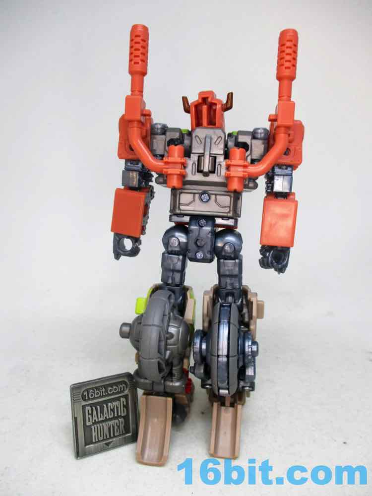 The robot mode is pretty by the book in that you can recognize its familiar elements The head has a nice mustache and soul patch, plus a horned helmet! The chest has little headlights and a nice Autobot symbol. The arms have spikes and so do the feet, with the motorcycle front and back becoming the legs. The arms just sort of tuck in there, and a wheel behind the right leg pops out and can be used as a throwing star or shield weapon.