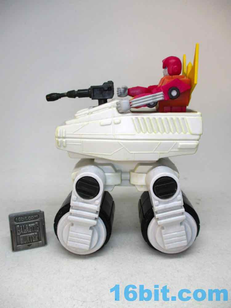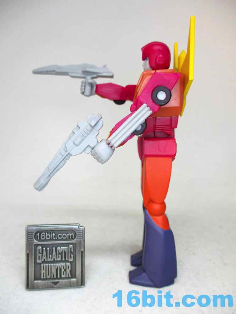 It's not too bulky, and Super7 did a great job making an action figure out of him. The boots aren't too big, so he can still fit in a lot of retro vehicles. The spoiler's not too big, and you get fun little details like wheels on his arms with painted hubcaps. That's pretty awesome and something Hasbro doesn't always give us. The blasters are fully painted and fit in his hands without much fuss. I'd rather the two accessories were molded in color, but I assume they didn't have the budget for multiple molds to do that. It's fun to play with, to pose him and have him point at things without worrying about panels popping open or other weirdness. It's pretty sturdy, but I assume the paint could scrape off if it were ever in the hands of a child.