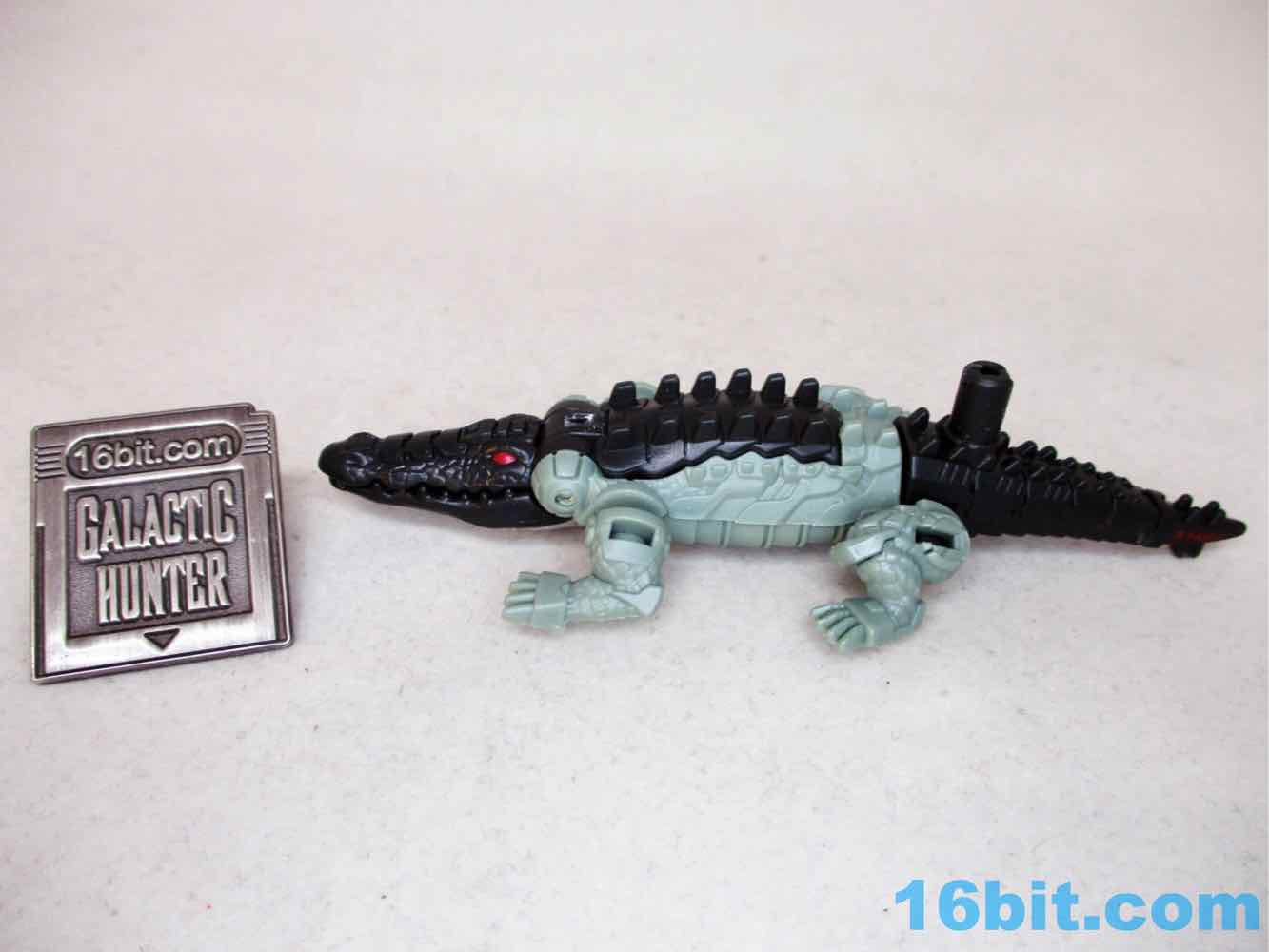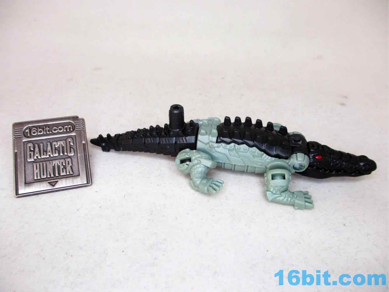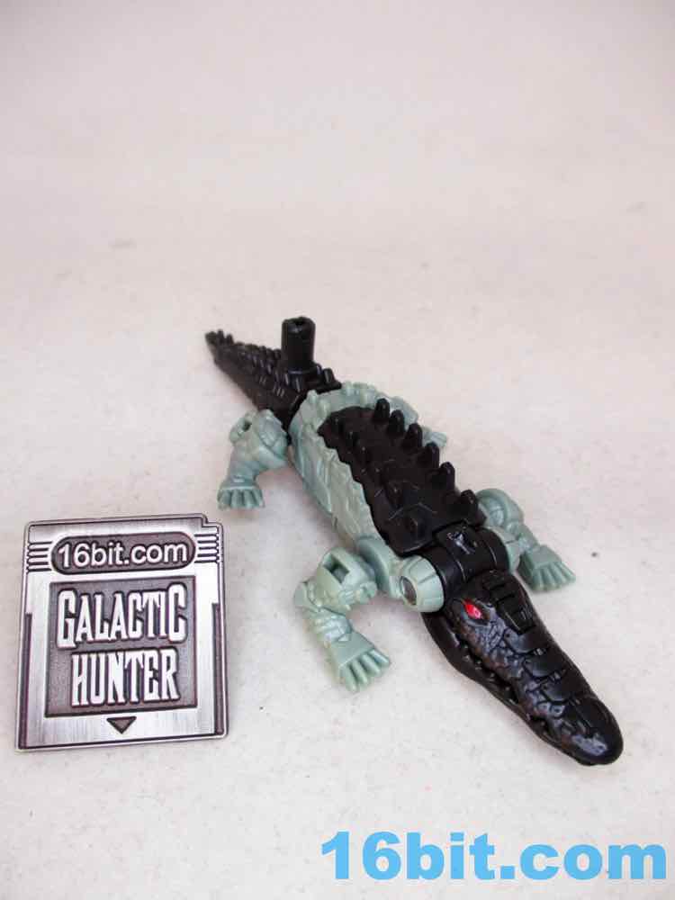 The 4-inch snout-to-tail robotic reptile looks pretty cool with two colors of green plastic with painted red eyes and a silver blaster belly. The detailing is great - some is robotic, some is organic. He has ball-jointed legs and an opening mouth, and the mouth doesn't have a painted interior. The claws aren't painted either. Normally I wouldn't expect anything like that, but, again, $6.99. He's got no blast effects or other parts to plus him up, either, but at least he looks really cool.