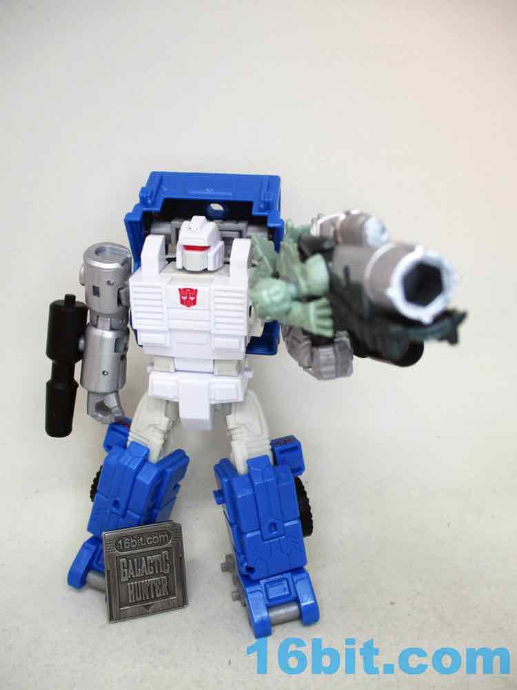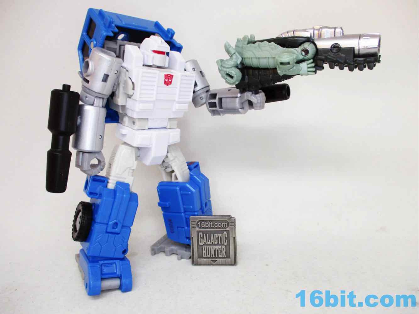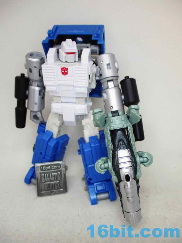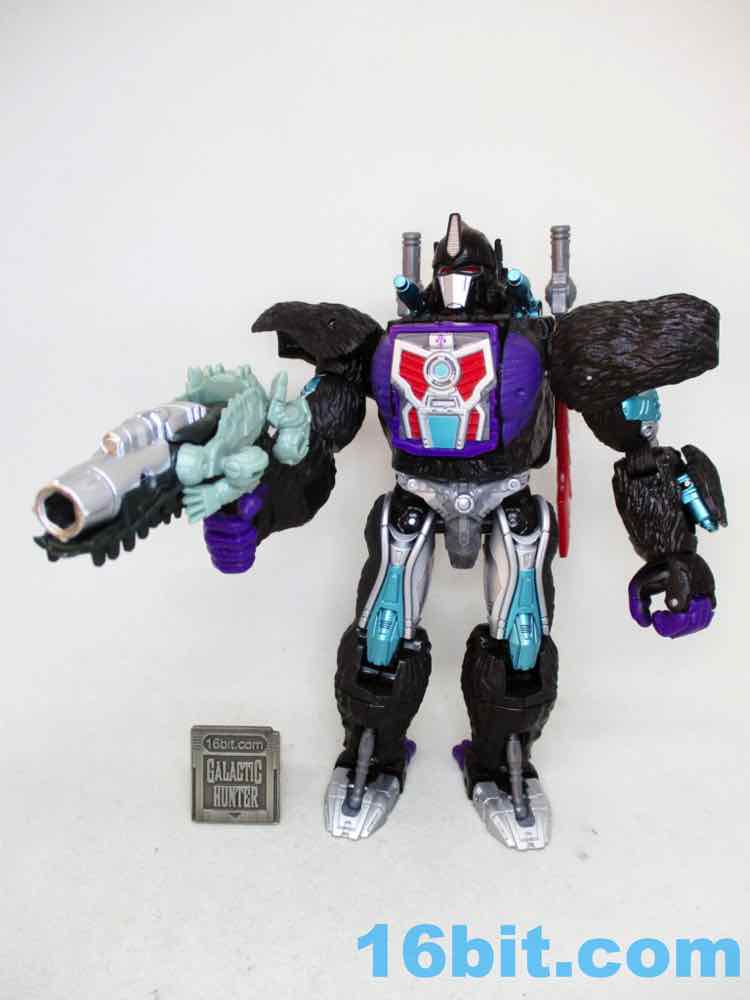 If it weren't for the thick, clean silver paint on the barrel I'd say this figure was a tremendous waste of resources. As it is, it's pretty good - it looked OK with a variety of figures, but it really sings with Nemesis Primal. The silver pops, the light green looks good, and there's enough blaster detail here that it looks like more than a gator with a grip on him. You can even plug in your War for Cybertron blast effects in there, but be careful to not store them in there. The gummy clear plastic has reacted poorly with other painted accessories and molted off.