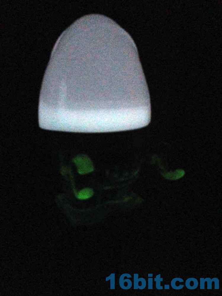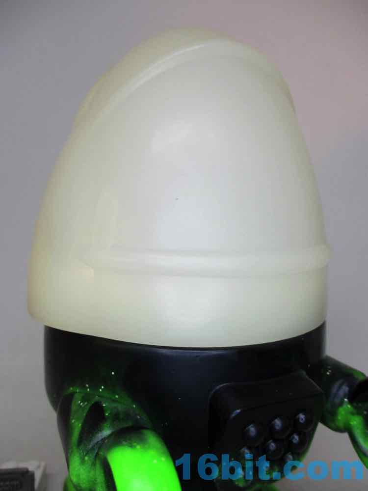 The design type should look familiar, as a ton of wind-up robots and movie robots dating back decades have these big bodies with claw hands and a big head. The head is molded in glow-in-the-dark plastic, which does a pretty good job of showing sculpted detail but does not photograph well in the dark. It's low and slow, and weirdly kind of white - it's spooky, I like it. Some greens are really bright, but the green plastic swirled into the black vinyl body shines a little bit brighter in person and both look pretty good. Neither showed up on camera particularly well.