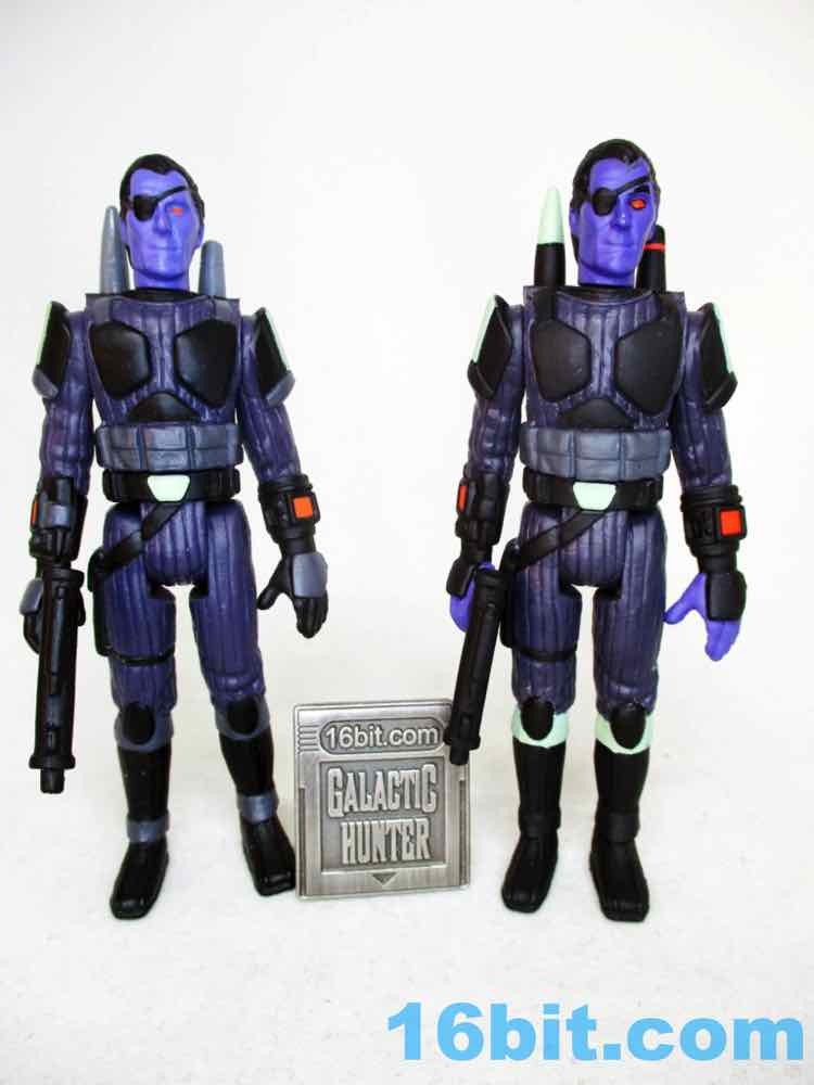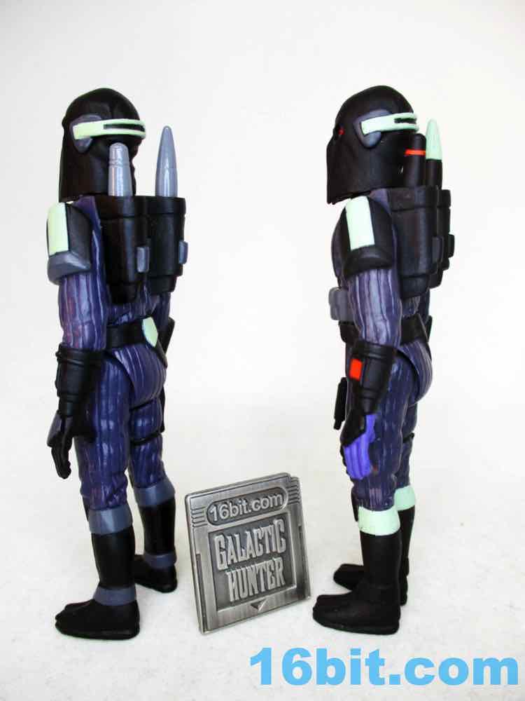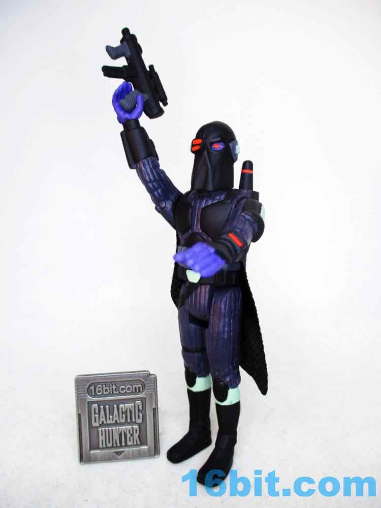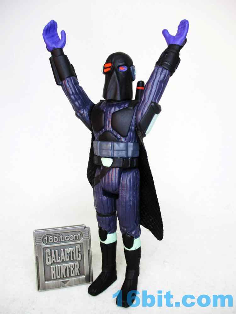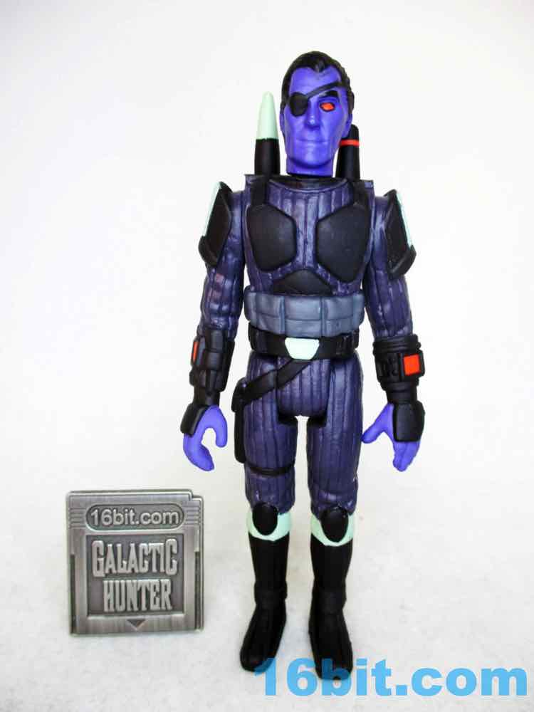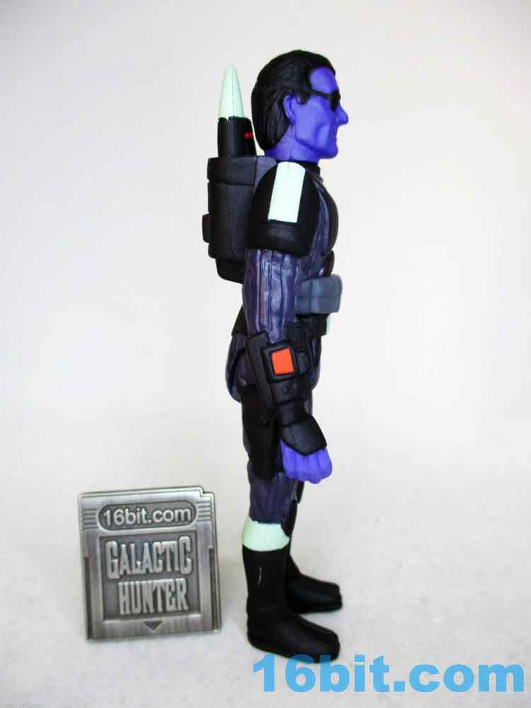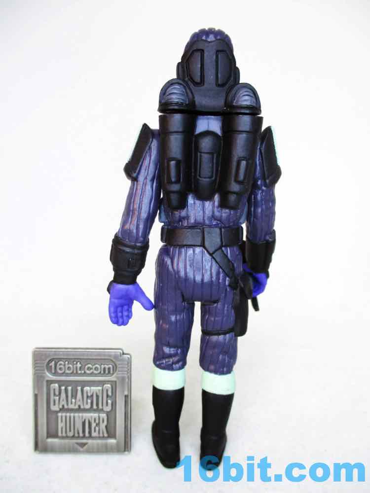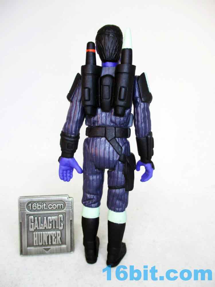 You can see a lot of Kenner-like details on this one, just like the other releases. The pants have deep lines in them like Darth Vader. The general vibe of the figure is Cobra Commander meets Boba Fett meets Peter Cushing, with some mutations - you can see what looks like a button to activate non-firing rocket launchers. If Kenner kept making toys in this style without the Star Wars license, figures like this seem like what we would have seen by the end of the 1980s. It fits perfectly in old Kenner vehicles for Star Wars toys, but the Raider was tooled without foot pegs. He won't be hanging out on display stands or playsets, but he seems to stand well without assistance.