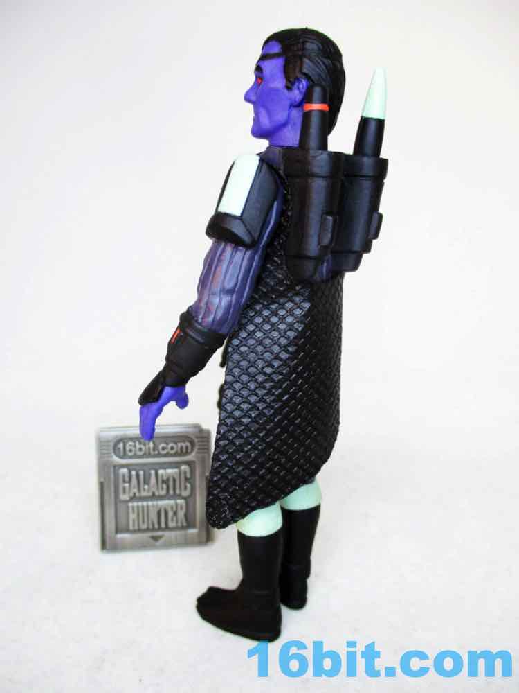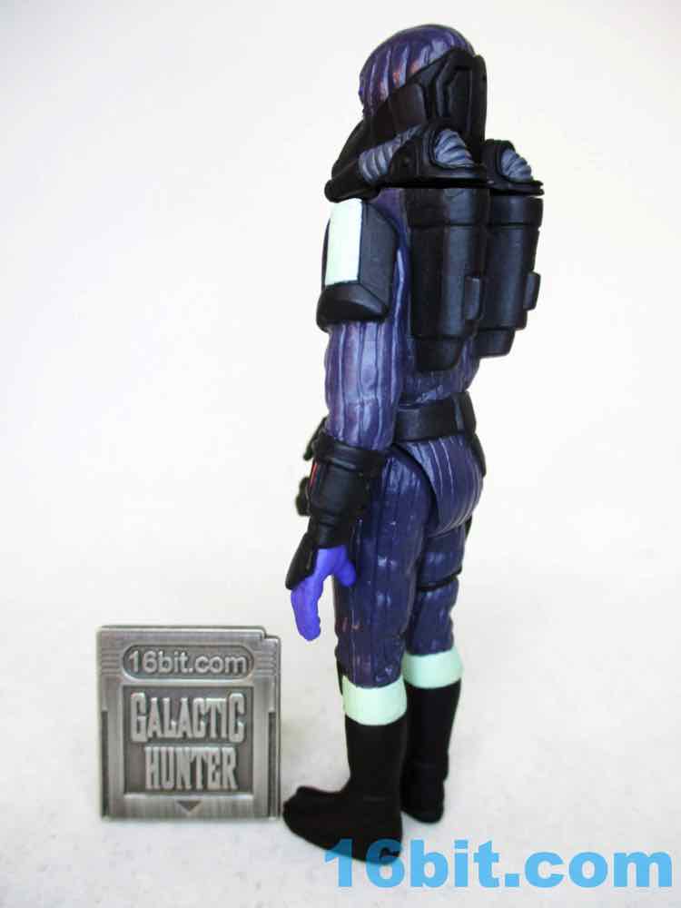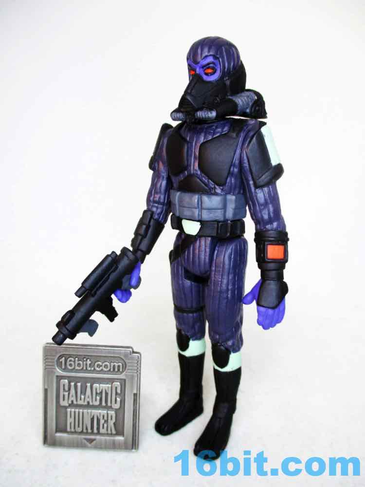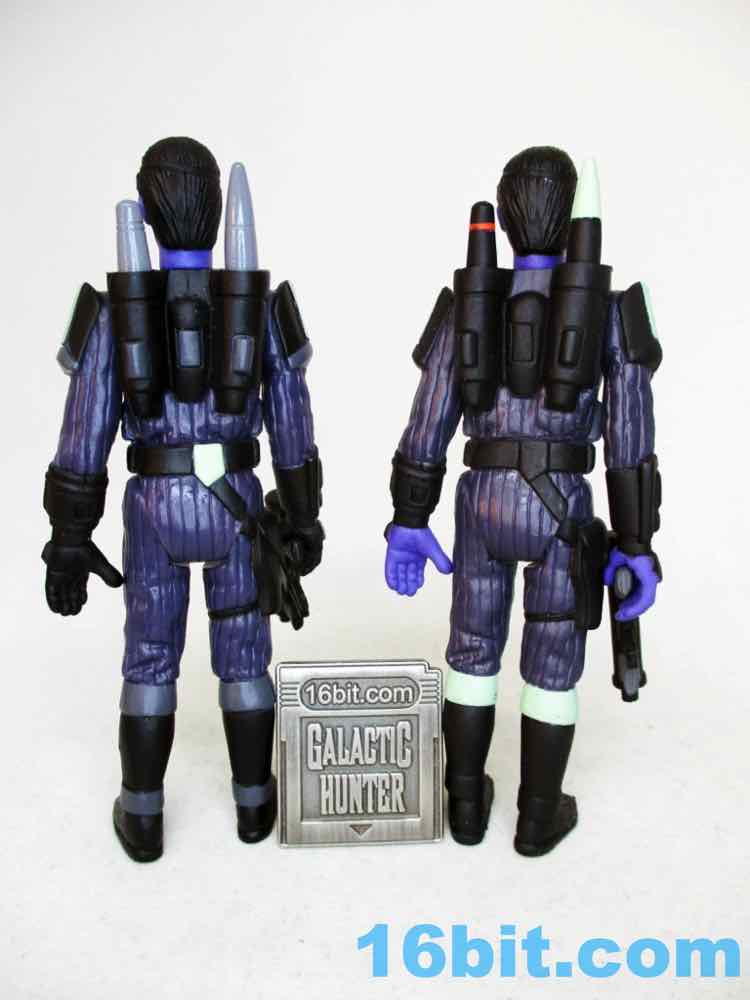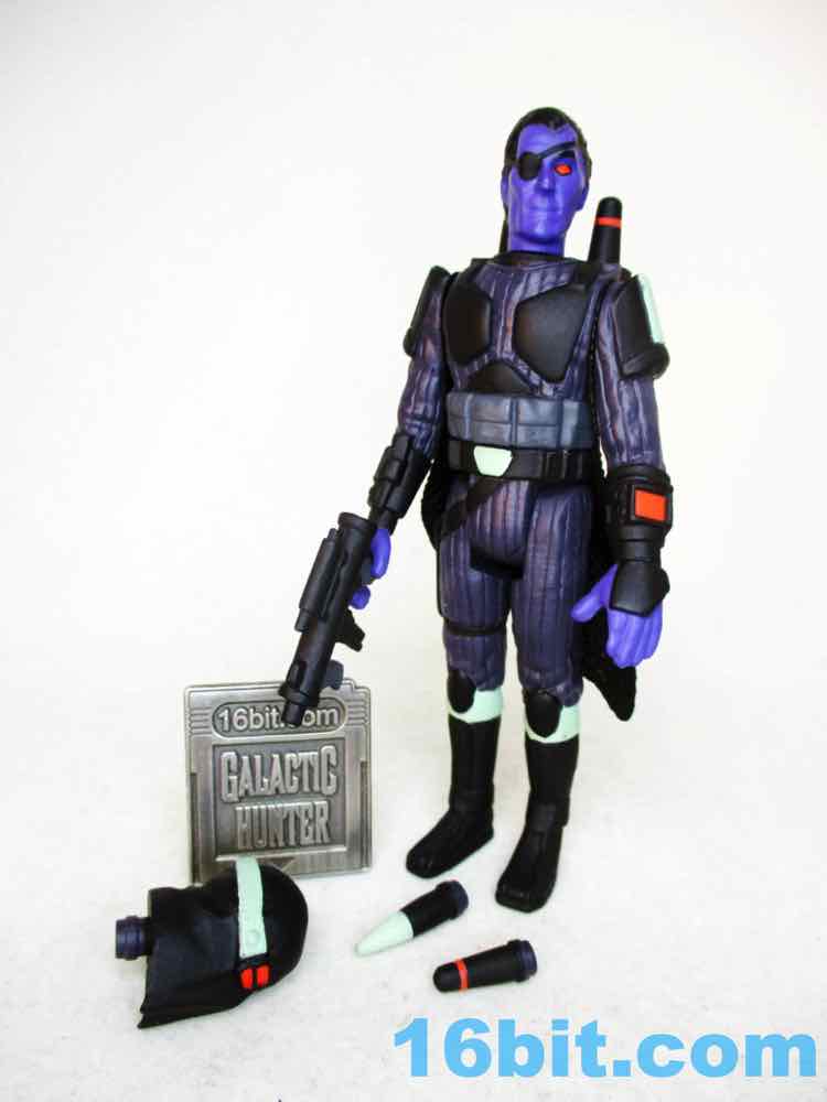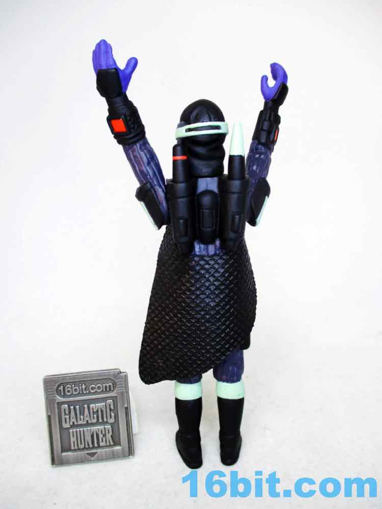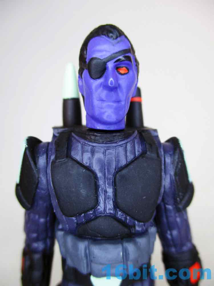 You can see a lot of Kenner-like details on this one, just like the other releases. The pants have deep lines in them like Darth Vader. The general vibe of the figure is Cobra Commander meets Boba Fett meets Peter Cushing, with some mutations - you can see what looks like a button to activate non-firing rocket launchers. If Kenner kept making toys in this style without the Star Wars license, figures like this seem like what we would have seen by the end of the 1980s. It fits perfectly in old Kenner vehicles for Star Wars toys, but the Raider was tooled without foot pegs. He won't be hanging out on display stands or playsets, but he seems to stand well without assistance.