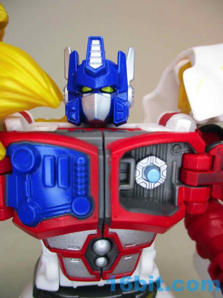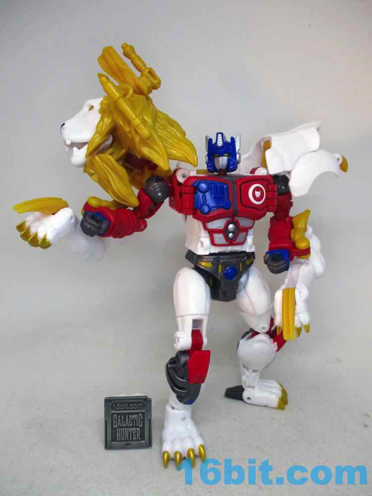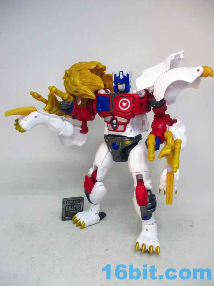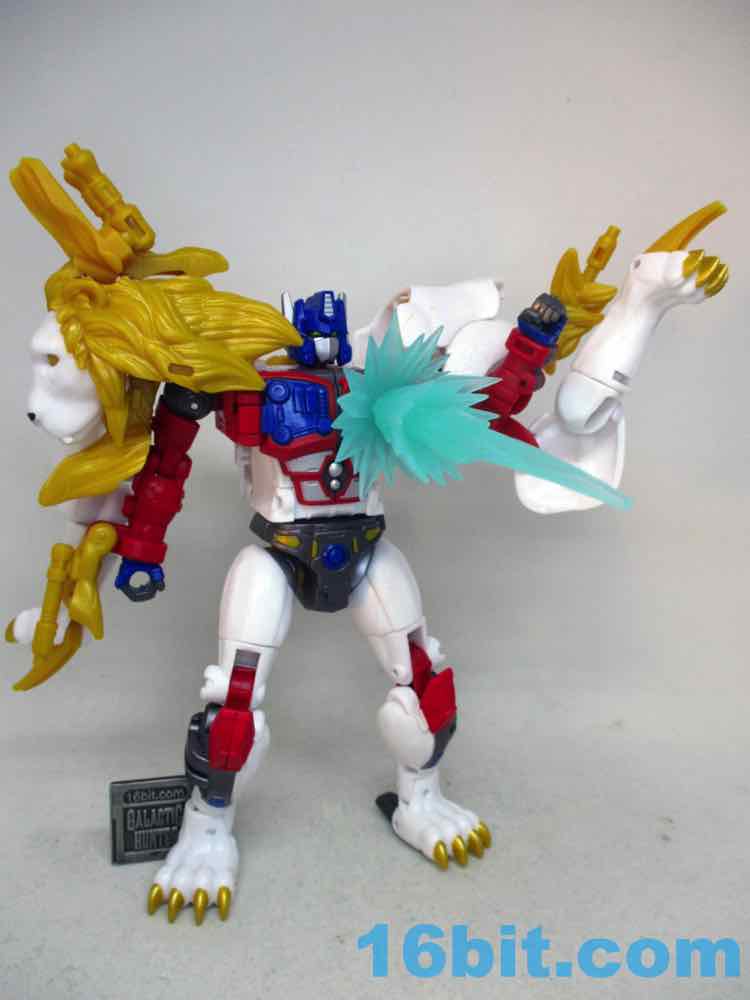 The 6-inch robot mode is pretty great. There's a lot of articulation in there - no wrists, sadly - but the joints are pretty sturdy and you get rocker ankles. You can pop open the Maximal logo on the chest to reveal a painted area where the Matrix lives, and you can connect C.O.M.B.A.T. blasts if you have any handy. He has no problems holding or using his accessories, and he stands like a champ. If he didn't transform, I'd say he's a pretty good toy for the price. It's of comparable quality to a lot of the 6-inch humanoid figures you can guy these days, except this one looks like a cartoon Optimus Prime lion with fuzzy slippers and flip-out claws that live in cat paws that hang off the back of his robot arms. You don't see those every day.