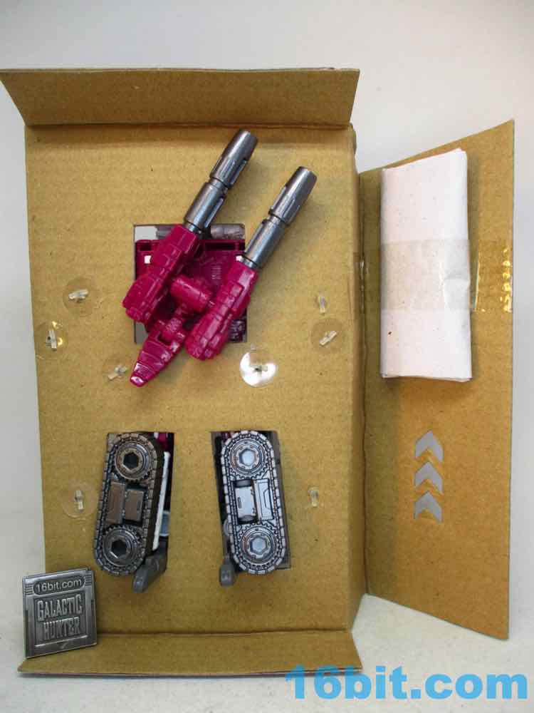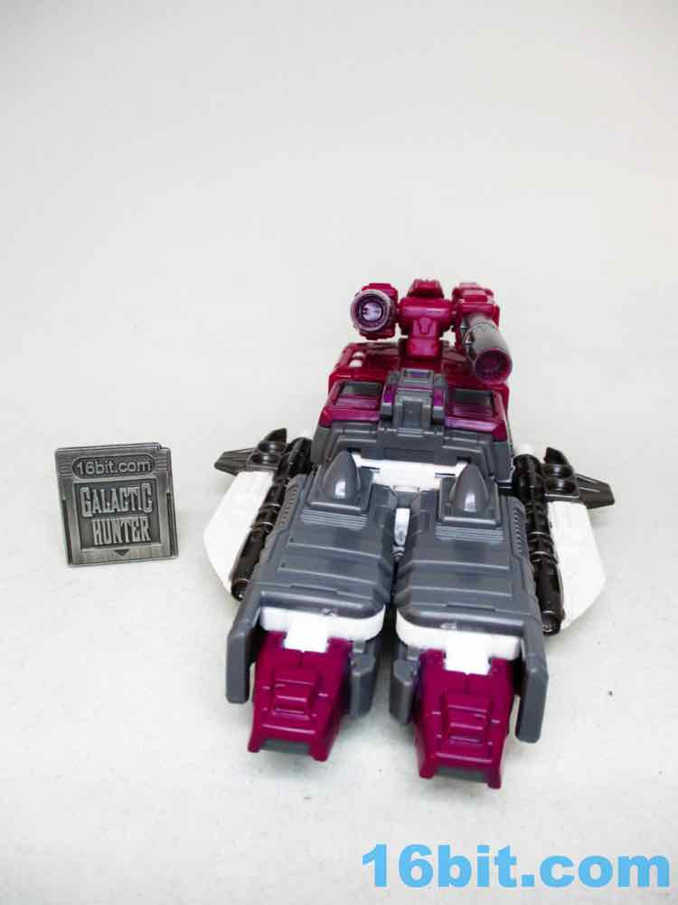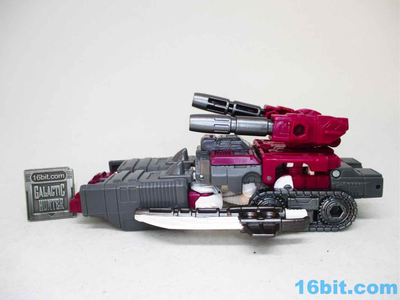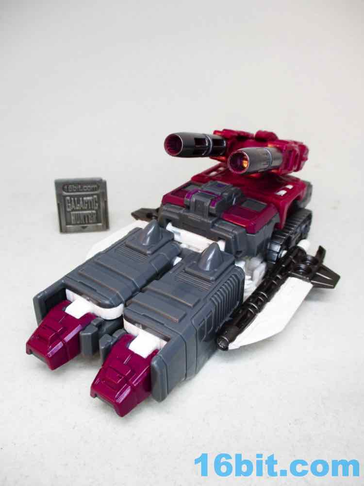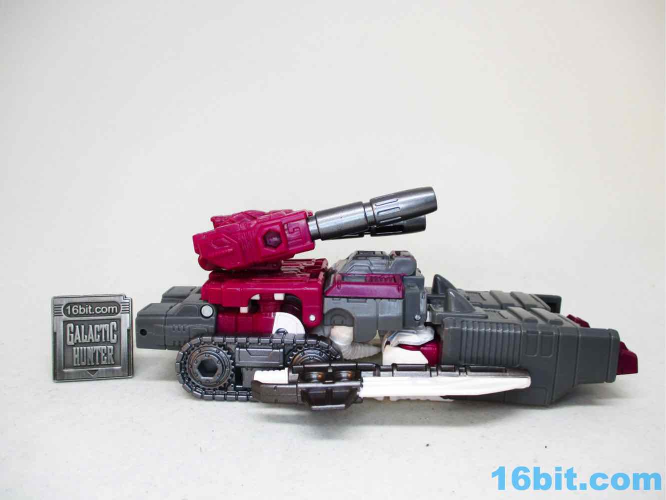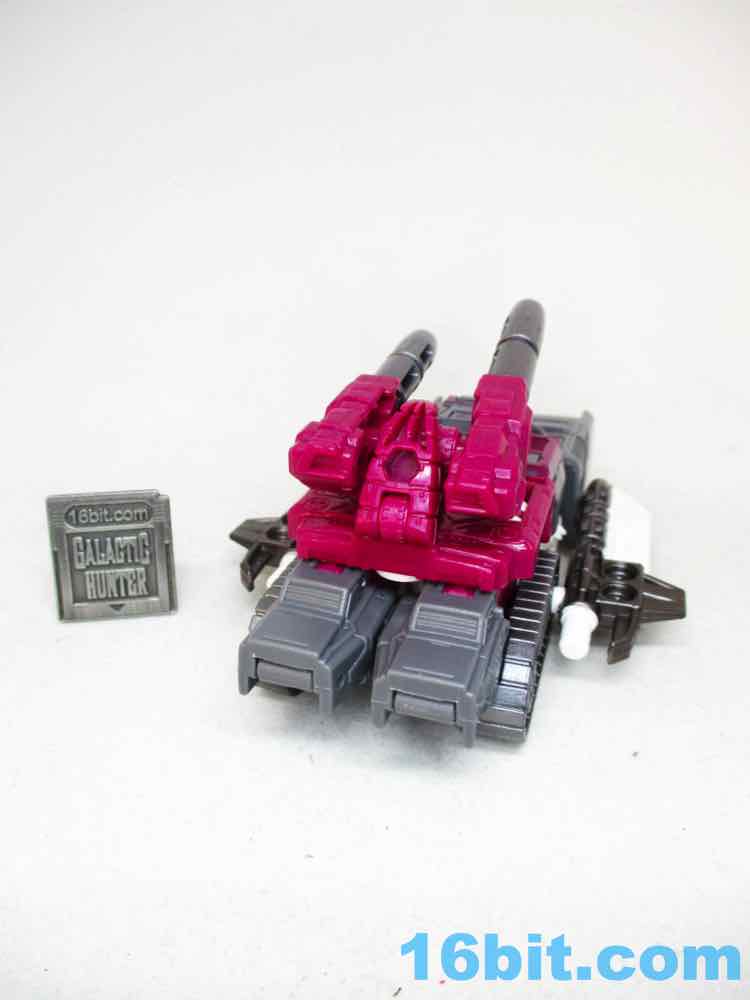 The vehicle mode is bigger than the original, with the legs jutting out forward and giving him a totally different silhouette. As stated above I do not recommend stowing the blade weapons or any weapons in the tank treads since I experienced some paint coming off, but you do you. Who am I to stop you from making a mistake? The designers did a good job, but that pairing of paint and plastic make it hard to be excited. Any time you pick up a toy and need some sort of "well be careful because playing with it as intended may cause problems" really irks me and puts me off buying more of this kind of stuff, which I admit is funny given how many I've reviewed. But hey, times change - if something's not great, you don't have to keep going. The vehicle has no working wheels, but the turret on top turns and I like that a lot. I would not recommend putting anything in those tank barrels either, as that paint looks like it might be similar to what was used on the treads. At least the sculpting is good, and a repaint of this toy might give you fewer problems.