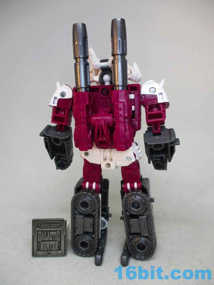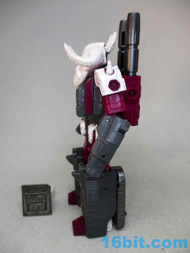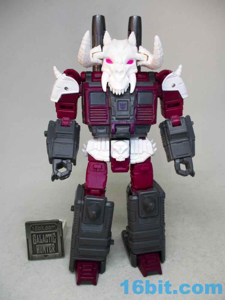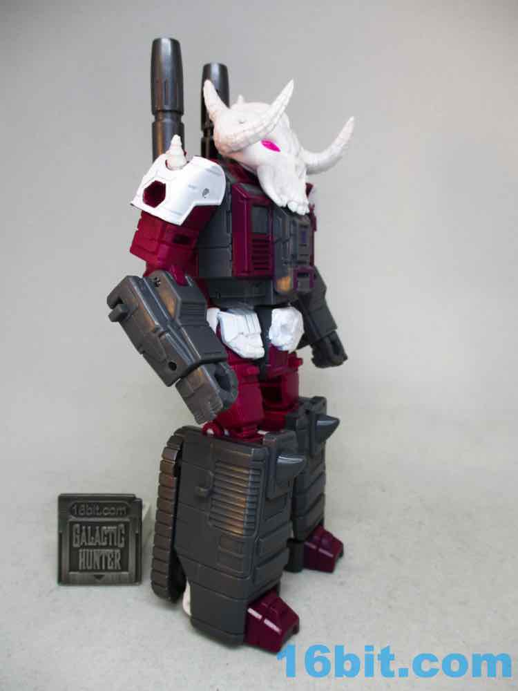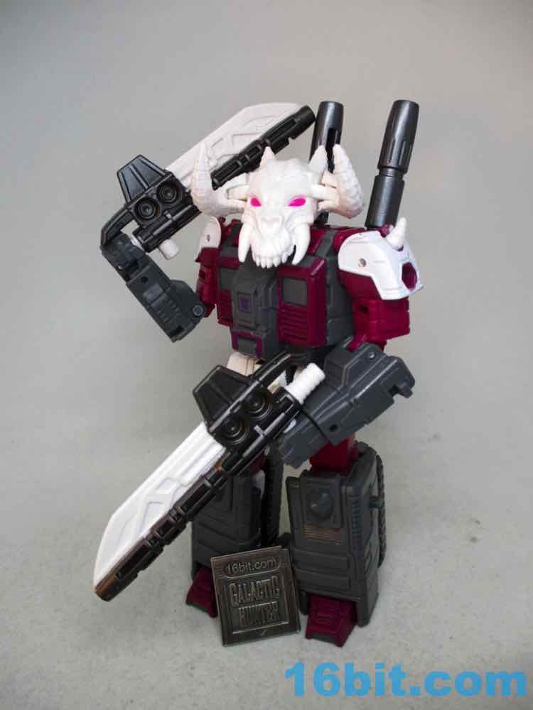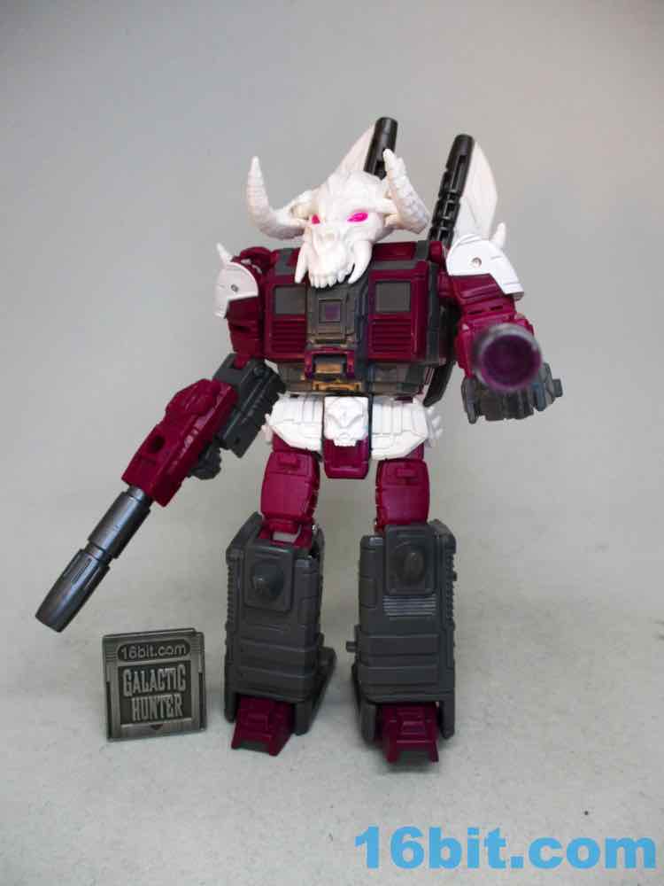The robot mode is a similar to the original robot mode, with the head, shoulders, and belt of the Pretender monster. You don't get his jaw, but you do get a nice new joint with a hinge so he can look up as well as swivel around. That's pretty nice. The skull belt looks cool, and you get four accessories to go with him. The head as the most detail, and it's on some pretty soft plastic that just doesn't feel particularly good. The joints to tuck the horns in for transformation are visible and kind of ugly, and in the era of the $25 deluxe the bar to disappointment is a little lower. When deluxes were simpler and at $10, it was easier to have lower standards and get excited for things that, as a $20 Voyager, might be eye-rolling. Heck, even back in the 1990s and 2000s, a lot of reviewers criticized the toys of not being worth it given some of the gimmicks were kind of uninteresting or the toy being not any better than the lower price points. That's sort of how I feel about Skullgrin. He's got rocker ankles, and his horns get knocked sideways if you ever touch them. And this is twice the price of the 2010 Deluxe Skullgrin [FOTD #117] which lacked some bells and whistles, but also, it was cheap. And I can forgive a lot at a lower price point, Skullgrin just doesn't bring any real sense of delight once you really start digging in with what he has to offer.