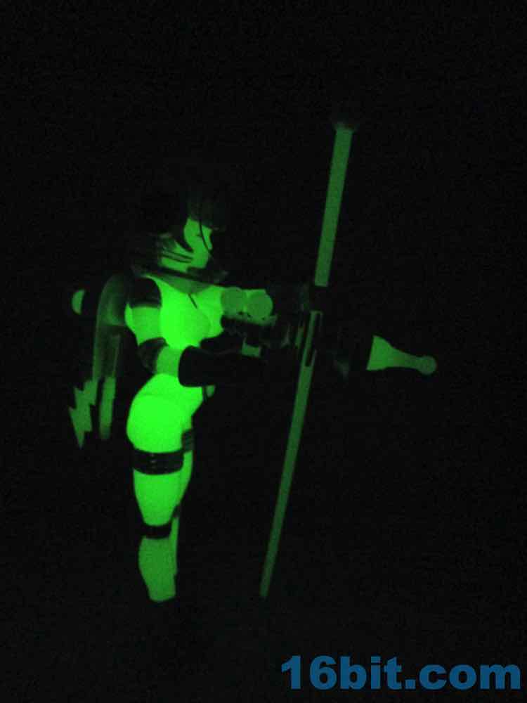 The 3 3/4-inch figure has some issues standing thanks to her narrow stance, but that's why she has a pole accessory to prop her up. I'd recommend leaning her against something for safety. Her clear colorless helmet lets the glow shine right through, and that Glyos glow PVC plastic is always spetacular. She keeps the same sculpt as her space siblings, and you can order a matching Luna Eclipse figure that keeps more or less the same paint masks except for her blaster accessory. I still need to open and review her, and I admit, I feel pretty bad that it took five years to crack them open. Even though they're all very much alike, it's hard to poo-poo glow figures and one thing they did that really made them shine is to add this great silver paint. In particular, Terra's hair looks absolutely incredible because the Four Horsemen sculpted some incredible strands of hair with amazing parts that normally look pretty good, but for some reason, the silver looks magical. It wouldn't be cost-effective, but I'd be curious to see some figures completely slathered in this silver paint. I assume it would show an incredible amount of detail.