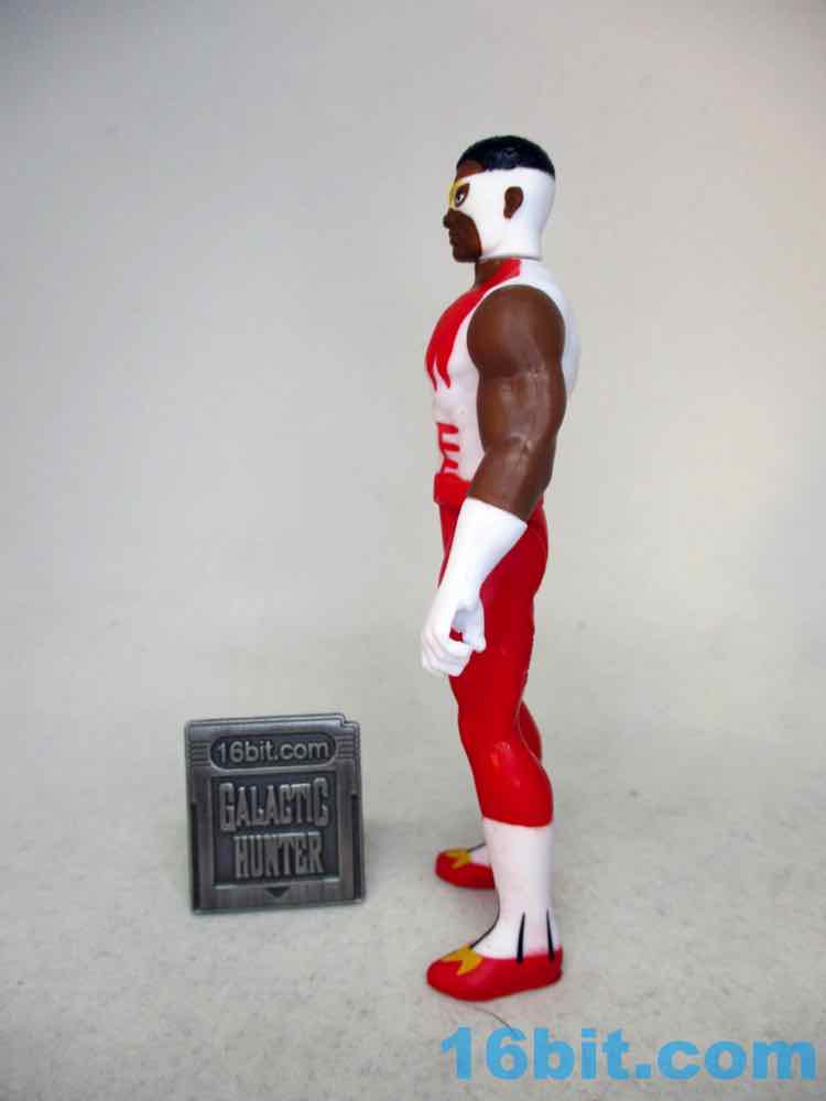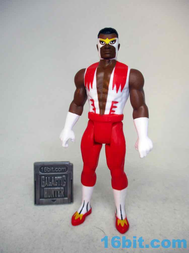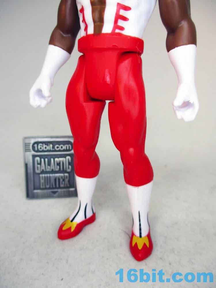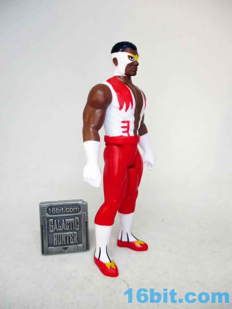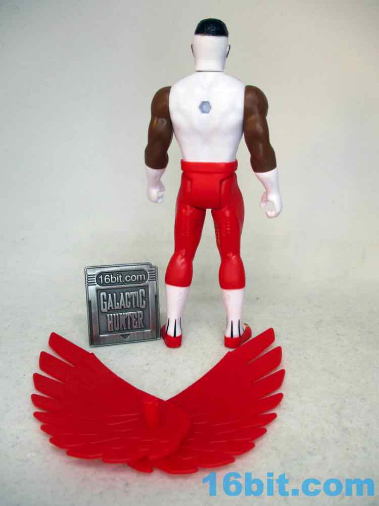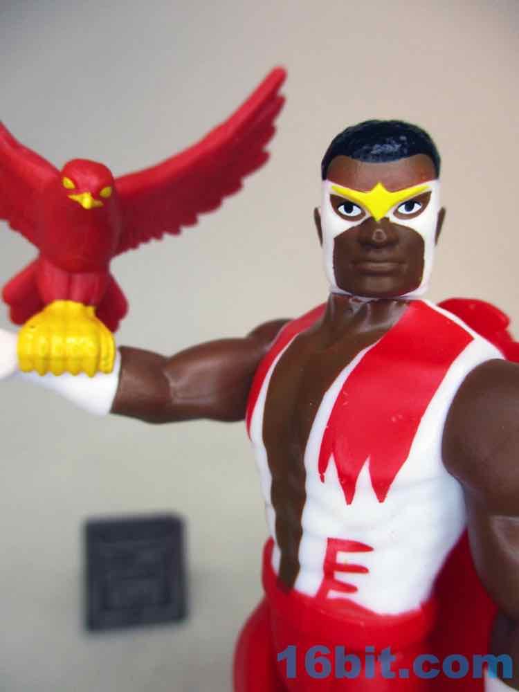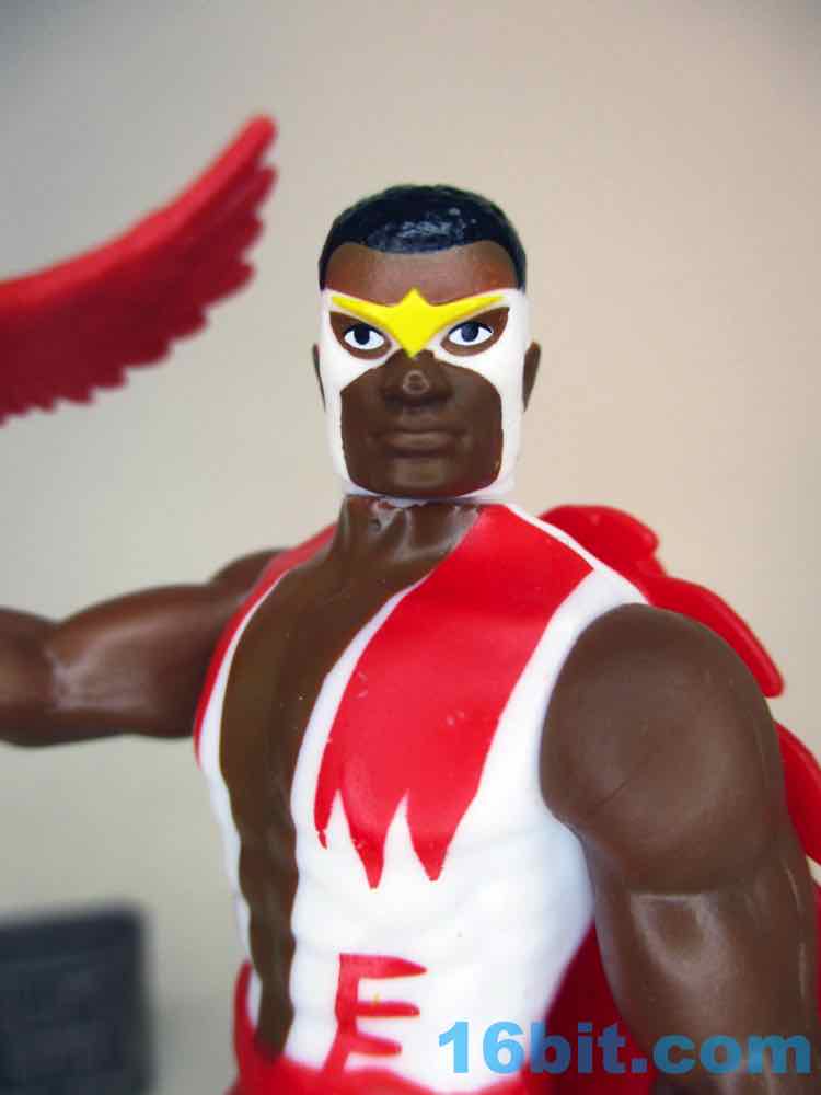 The new head sculpt is good with a costume that's translated about as well as it could be to this body type on a minimal budget. In the comics, you can see Falcon's boots have some fringe on them, plus talon-like markings on the feet. Here, the basic forms are replicated on his shoes but they look a bit more like fancy slippers, and the white on his boots look less like feathery feet fringe than they do odd socks. It's a good translation of the costume when all they had were pennies in the budget for paint rather than newly-tooled feet, but I have to admit they do look a little silly. The vest is painted-on and mostly looks pretty good - the red doesn't extend over the shoulders to the figure's back, and I also think Kenner would have painted it back in the old days. The enhanced f-like adornments look good, as do the figure's white gloves. It's close. The head is also pretty excellent, with nicely textured hair, a mask, and a bird crest between his eyes that looks like it misses the mark just a tiny bit. As anyone who had Kenner toys in the 1970s and 1980s can tell you, "close but wrong" is on-point for Kenner accuracy - if it were perfect, it'd feel wrong.
