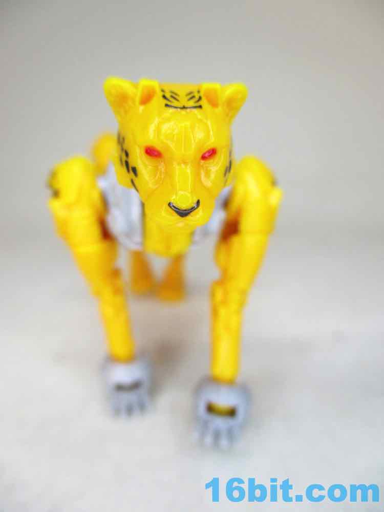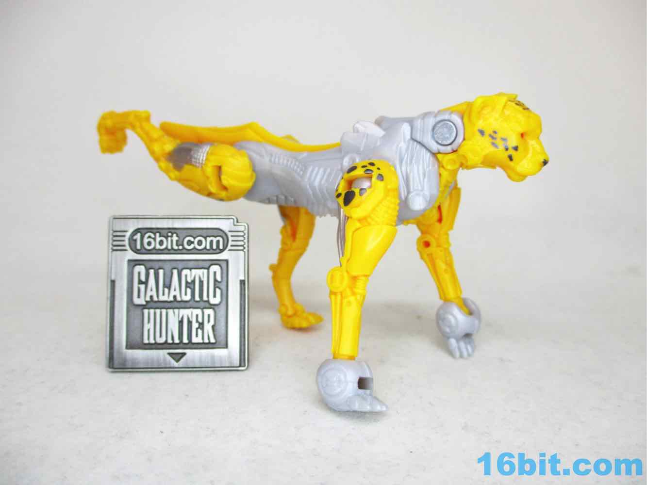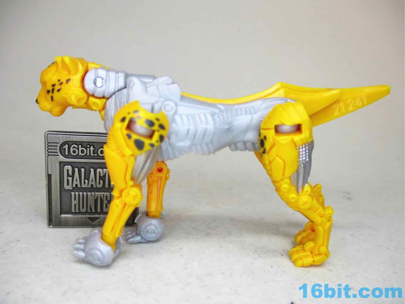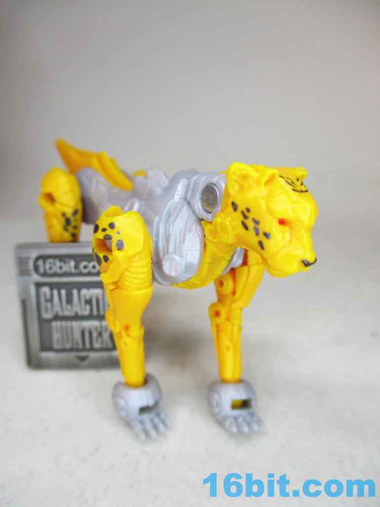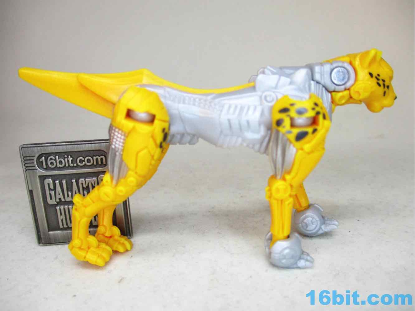 The 3-inch long cheetah is actually not a bad toy idea. He's a cyborg, so he has silver front paws, a metal torso, and silver wiry painted bits on his legs. The eyes are red - just like the original first release of Beast Wars Cheetor back in 1996! He has a few painted spots, but is mostly molded in color. It's a pretty good cat toy with articulated legs and front paws. I assume the paws are only a result of space on the tooling, but it gives the figure a distinctive look and breaks up what may have otherwise been too dang much yellow. You can't get too many poses out of him, but I found enough to be interesting here.