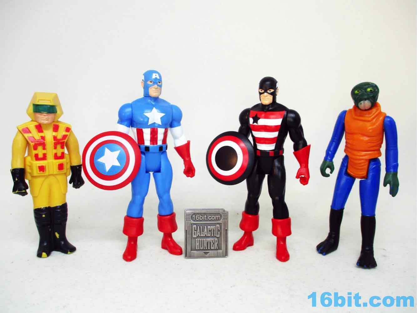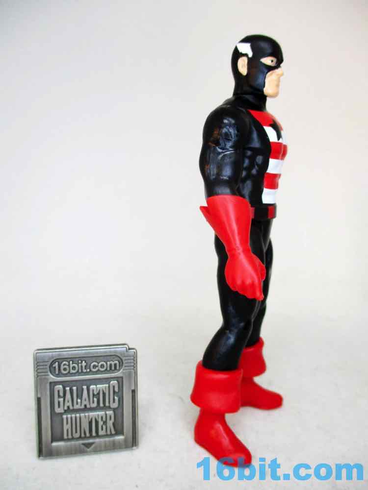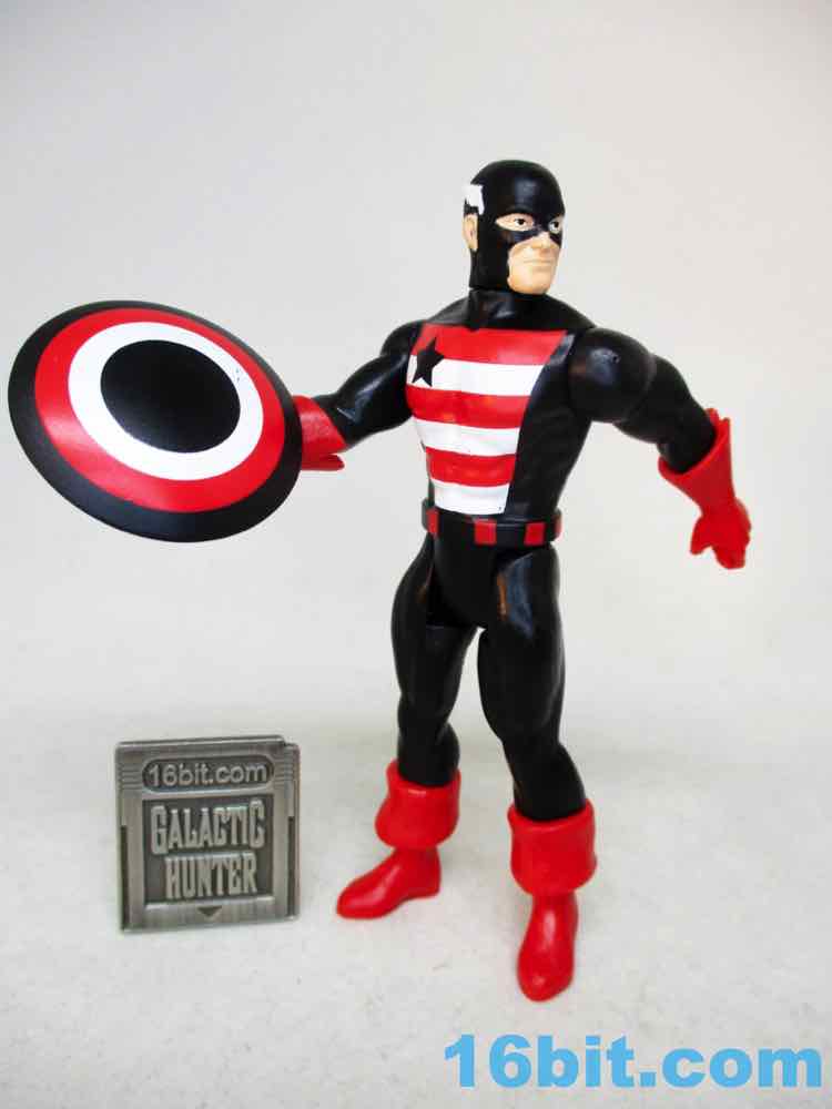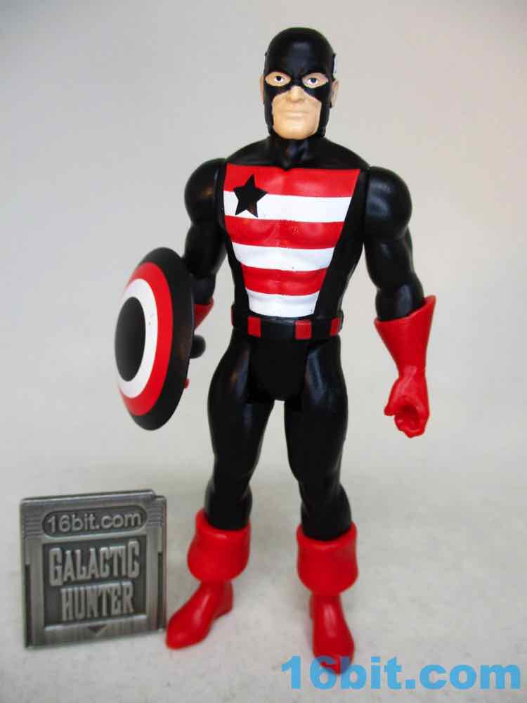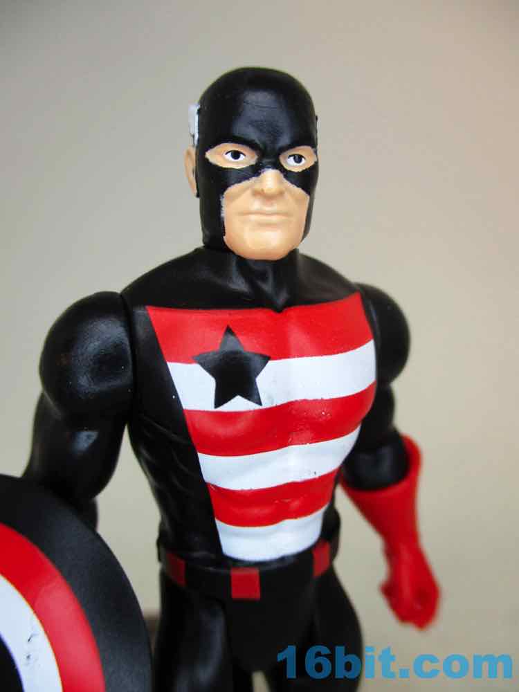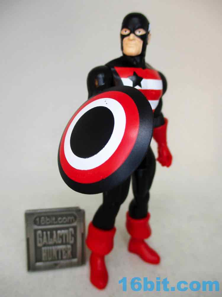 Not-Cap has a shield and basically the same red gloves and boots - it's a less gentle take on the hero and a pretty decent action figure. The black plastic looks great and the white and red pop. The shield lacks a star - because of course it does - and looks like what you'd expect of a figure like this. It's a black repaint, based on comics, and it delivers the goods.