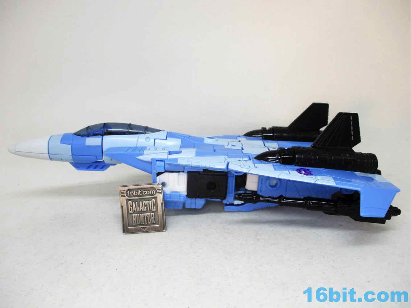 Hasbro has struggled to make a toy out of the Starscream-style jet in most toy lines. Sometimes you get weird geared rotating blasters - those were fun in Generations War for Cybertron jets, for example. Generally speaking it's just a jet with holes in it - this one has no landing gear or rocket launchers, or any "toy" element. There are holes you can stuff with accessories if you want, and you can make "whooshing" sounds. The paint job is great - big black engines, a G2 purple Decepticon logo, and the light sky blue camo looks superb. I'd say they hit the nail on the head minus one thing - that era of toys sometimes had the character's name or the word "AUTOBOT" or "DECEPTICON" on it sometimes. That would have made it even better, but for whatever reason they haven't gone hard into that detail.