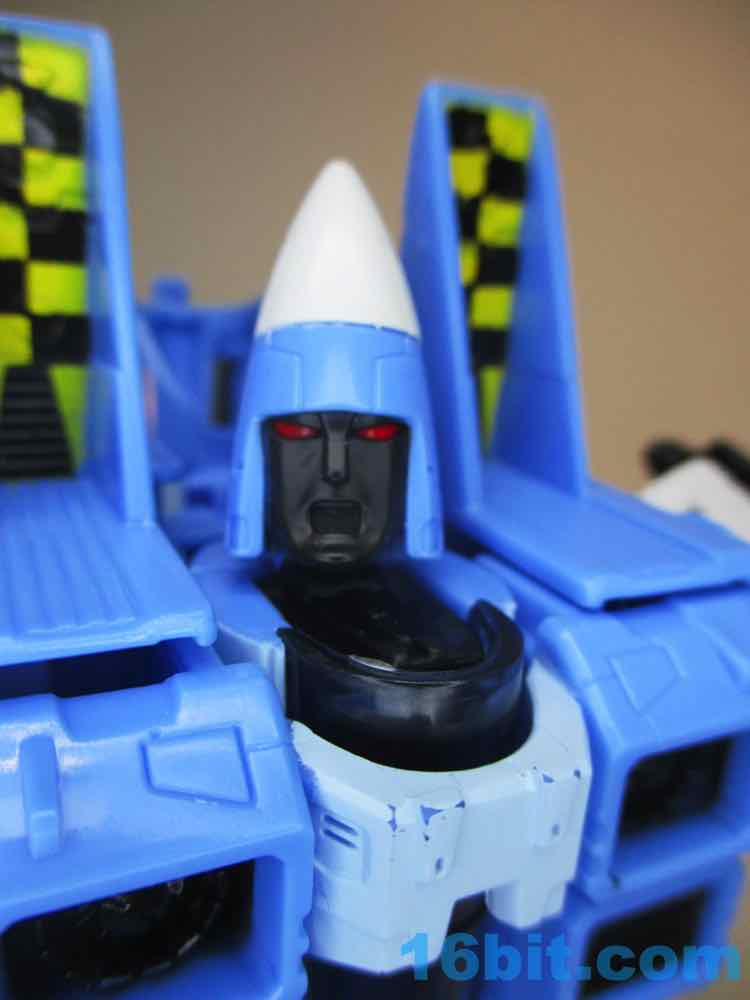 The screaming head of Dirge [FOTD #2,234] was mounted on the body of Ramjet [FOTD #2,234] with new colors to bring you who is effectively a new guy. Hasbro is allergic to making a Sunstorm, but we sure as heck now have a Cloudcover. To my knowledge this character has never appeared in anything, but was proposed as a ca. 1996 addition to Generation 2 - but it's hard to know if this would've been his name, or if he would just be another G2 Ramjet much like we got multiple flavors of G2 Dinobots. This time around he's molded in a mix of blue, black, and white. The cannons are white (painted black), so be careful as rough play may render them prone to scuffing. Most othe things are molded in their main color, with some nice highlights like white kneecaps ad checkered shoulder pylons. And what I can only assume are robot slip-on Vans of a closet budding third-wave ska fanatic. He's yelling out something, so maybe he's about to do the Skank. It's hard to know. Ska was so weird back then.