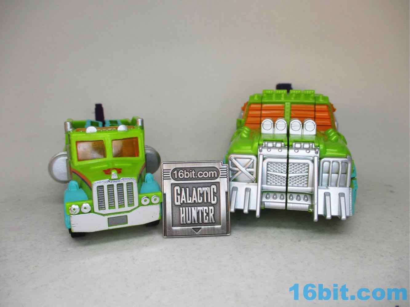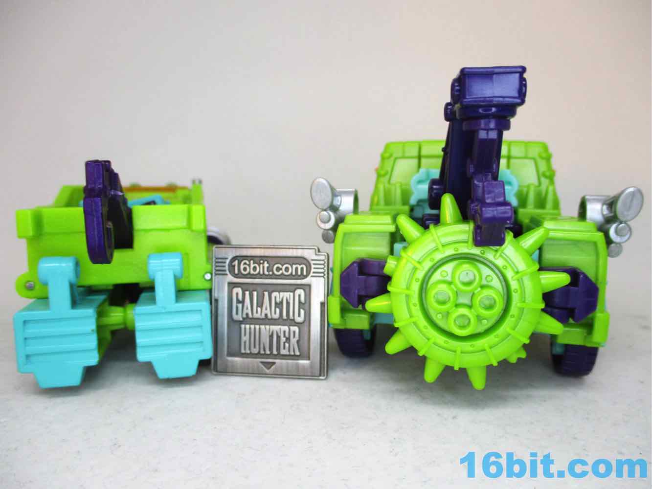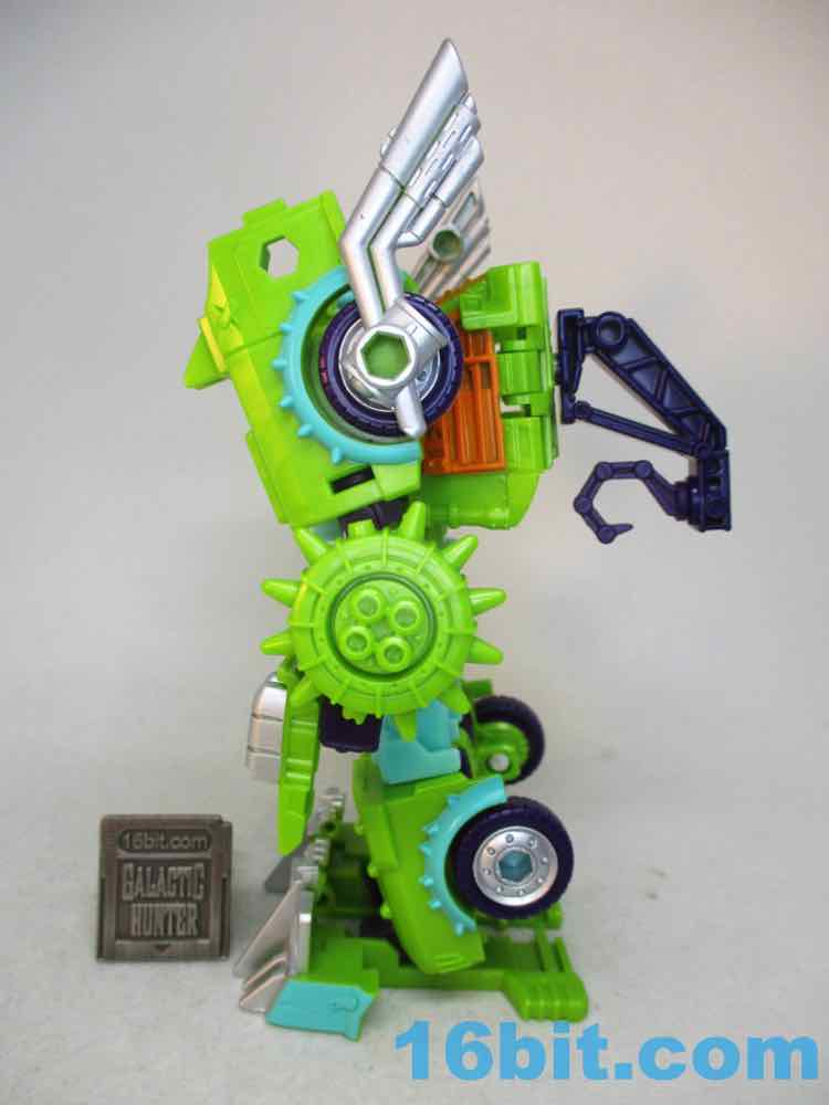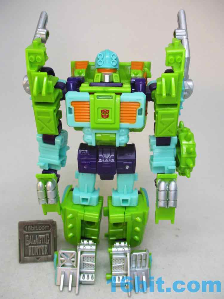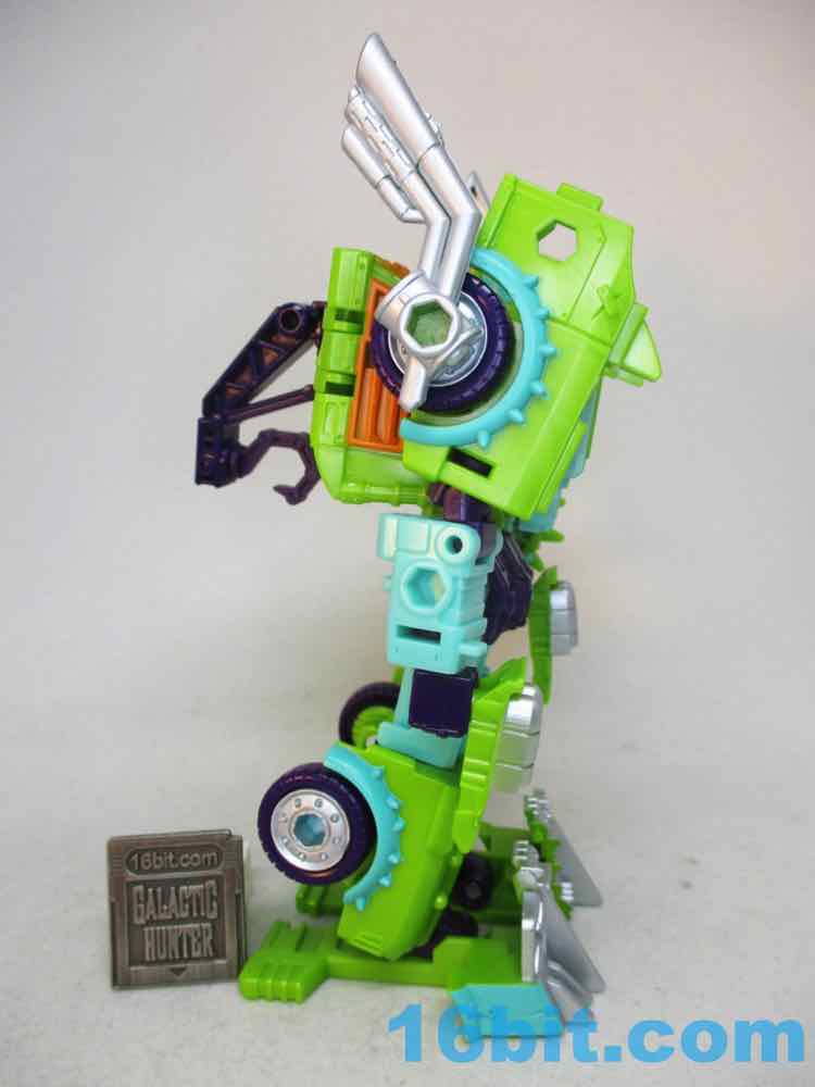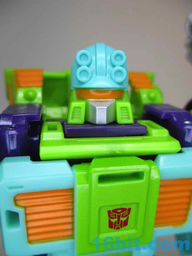 The robot toy plays exactly like Scraphook [FOTD #2,529] with a less serious head. You still get the spiky spare tire, the chrome pipes, the hook, and the shin-mounted blasters. Articulation is pretty good and he holds together rather well for the third (so far) iteration of this engineering. I love the weird head and the color-matching is top-notch. The purple hands look great, the only thing I didn't love was that the bluer green plastic (thighs, forearms) don't quite match the paint. It looks good, but it's not the perfect match that the painted bits are to the RID original. It's also worth noting he doesn't have light-piping, and is all the better for it - the orange visor pops nicely and doesn't seem dim in a dark room, like some other toys.