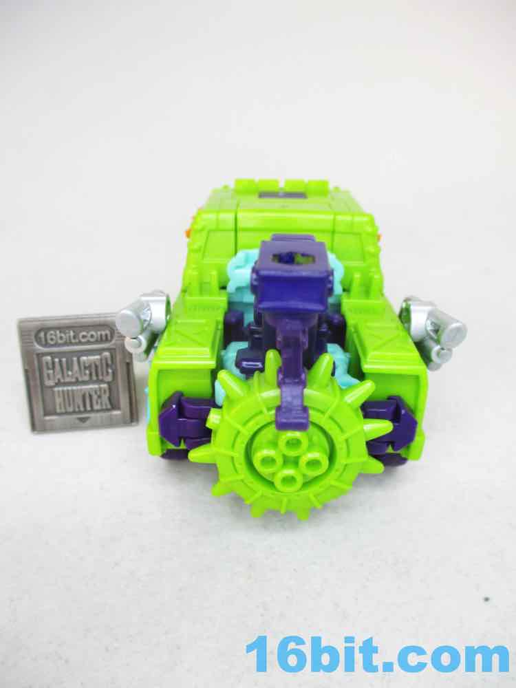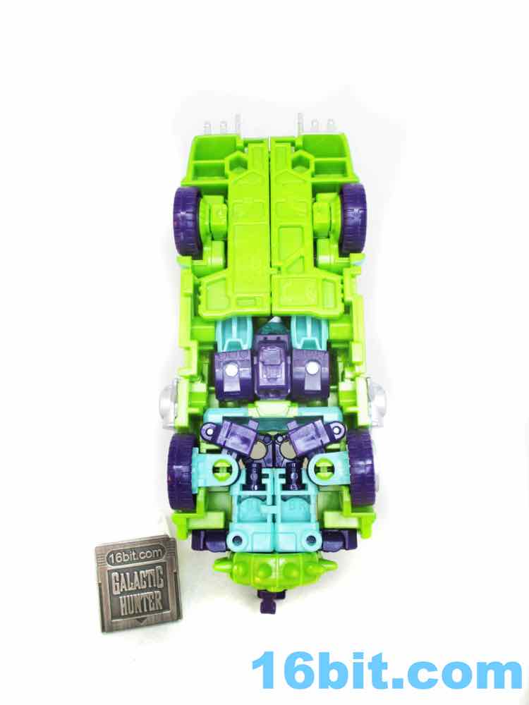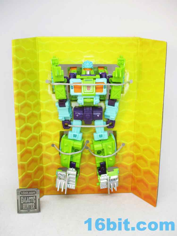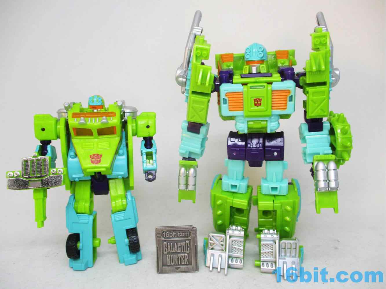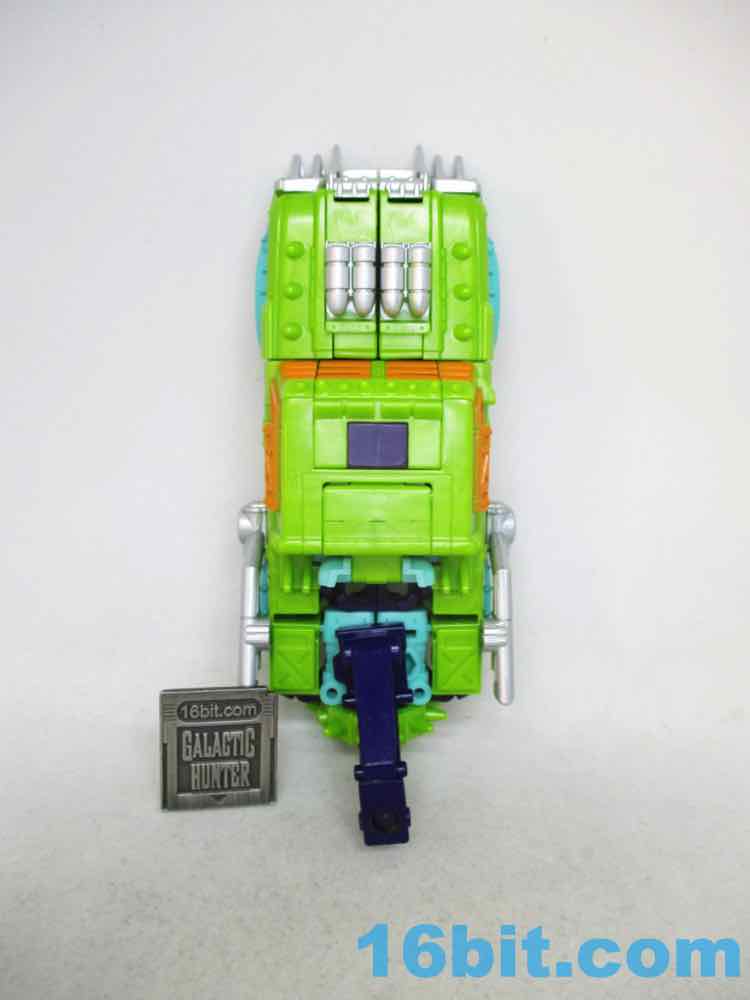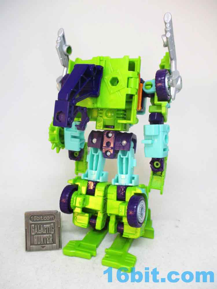 The robot toy plays exactly like Scraphook [FOTD #2,529] with a less serious head. You still get the spiky spare tire, the chrome pipes, the hook, and the shin-mounted blasters. Articulation is pretty good and he holds together rather well for the third (so far) iteration of this engineering. I love the weird head and the color-matching is top-notch. The purple hands look great, the only thing I didn't love was that the bluer green plastic (thighs, forearms) don't quite match the paint. It looks good, but it's not the perfect match that the painted bits are to the RID original. It's also worth noting he doesn't have light-piping, and is all the better for it - the orange visor pops nicely and doesn't seem dim in a dark room, like some other toys.