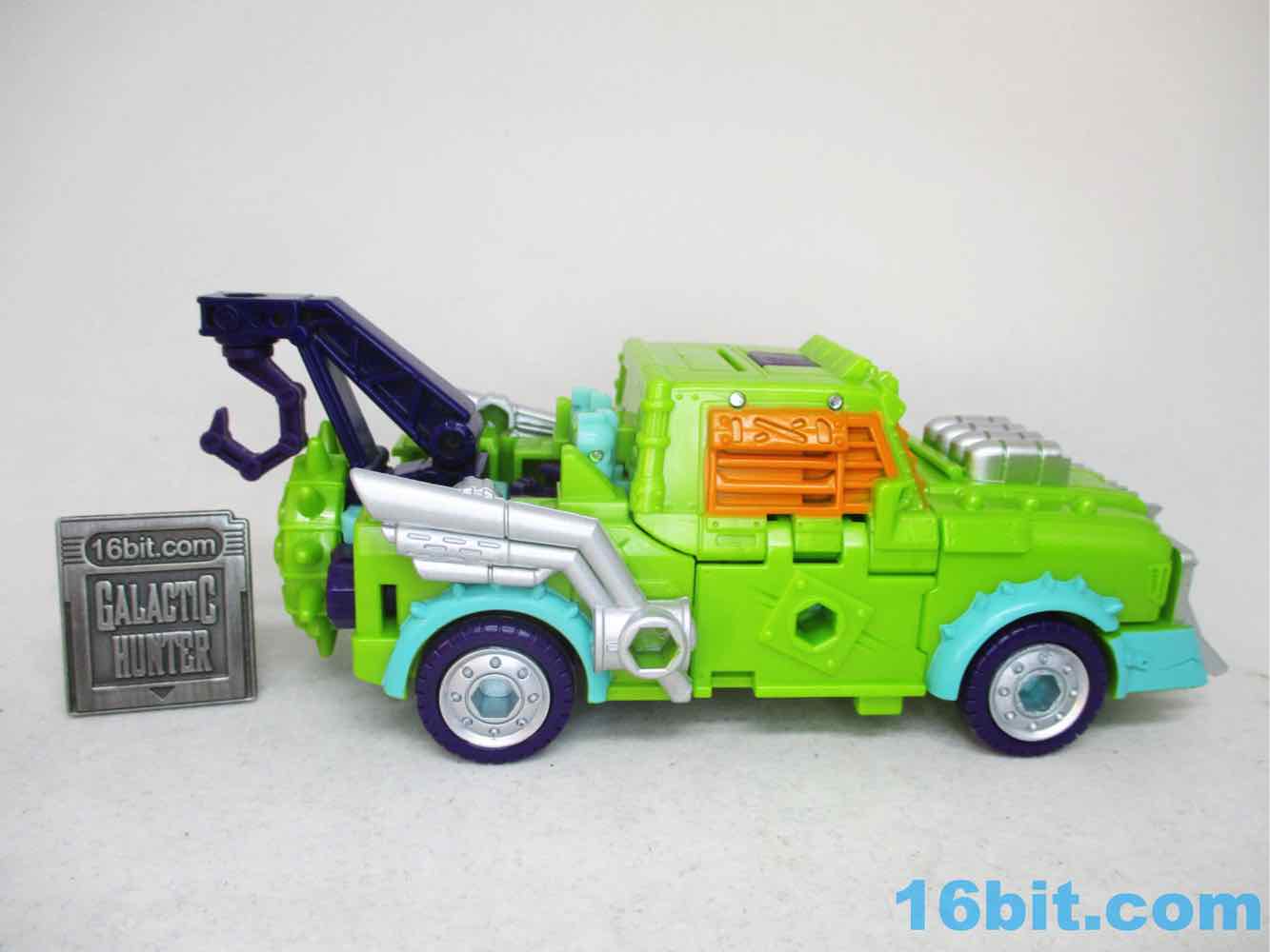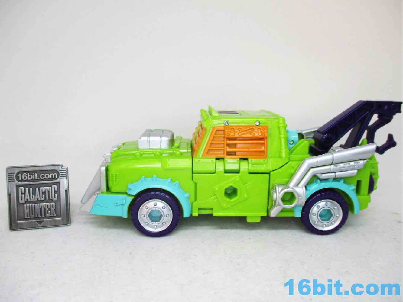 The truck mode is pretty good. It's preposterous for there to be an armored tow truck... or at least, it was, and it probably won't be in a few years. This one improves on the original mold in that the hook can rotate so you can actually use it to tow other vehicles. That's useful. You can also mount all the accessories on it, and he has painted wheels too. It looks good. If it were a Hot Wheels car, I'd recommend buying that too - it's just a nice design. You can connect other 5mm accessories to it, and the engine pops off if you like. Hasbro did a nice job here. You can also tear off a chunk of him and replace it with other toys that share this engineering like Scraphook and Axlegrease. It's charming and it looks like a toy - I really appreciate that. Too many toys look like Serious Collectibles these days, and I don't need that in my life. I want toys, please and thank you.