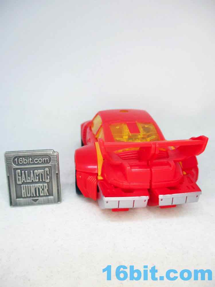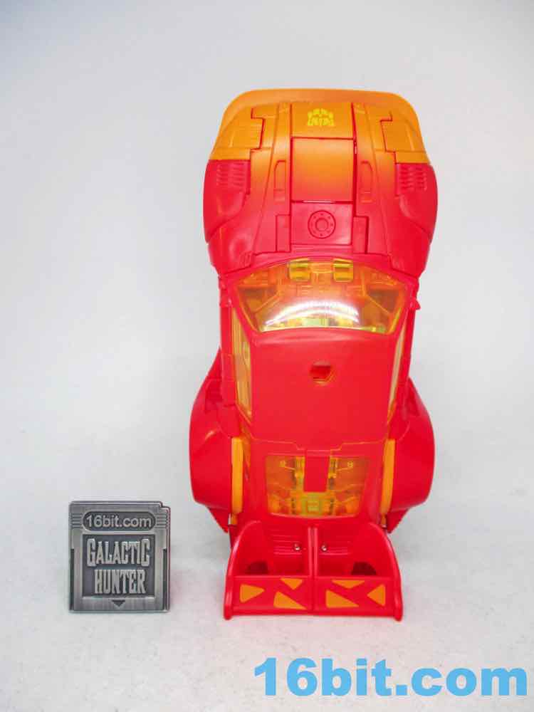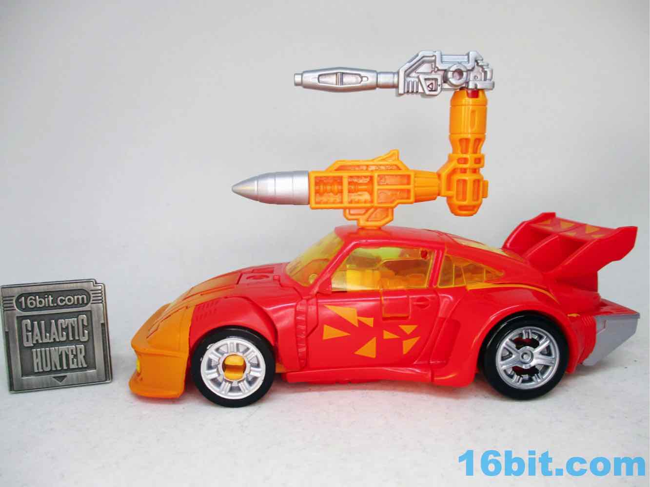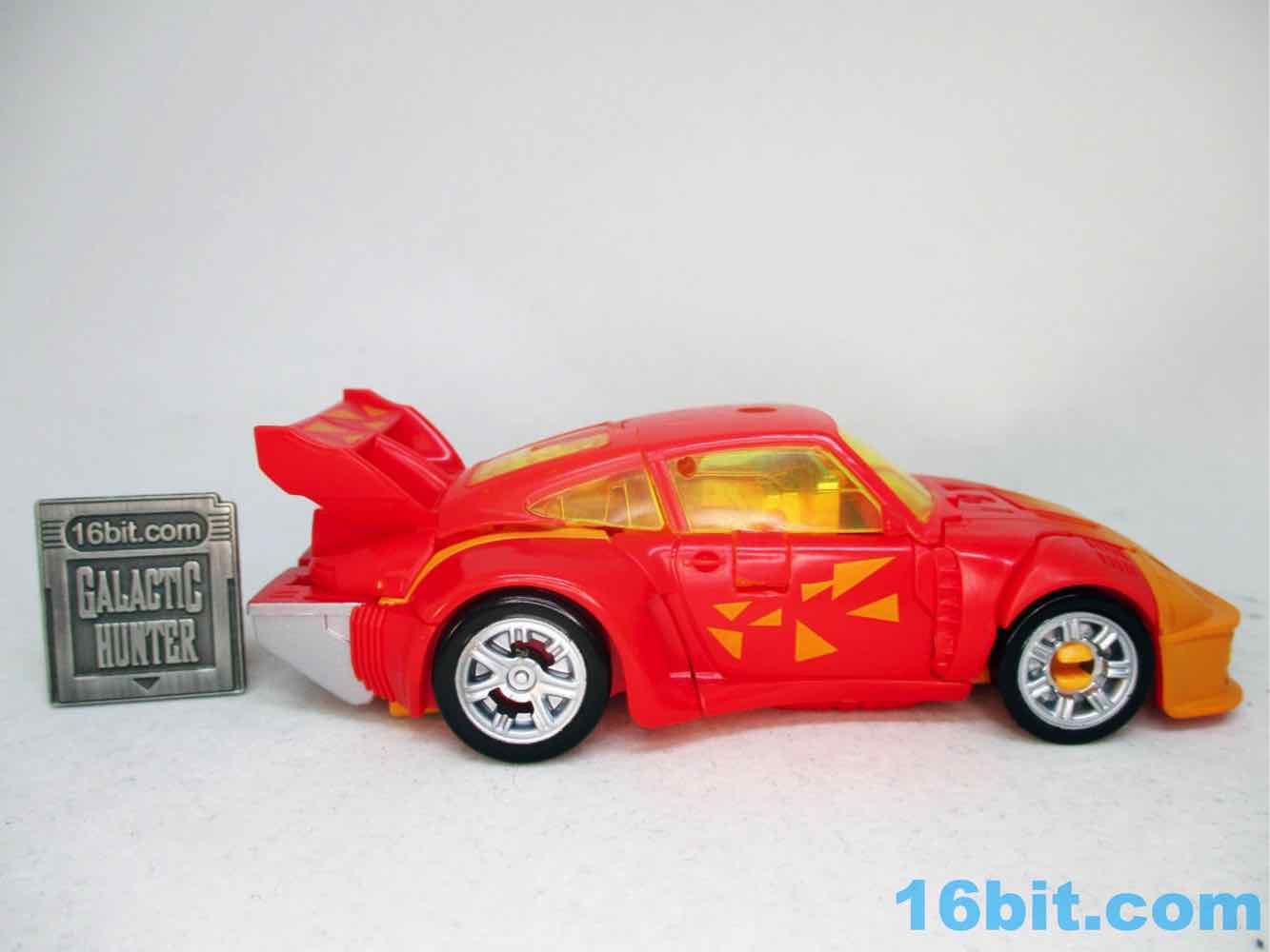 Like most cars, it doesn't do much - but it's charming. The wheels look fine, but the only place to interact with it is a 5mm port on the hood. You can plug one blaster in there - or there, if you connect them in an amusing way. It's a nice looking car with triangles on the wing and doors, plus a nice orange fade on the bumper and hood fading away as it goes back. The clear orange windows are nice, but the subtle yellow G2 Autobot face is a real nice touch