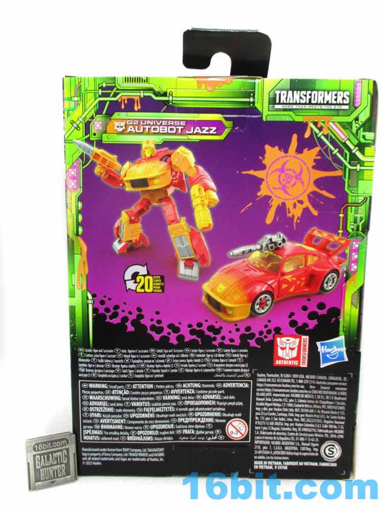 Sometimes a figure is a big surprise - you can know it's coming, and you still don't believe it when you see it. G2 Universe Autobot Jazz is based on an unrealized 1990s concept where Jazz would be Fire Guts'd with little triangles for some reason. There were a bunch of nifty unreleased G2 toys - most of which were Autobots - and this was one of three that were pretty famous. Mirage and Sideswipe also surfaced as package art and painted samples, so it's nice to see the trio replicated as Walmart exclusives in 2023. If you can find them. They're in seemingly short supply, I've seen Jazz here on pegs twice so far.