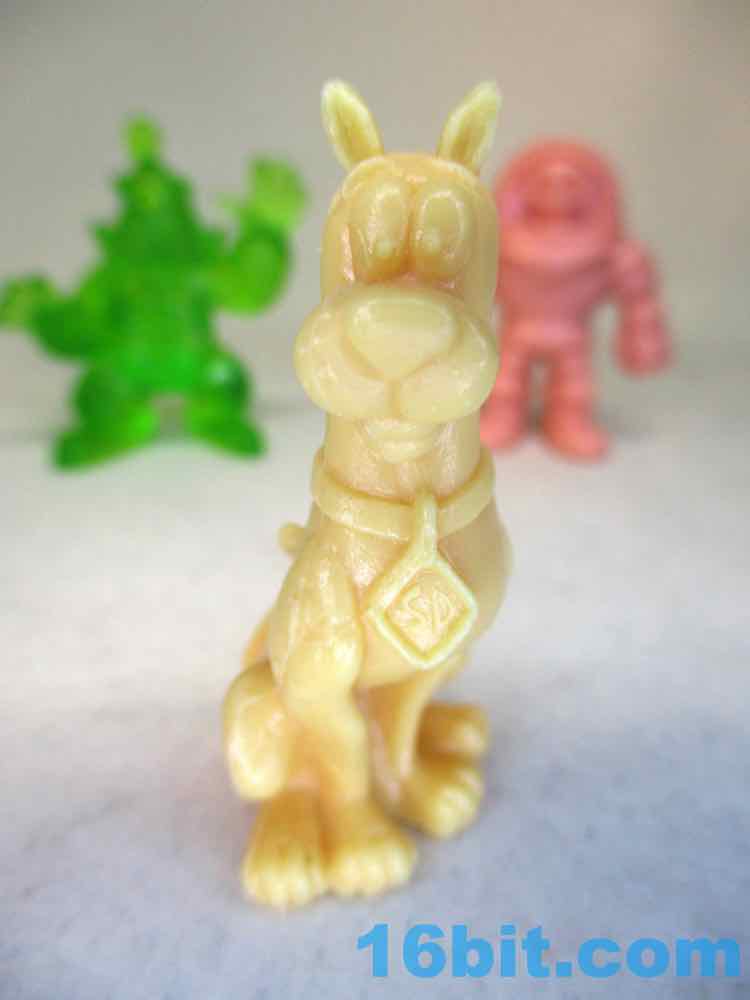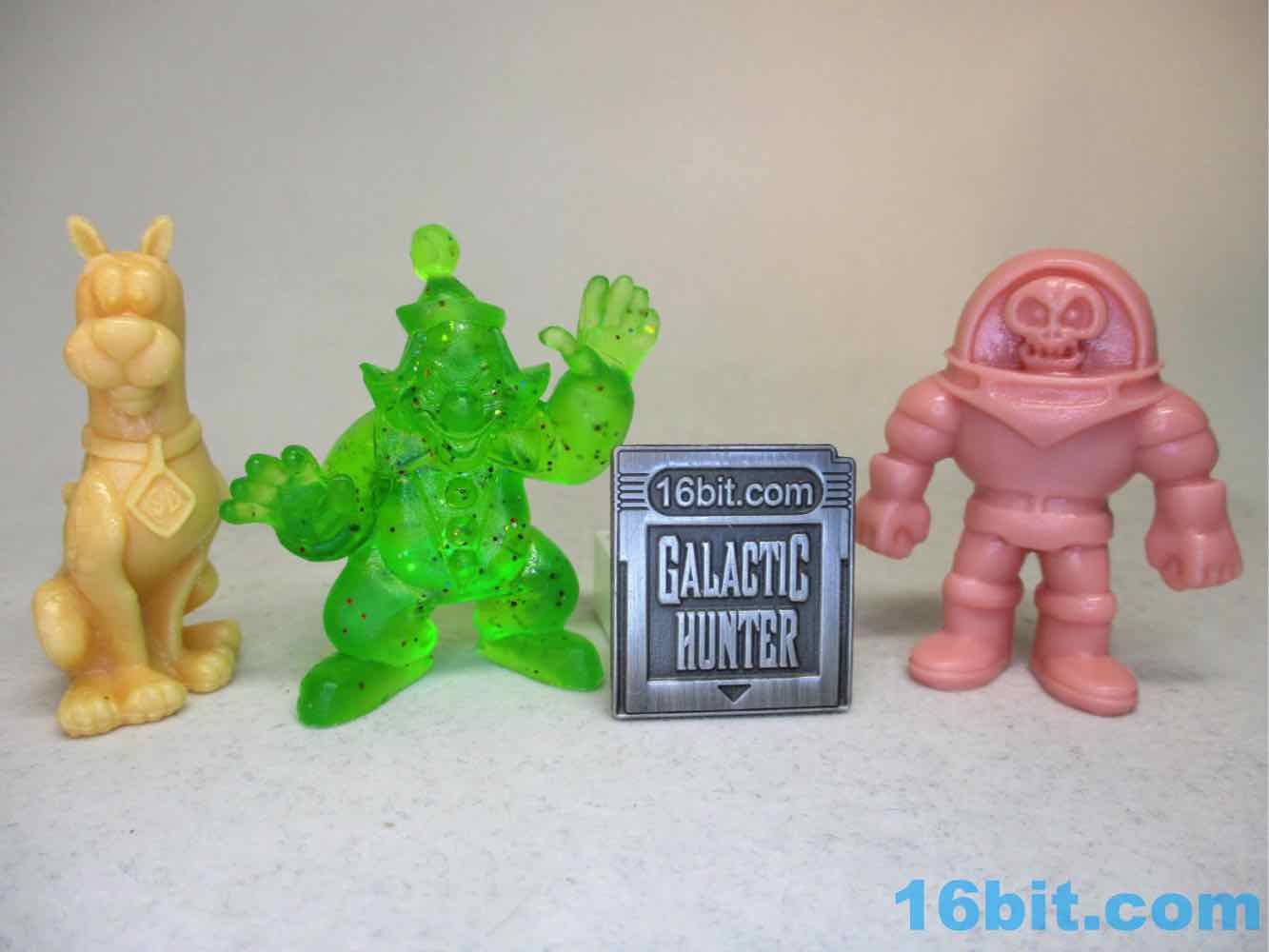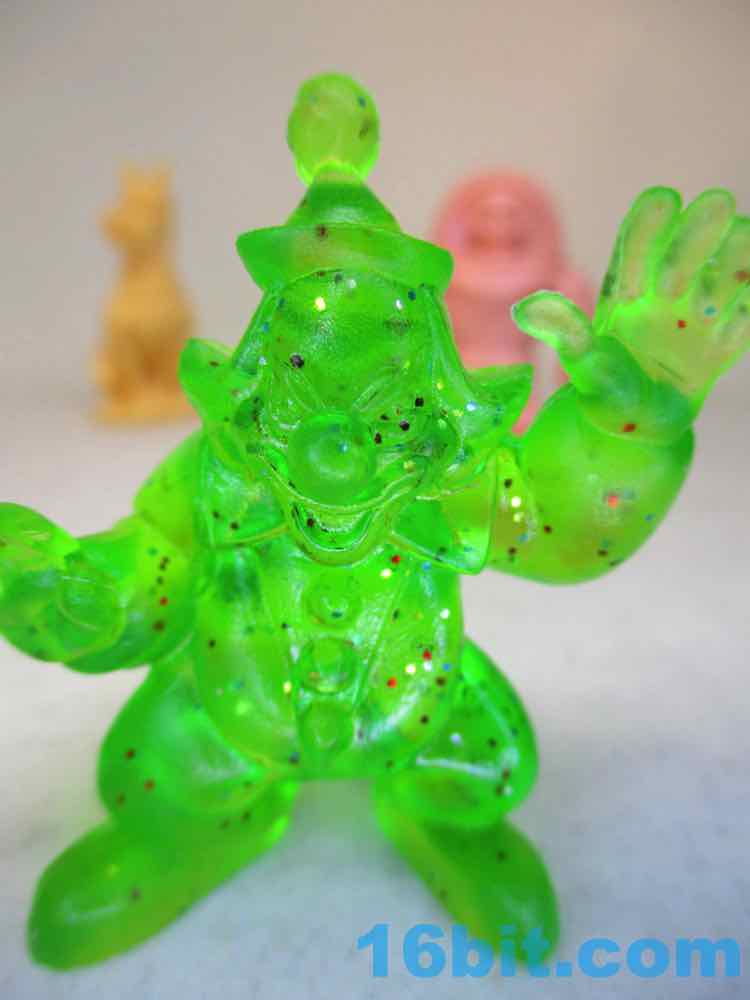 The figures are pretty much the same size as M.U.S.C.L.E. (or S.U.C.K.L.E. if you swing that way) figures, standing about 1 3/4-inches tall. Sculpting is good - it's not over-detailed, although the Space Kook has some decent texture on his skull. Scooby has his collar and his eyes are unusual in that they seem to be popping out a bit. The Ghost Clown lacks the coin of gold, but seems posed as if he has one handy. The detail is really great, but the clear green and glitter plastic make it really hard to make out all the details. Held up at the right angle, you can see a big nose, buttons, billowy pants, individual fingers, and that a lot of work went into it.
