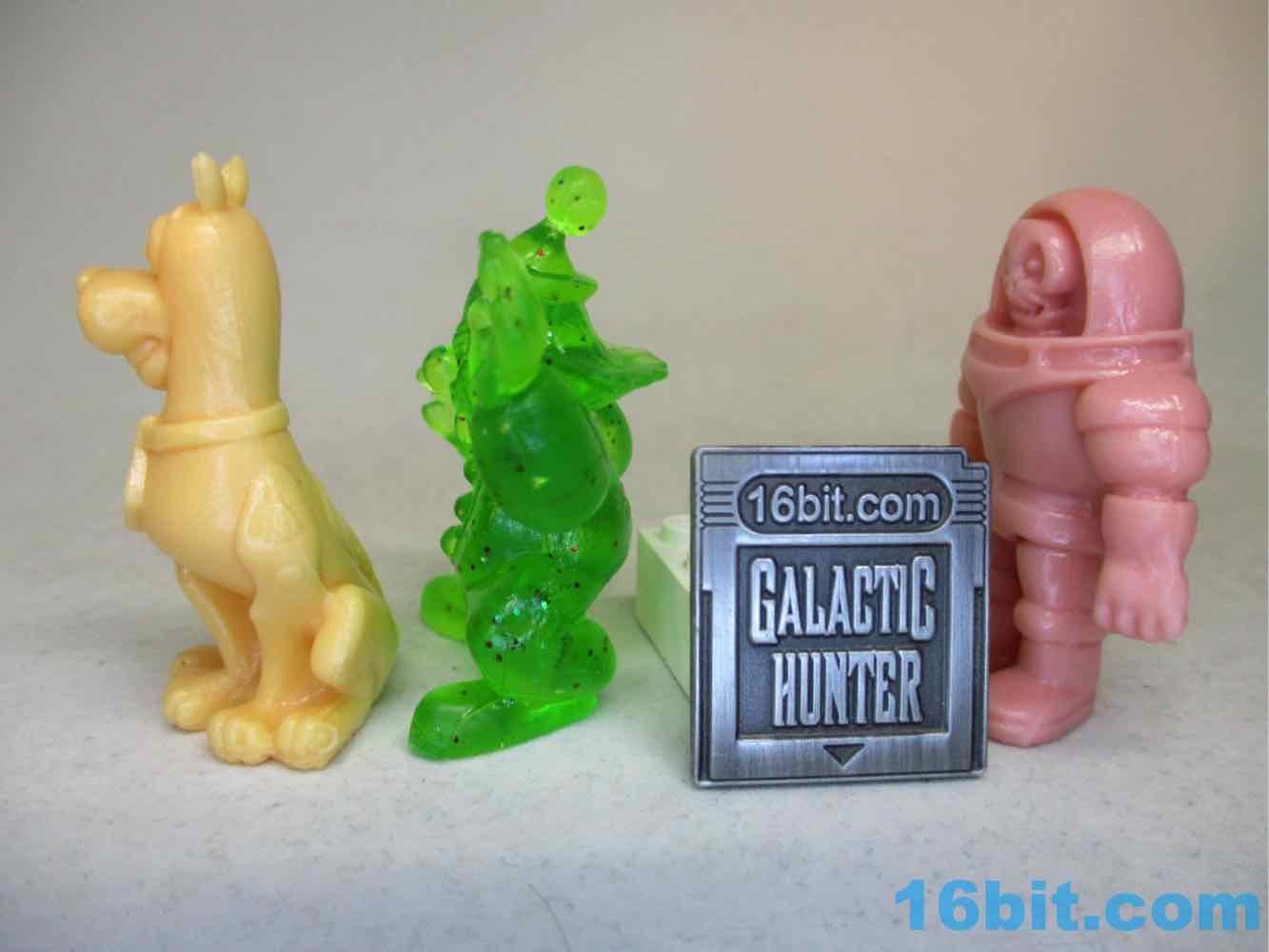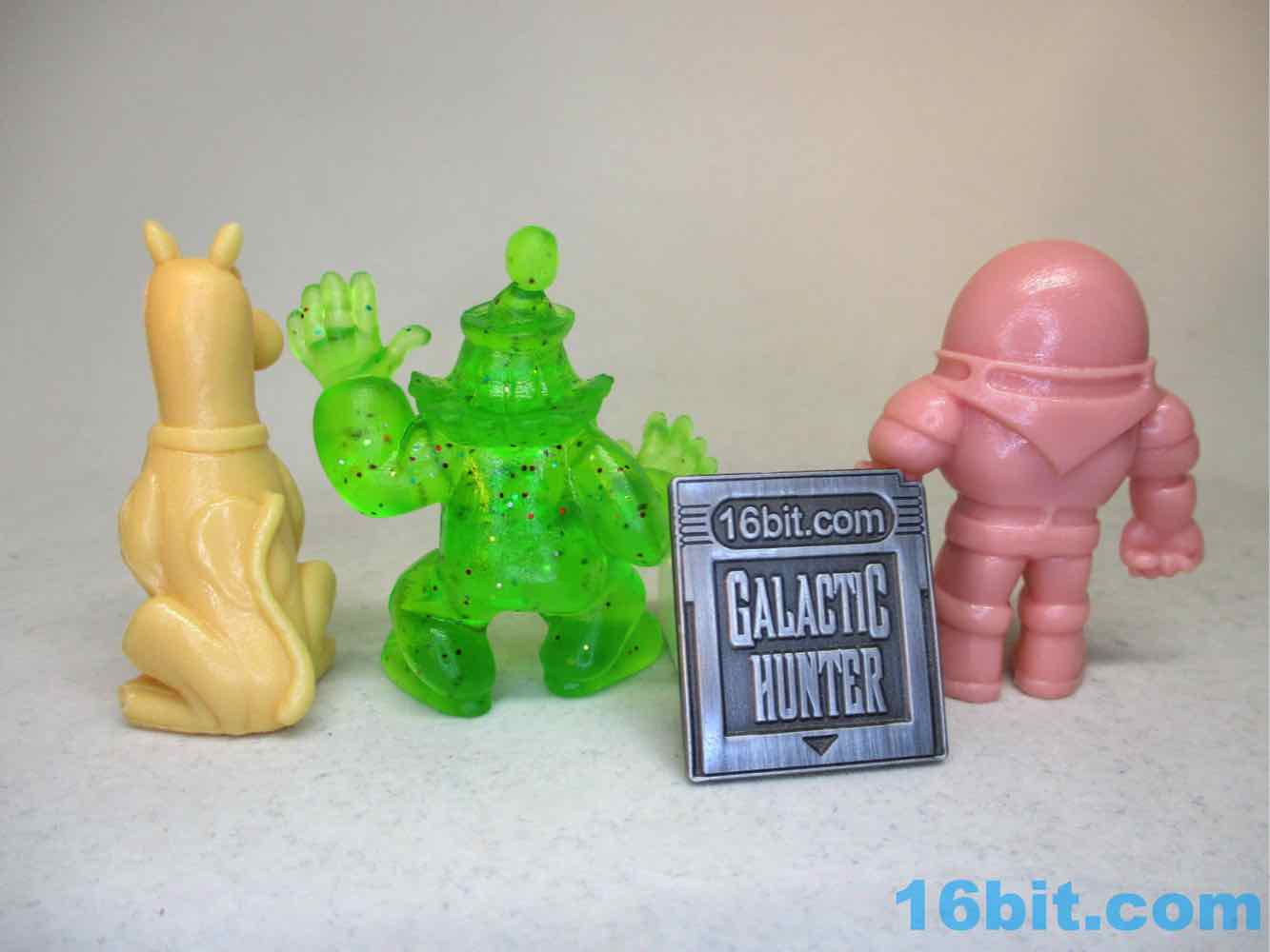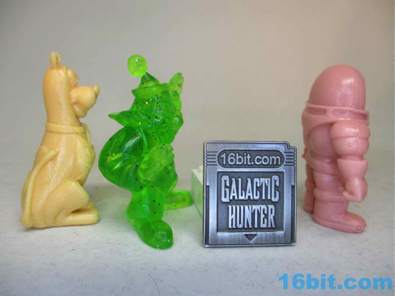 The figures are pretty much the same size as M.U.S.C.L.E. (or S.U.C.K.L.E. if you swing that way) figures, standing about 1 3/4-inches tall. Sculpting is good - it's not over-detailed, although the Space Kook has some decent texture on his skull. Scooby has his collar and his eyes are unusual in that they seem to be popping out a bit. The Ghost Clown lacks the coin of gold, but seems posed as if he has one handy. The detail is really great, but the clear green and glitter plastic make it really hard to make out all the details. Held up at the right angle, you can see a big nose, buttons, billowy pants, individual fingers, and that a lot of work went into it.