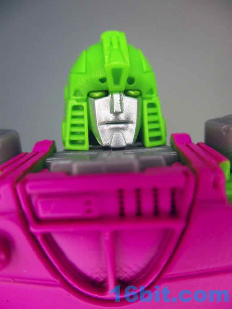 The legs don't hold together particularly well due to how it transforms, and that's my main gripe about the toy. You might have to fidget with it some. Also you cant make the rocket launcher shoulder-mounted without additional parts or customizations, but that's true of other versions of this toy as well. There probably was no budget for an adapter, so what we got is close, but not perfect. He can hold his accessories, you can mount C.O.M.B.A.T. effects on them, and it generally looks more or less like the abandoned robot figure concept but with more articulation. They even got the gator spoilers on the shoulders with some of the scales on the legs. I would have loved more, but I assume they had a budget which was spent on a lot of pink paint. Given the plastic mold layouts, this is likely as good as it gets without running extra parts and throwing away the spare bits. I saw some complaints that the "toy head" wasn't used, and that the face was painted silver, but I'm fine with it. The painted yellow eyes look find to me and give him a little more life than a bare green head would have delivered.