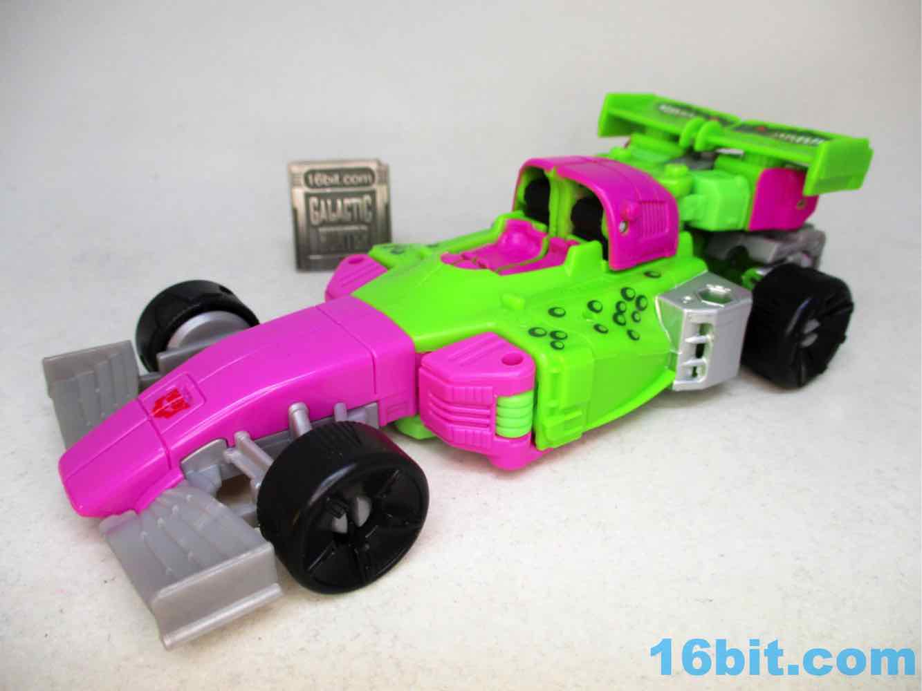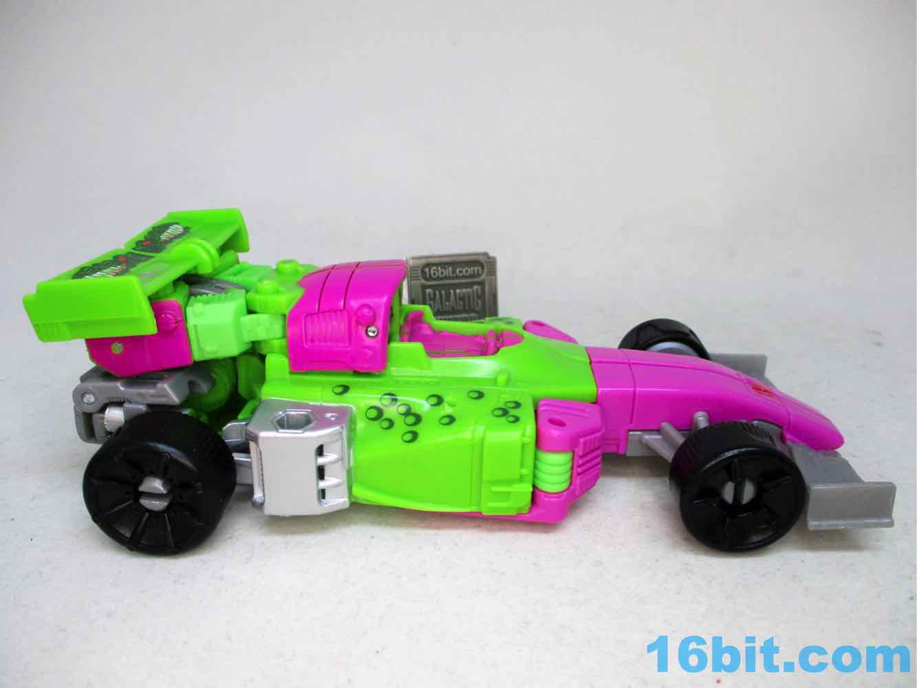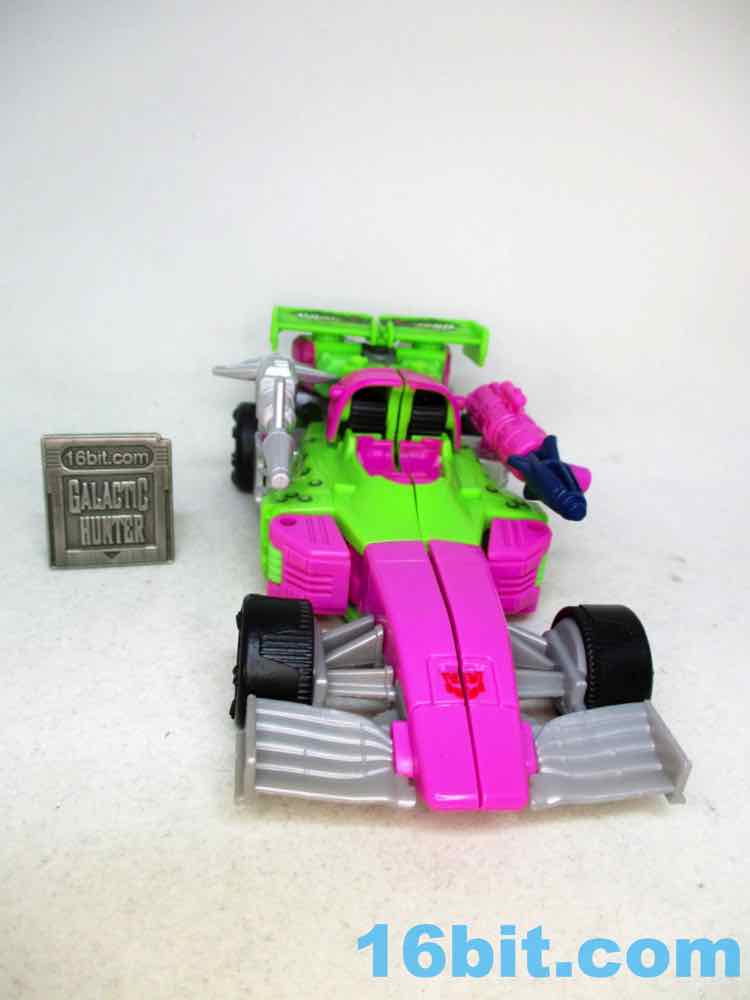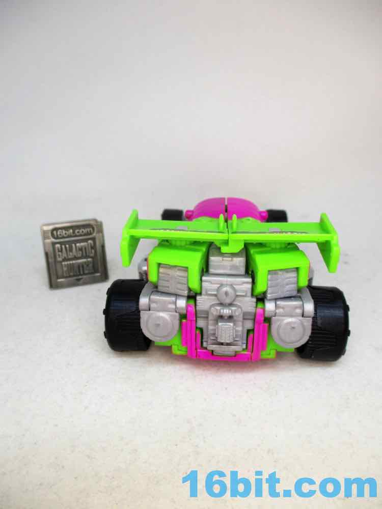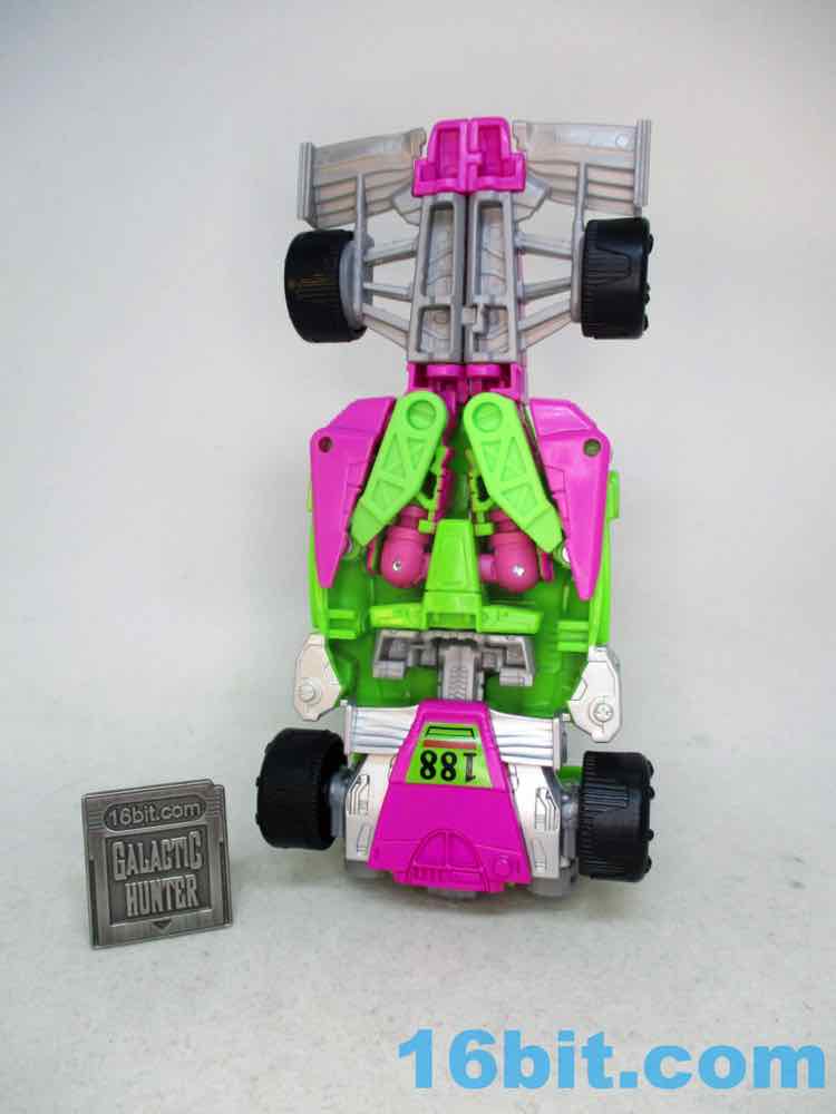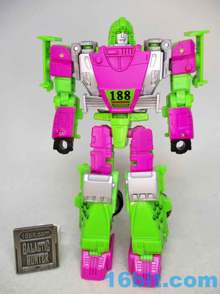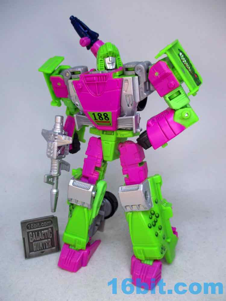As a fancy racing vehicle, it's pretty good - but it seems unfinished. Any toy based on an unmade 1990s prototype should have some updates, but some of them are kind of weird here. For example, the "188" marks on the toy's 1990s prototype artwork were on the chest and leg - which means it would be visible on the car. The car does not show it. You do get the gator on the spoiler, which is great, and the engine on the back is there. But it lacks some of the graphics on the original toy concept, and I would really lave liked to see those. The sticker makers will love this - but aside fom that, it's fine. The wheels don't spin super well, and the blaster accessories tend to cover up the markings on the toy when attached. It still basically looks like the concept, which is what matters - it's bright green and pink. The wheels aren't silver on the caps, but at least it's ridiculously bright. It's just shy of being the busy eye-searing 1990s nightmare we all hoped to get.