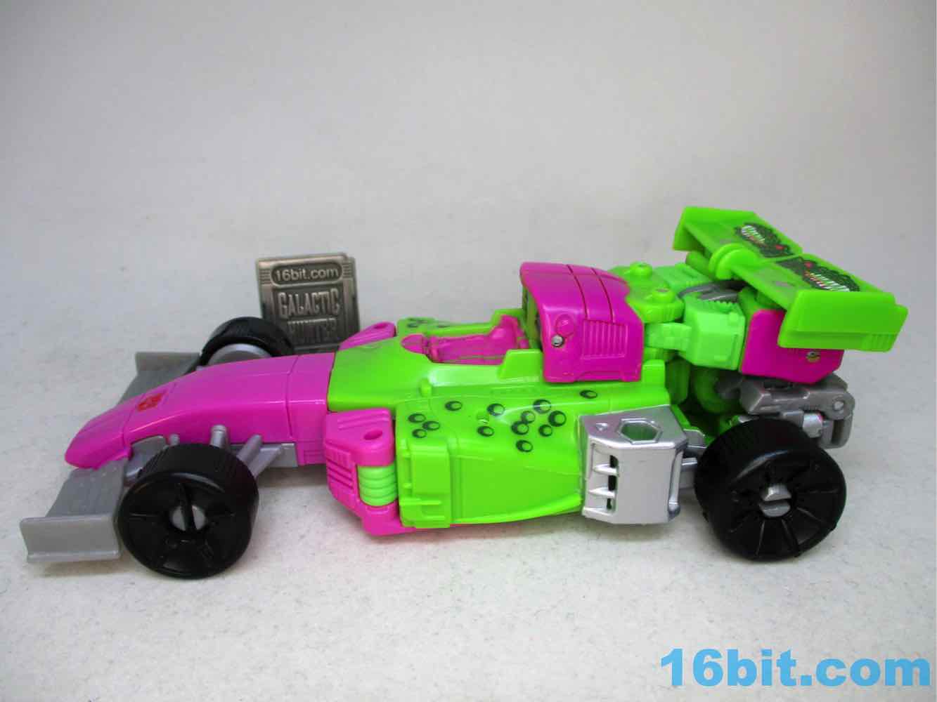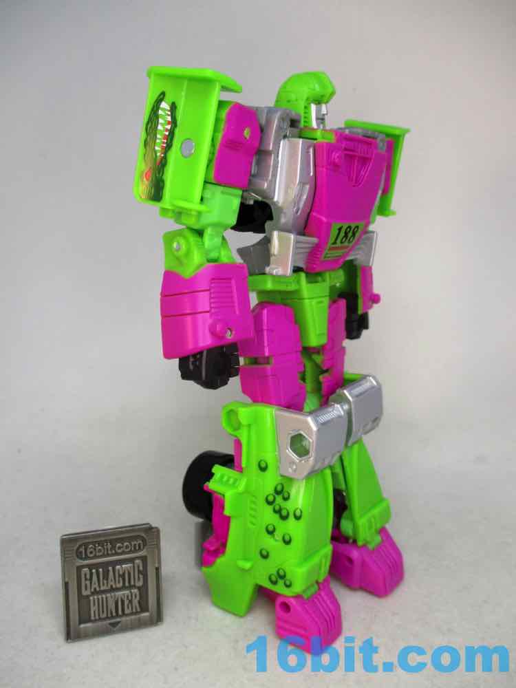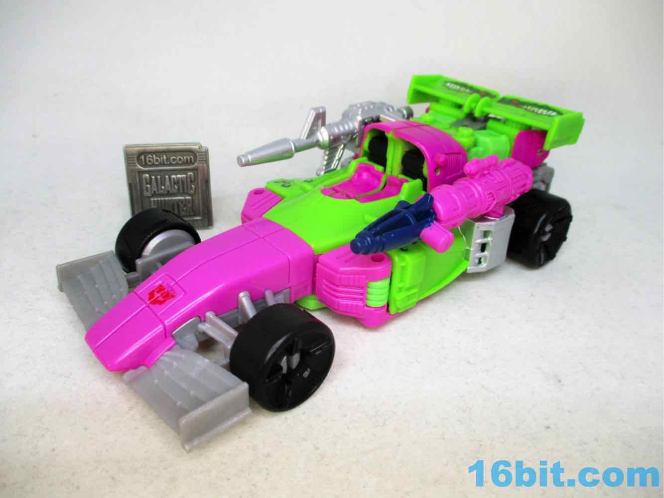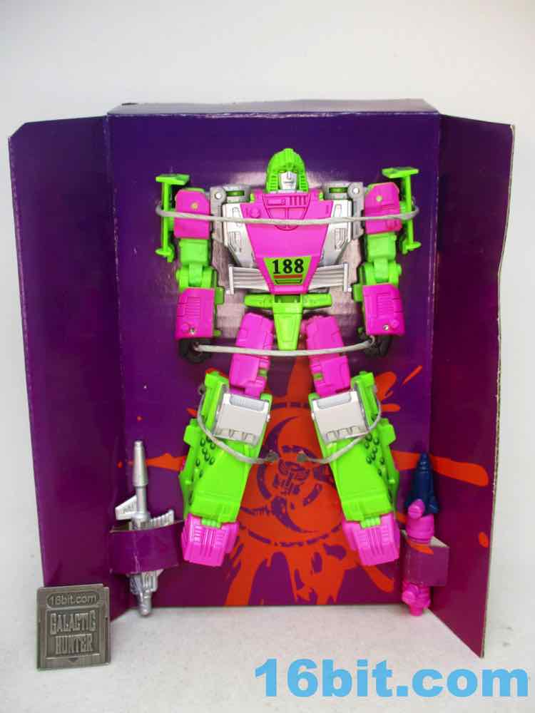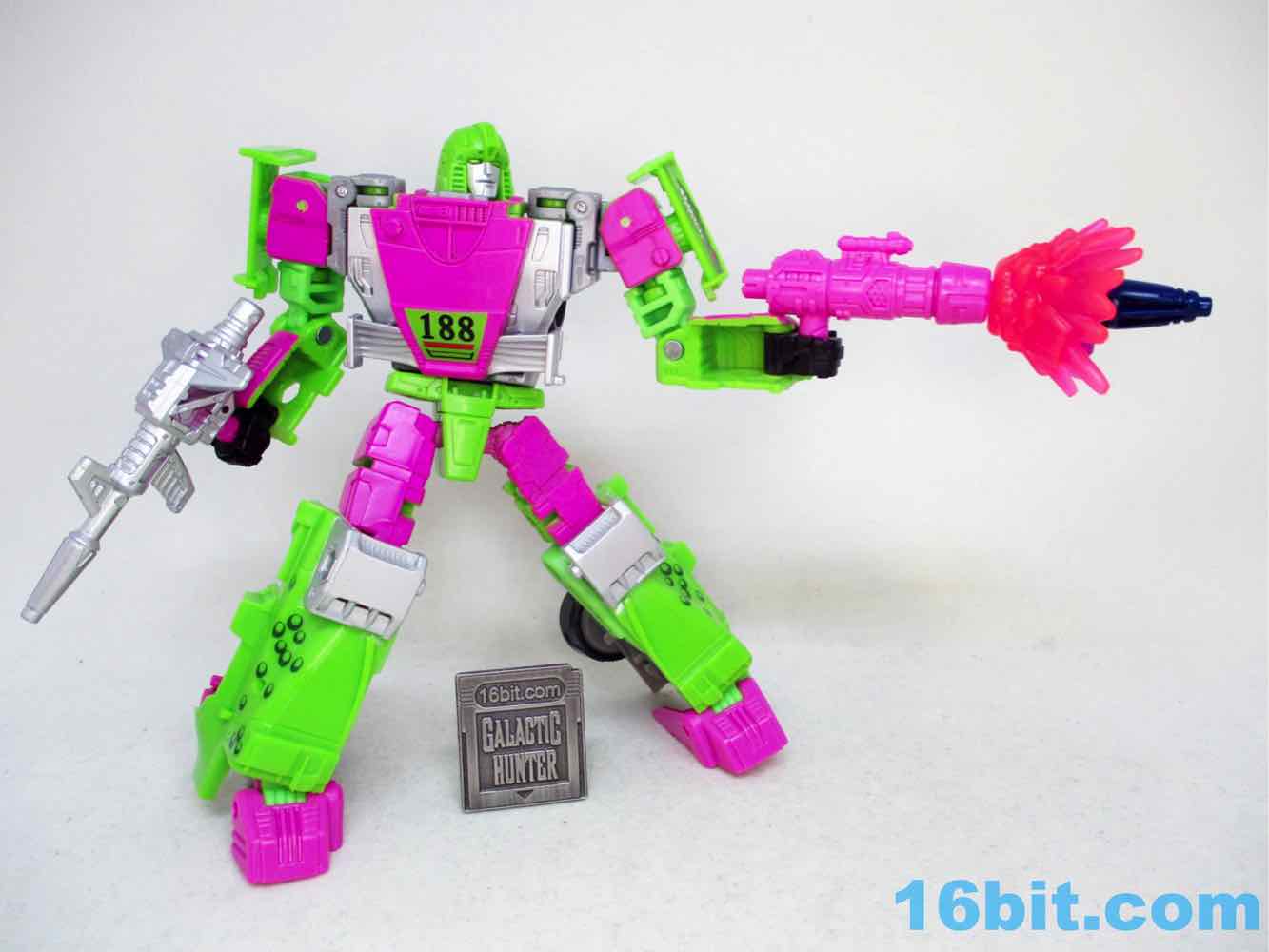 As a fancy racing vehicle, it's pretty good - but it seems unfinished. Any toy based on an unmade 1990s prototype should have some updates, but some of them are kind of weird here. For example, the "188" marks on the toy's 1990s prototype artwork were on the chest and leg - which means it would be visible on the car. The car does not show it. You do get the gator on the spoiler, which is great, and the engine on the back is there. But it lacks some of the graphics on the original toy concept, and I would really lave liked to see those. The sticker makers will love this - but aside fom that, it's fine. The wheels don't spin super well, and the blaster accessories tend to cover up the markings on the toy when attached. It still basically looks like the concept, which is what matters - it's bright green and pink. The wheels aren't silver on the caps, but at least it's ridiculously bright. It's just shy of being the busy eye-searing 1990s nightmare we all hoped to get.
