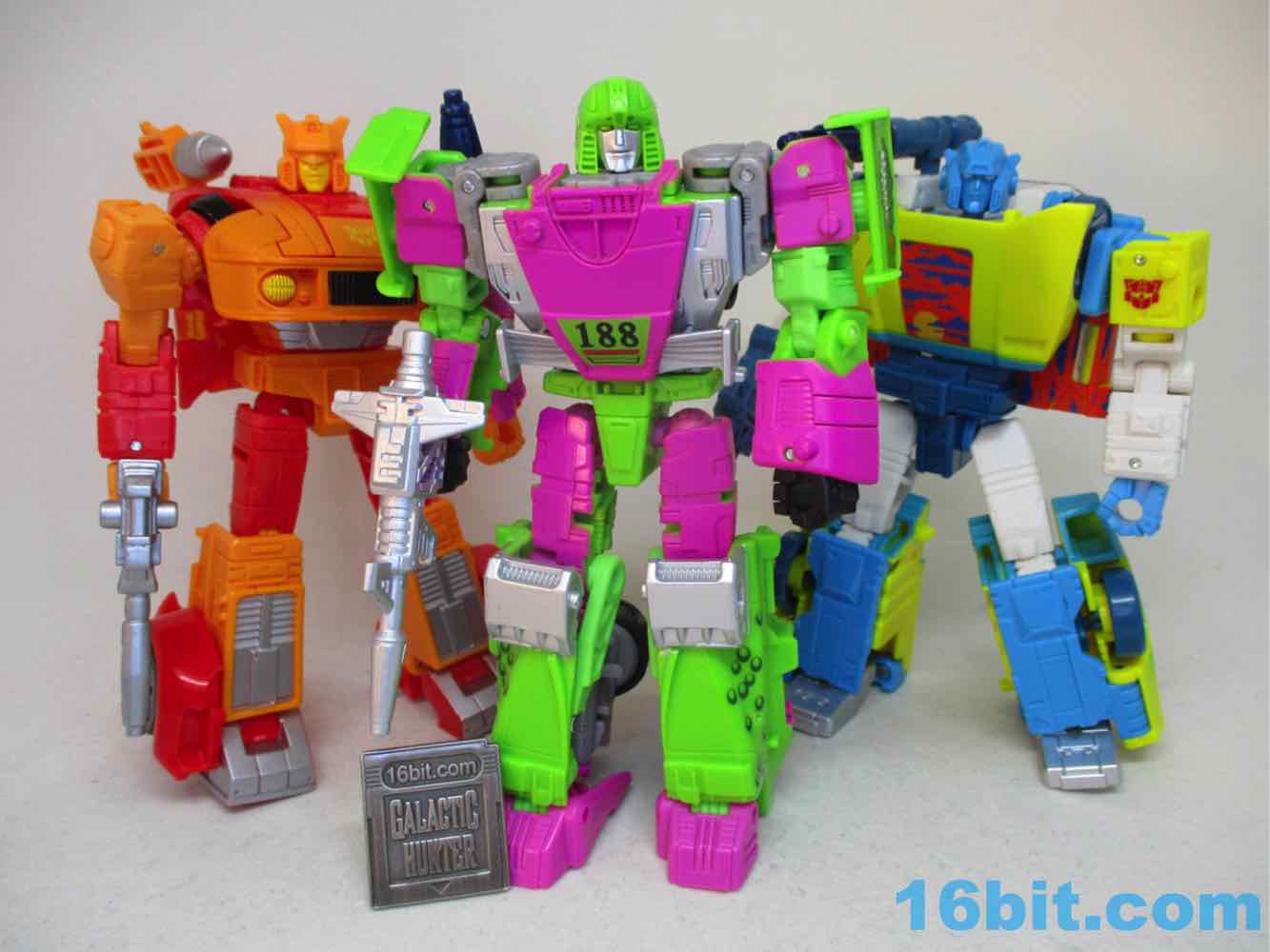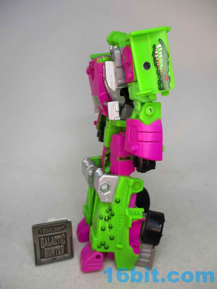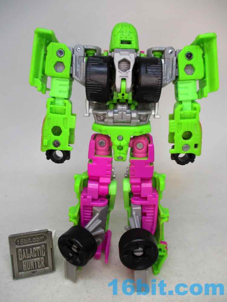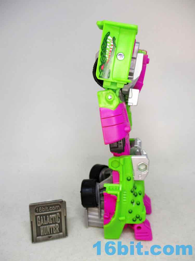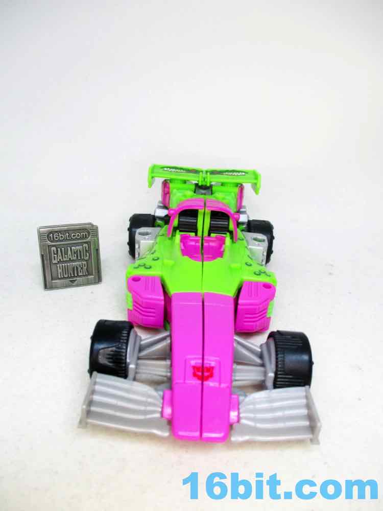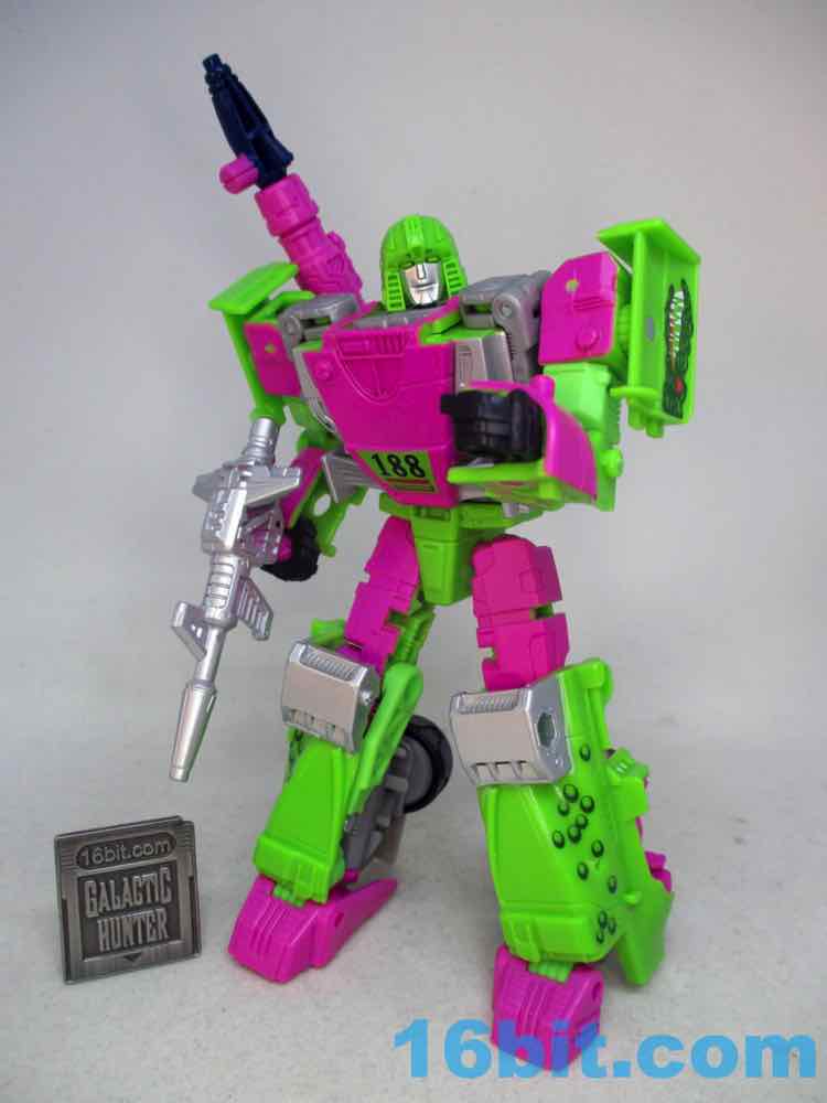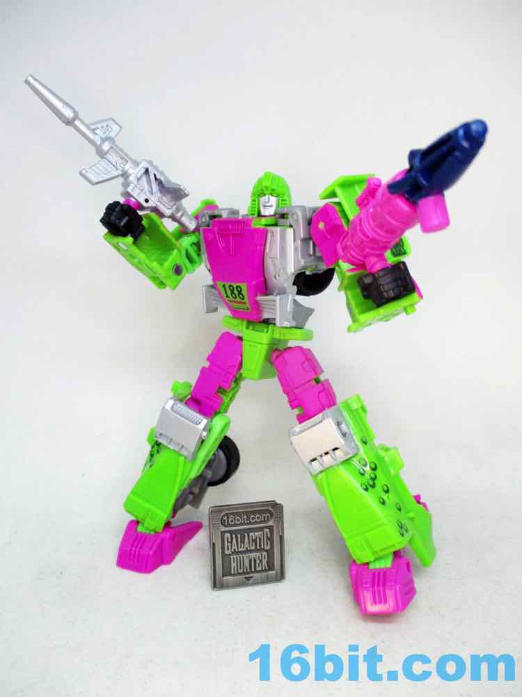 As a fancy racing vehicle, it's pretty good - but it seems unfinished. Any toy based on an unmade 1990s prototype should have some updates, but some of them are kind of weird here. For example, the "188" marks on the toy's 1990s prototype artwork were on the chest and leg - which means it would be visible on the car. The car does not show it. You do get the gator on the spoiler, which is great, and the engine on the back is there. But it lacks some of the graphics on the original toy concept, and I would really lave liked to see those. The sticker makers will love this - but aside fom that, it's fine. The wheels don't spin super well, and the blaster accessories tend to cover up the markings on the toy when attached. It still basically looks like the concept, which is what matters - it's bright green and pink. The wheels aren't silver on the caps, but at least it's ridiculously bright. It's just shy of being the busy eye-searing 1990s nightmare we all hoped to get.