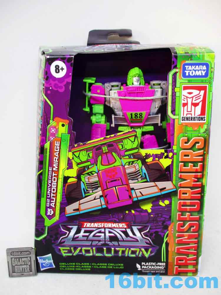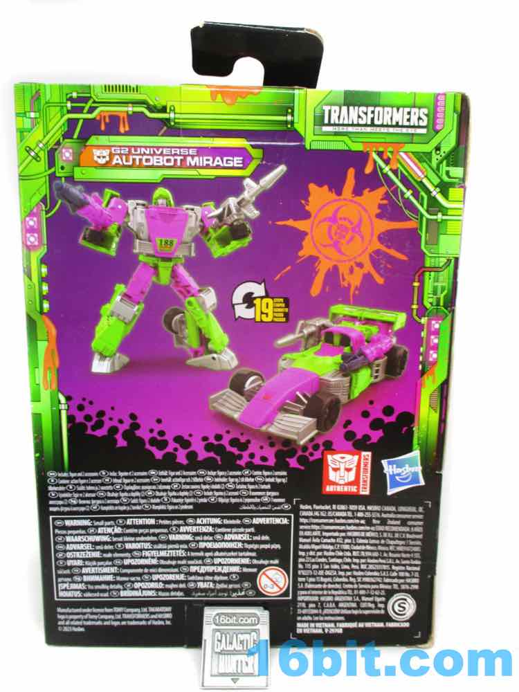 This pink and green G2 Universe Autobot Mirage is - or rather, was - a legendary prototype with packaging art and the works. A painted sample appeared and it was never made for wide release until now. The toy more or less delivers on a refined version of the original concept, picking and choosing elements from the toy and art to apply to the Earthrise mold previously used for Amazon exclusives. There are things it updates, and things it didn't quite bother to think through - and the end results are perfectly decent. I mean, I'm not crazy about this mold at all, and I wish we waited for a better Mirage toy to repaint, but I can't imagine they'll take another crack at these colors. So I bought it, and I am pleased. But, again, it could probably have been a little bit better. My main complet is it left the door open for a sticker upgrade set.