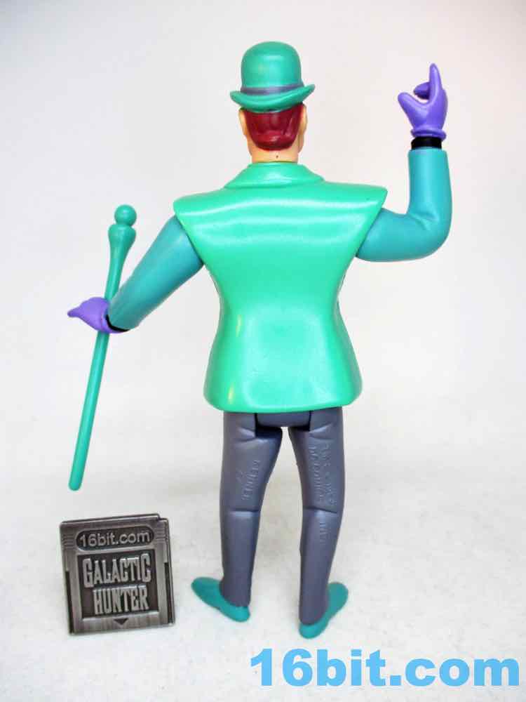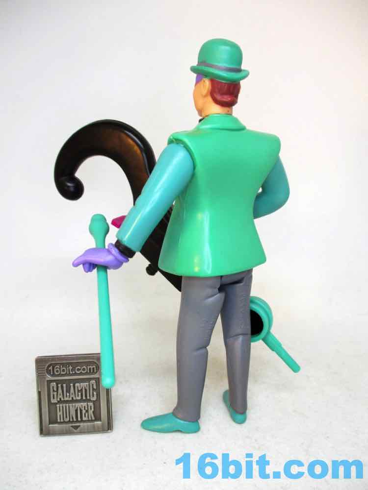 His cane fits in his hand just fine. Like most accessories of the era, it's molded in green and isn't quite the color-match of the TV show, no doubt to keep costs down. He can hold it easily, and given the amount of personality sculpted into his hands, I'm impressed. The right one has the index finger pointing, as if to say "Stop me if you've heard this one" along with his goofy, wide grin. His left hand has an extended pinky, which is perfect to give him an air of refinement over some of the other (shall we say) less classy villains. He prides himself in being smart - and if you recall that one episode, not yet rich. These subtle details really paint a picture with an action figure without having to pack in extra articulation or gear. Everything is right there in the little plastic man, which is almost a tiny animated maquette when compared to later and modern toys. Super articulation is nice, but it fails to give you quite as much personality right out of the box. Or, for that matter, in the box.