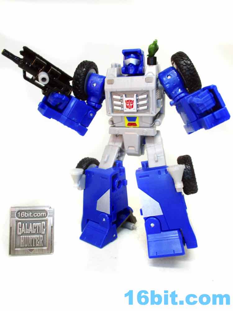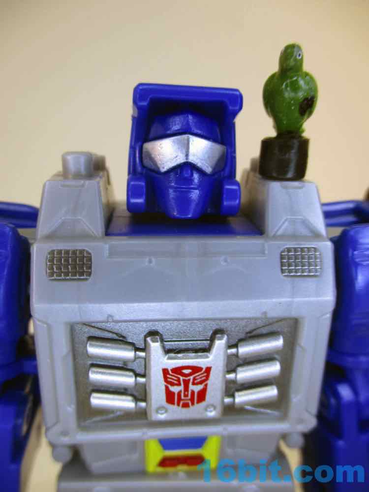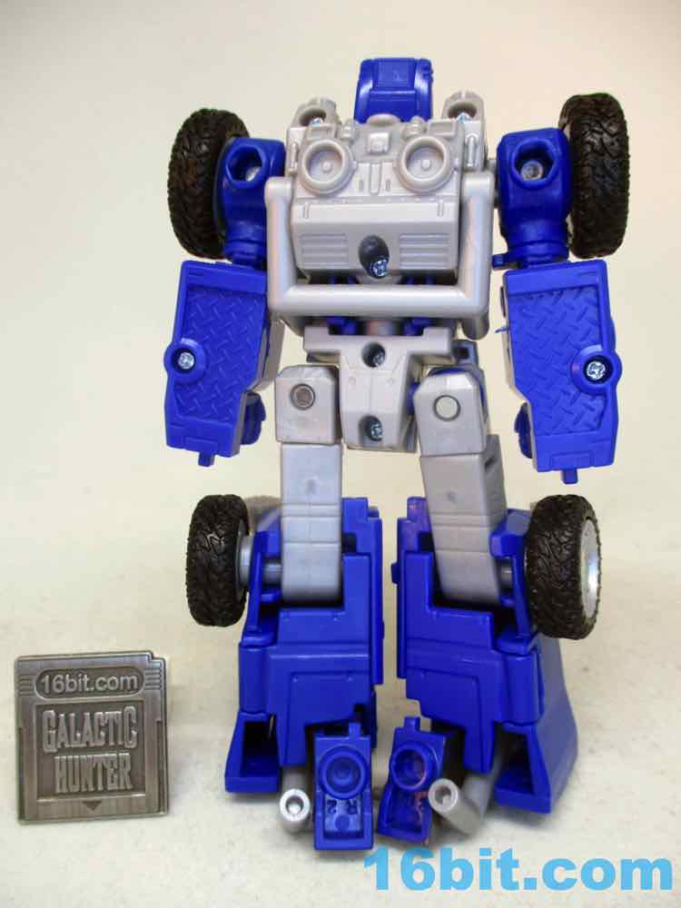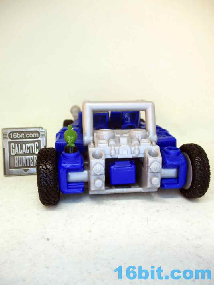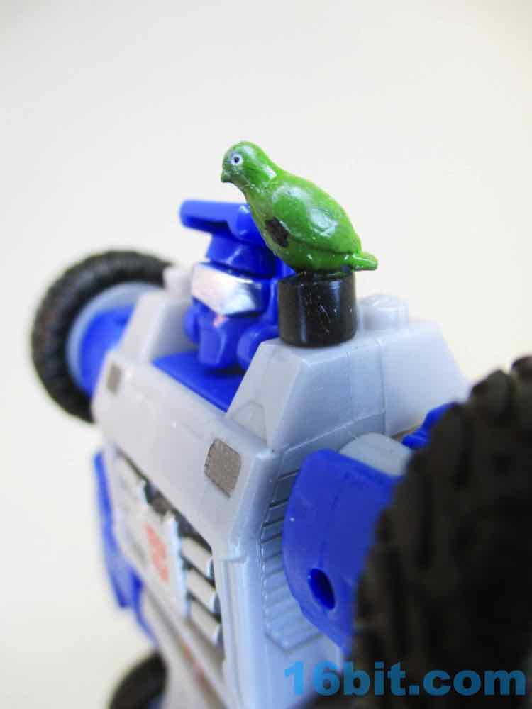Standing 4 1/2-inches tall, Beachcomber throws down the gauntlet to anyone at Takara-Tomy thinking of doing a Masterpiece Edition toy. If you can give us a parrot, a blaster, and rubber tires for $25, you'd have to make a really compelling case to pay $100 or more for a similar toy of the same character. The legs swing forward freely, allowing him to sit. His big boots keep him from falling over. The blaster fits easily in his swivel fists. The kibble collapses nicely into the robot mode, giving him a pleasing silhouette with minimal chunks hanging off. The figure's proportions and deco are more in line with the cartoon, meaning a less barrely chest and a perfectly nice head with the silver sunglasses are present.