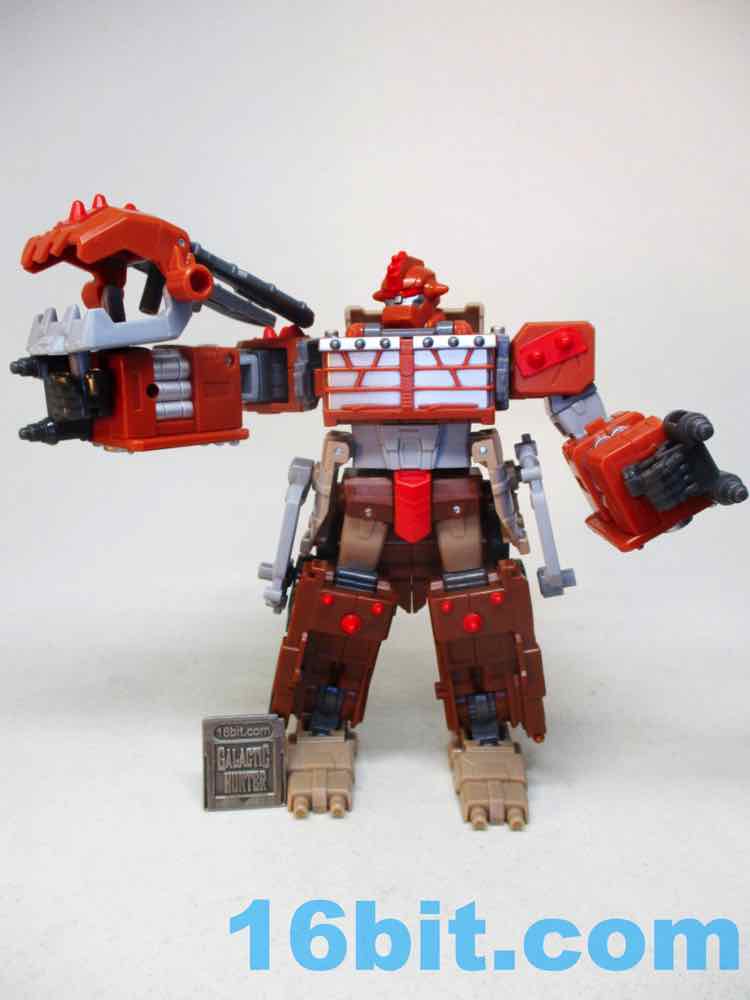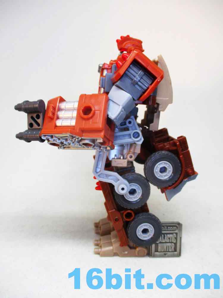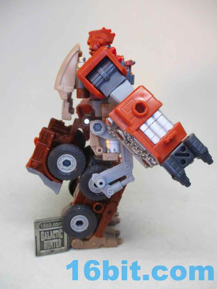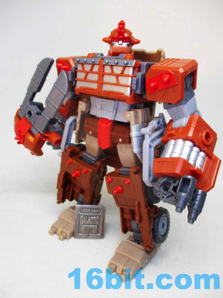While he is a new person, he does come off as a familiar pastiche of things you've seen. The articulation is very good, and the "monster mode" you can make by putting the clamp weapon on the neck area is a hoot, though. This is a toy you buy to play with - the elbow articulation is excellent and the big feet allow for a variety of poses without the robot falling over. The character design doesn't come off as one of the very best, but I do like the engineering a lot. The robot mode does feel like a bunch of boxes with sharp bits bolted on, but at least it's sturdy and fun to pose. I don't think the truck windshield reads well, and it also seems odd as a chest. Maybe it's the silver.
