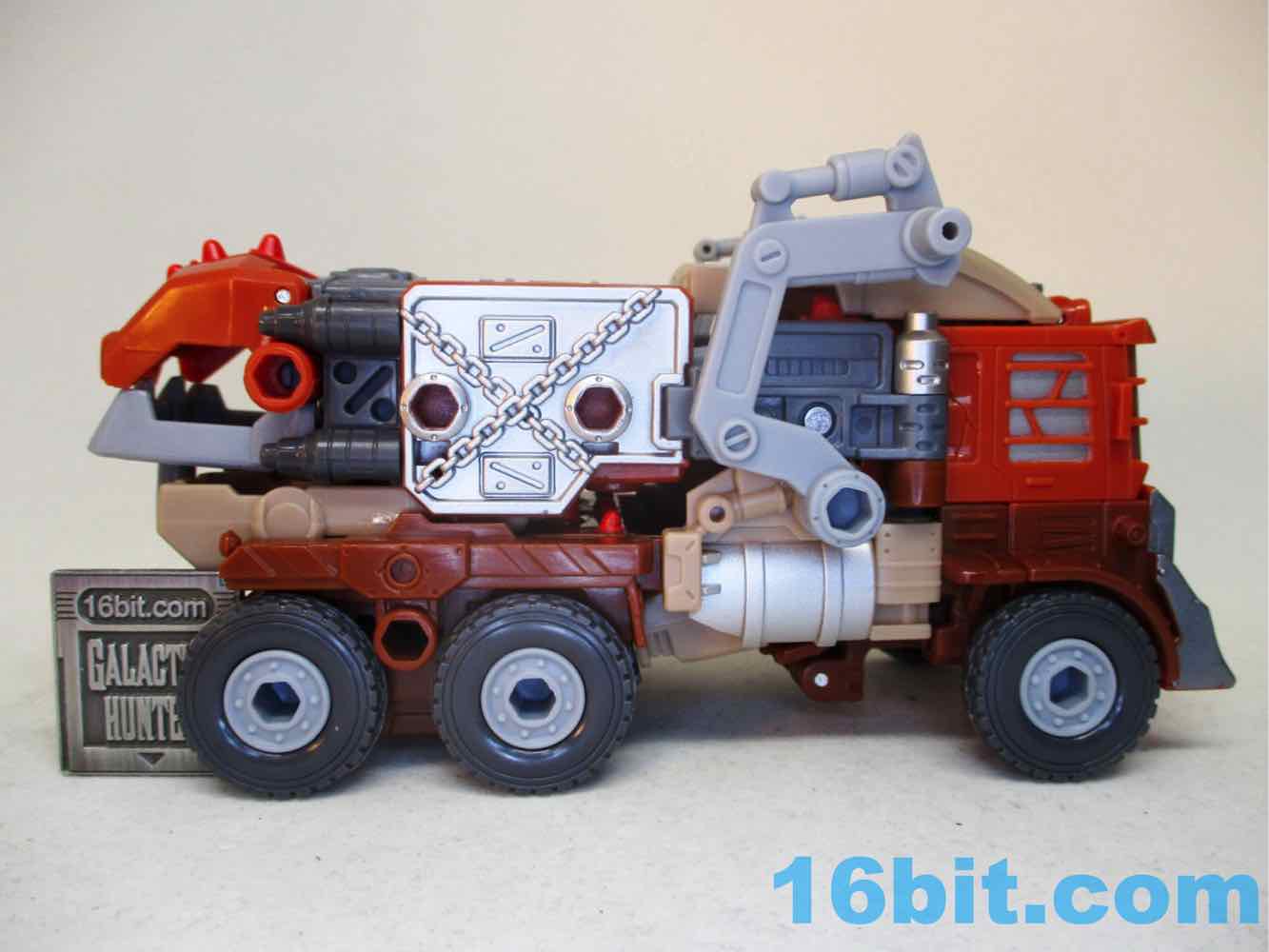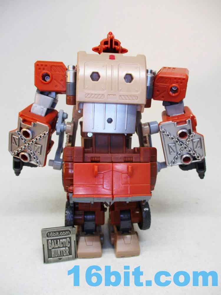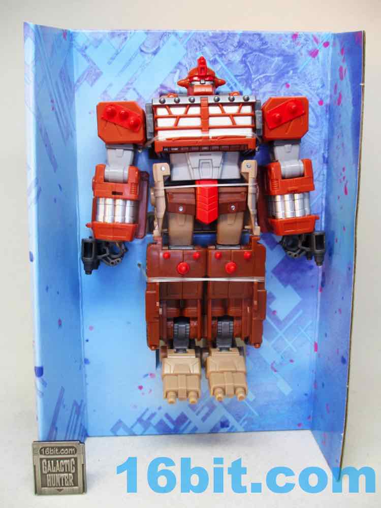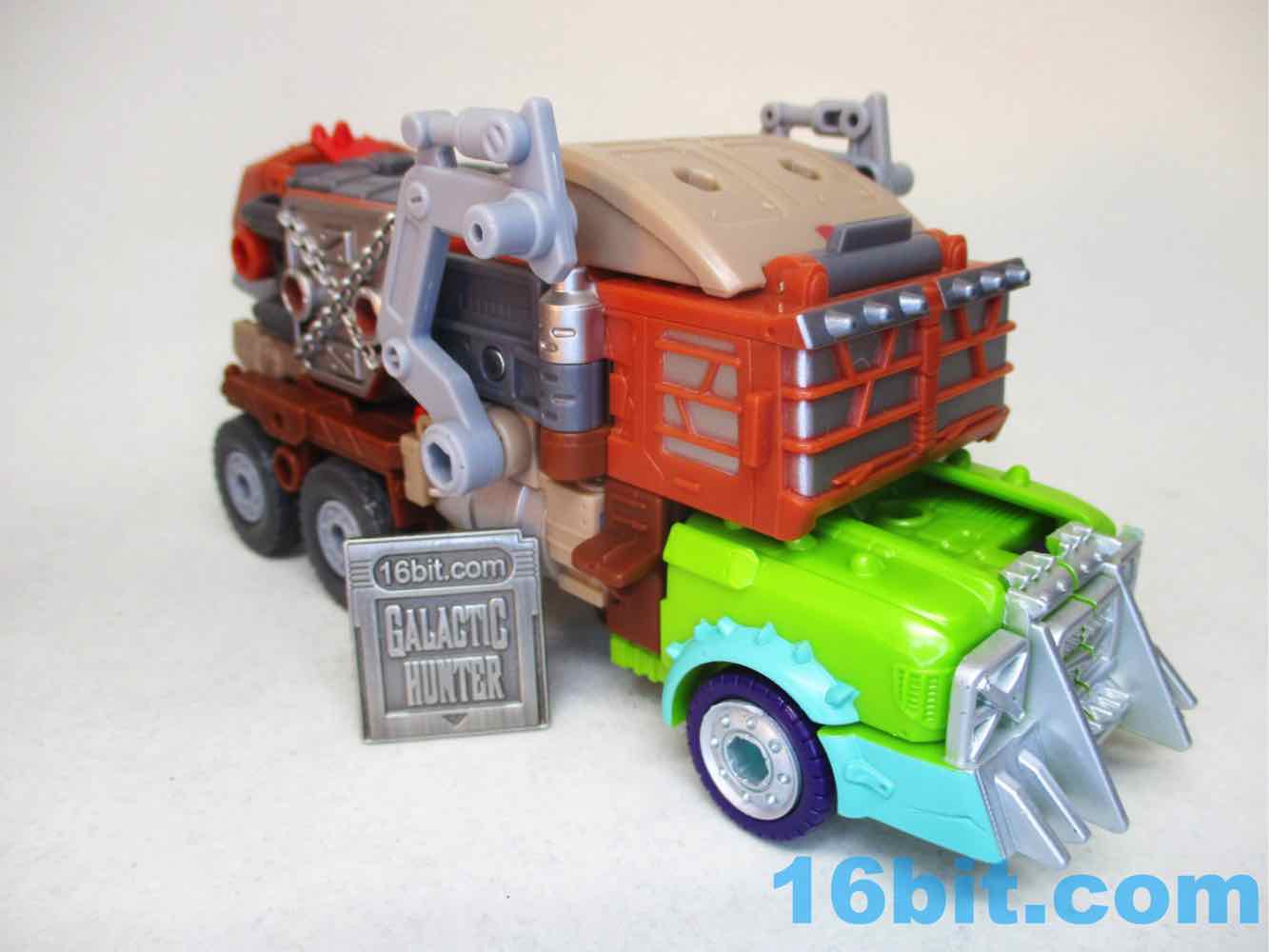 A new character the size of a short Voyager or tall Deluxe at about 6-inches, you might not feel you're getting your money's worth compared to the Deluxe junkions that are loaded with accessories. Trashmaster has an excellent new head with underbite that looks like it fell out of a Transformers Animated sketchbook, complete with spikes. His chunky body has built-in blasters on his wrists and is built like some of the more robust guys from the late 2000s. You get the spike and chain detail you expect, with a paint job evocative of Wreck-Gar and his buddies. He doesn't quite fit in perfectly with the other guys, but there are a lot of similarities.