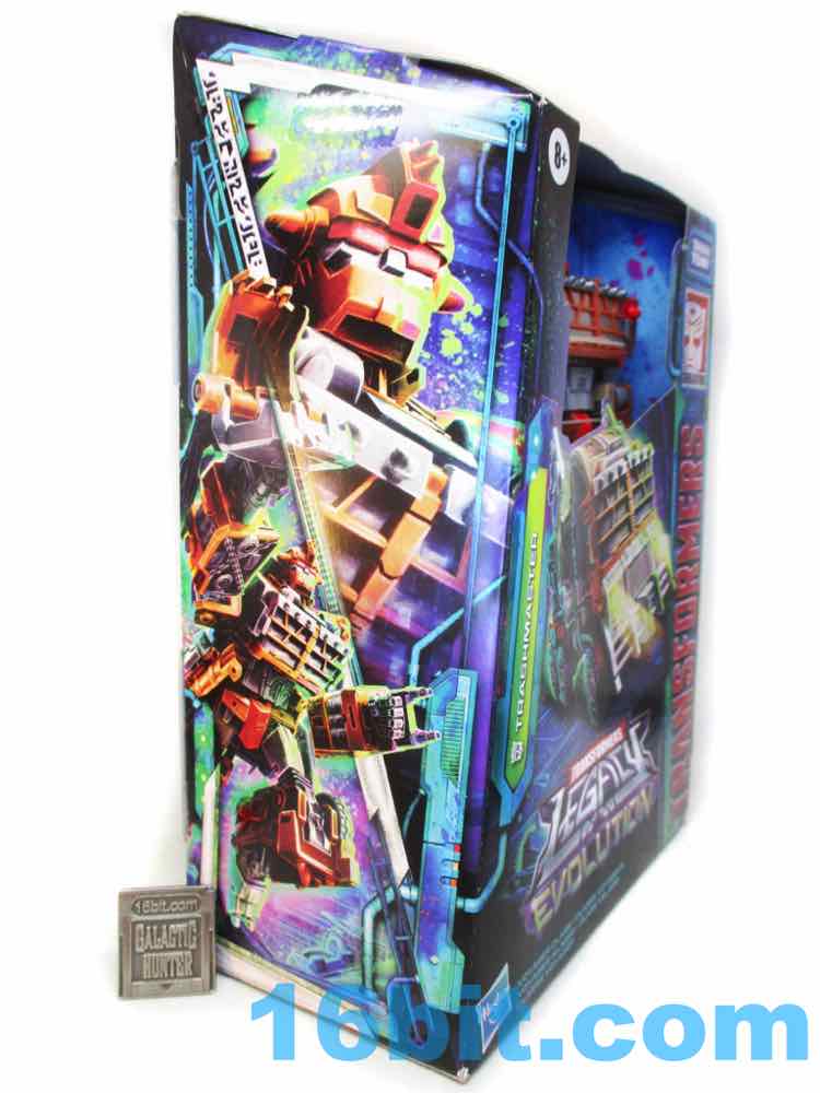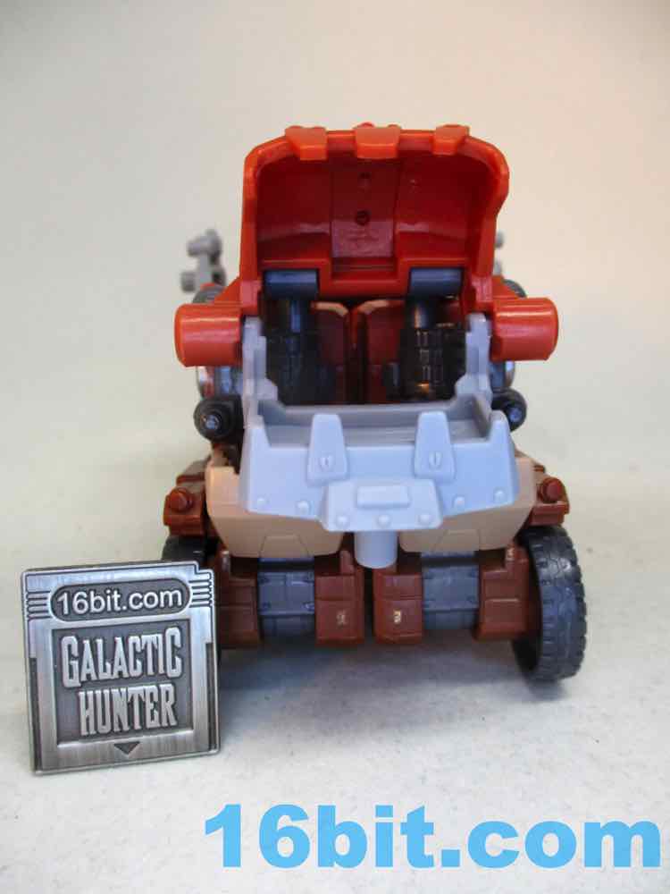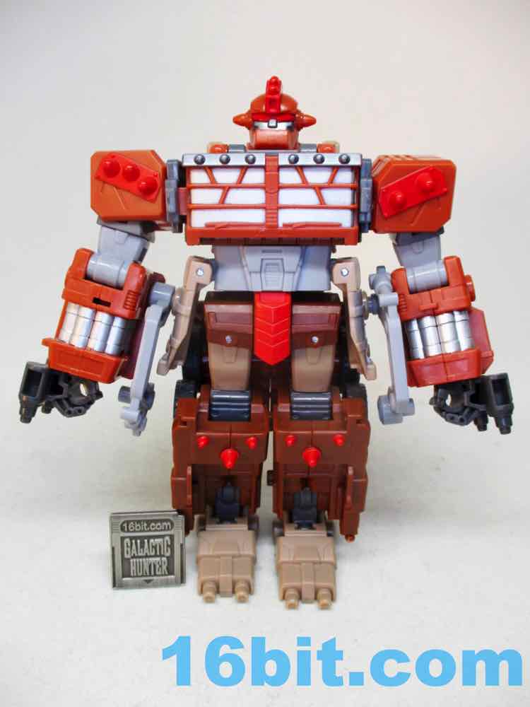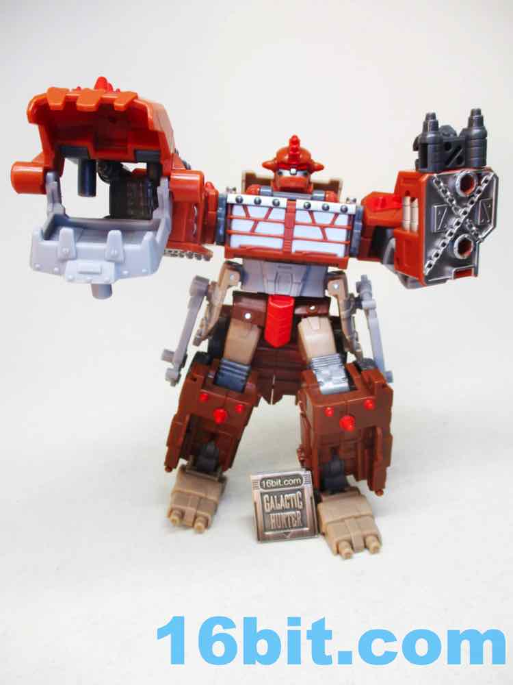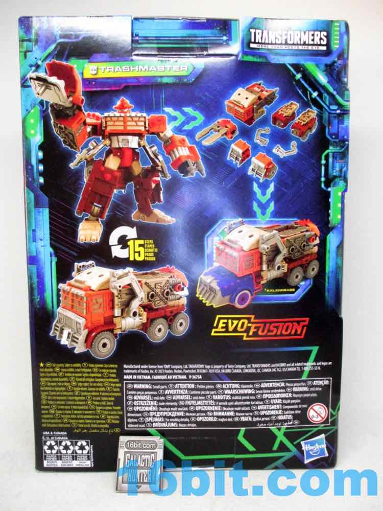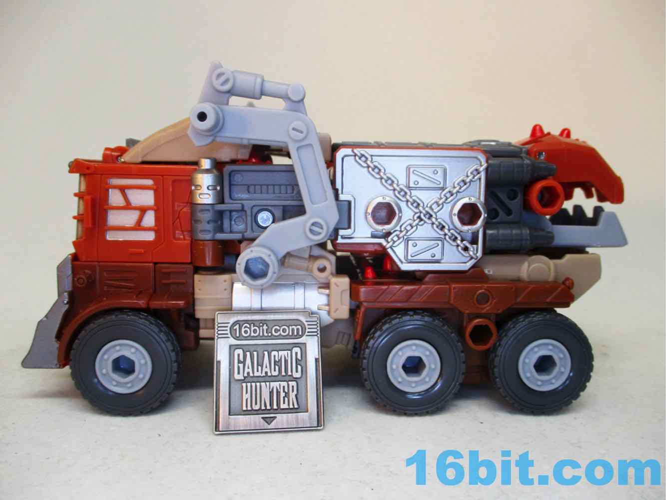 A new character the size of a short Voyager or tall Deluxe at about 6-inches, you might not feel you're getting your money's worth compared to the Deluxe junkions that are loaded with accessories. Trashmaster has an excellent new head with underbite that looks like it fell out of a Transformers Animated sketchbook, complete with spikes. His chunky body has built-in blasters on his wrists and is built like some of the more robust guys from the late 2000s. You get the spike and chain detail you expect, with a paint job evocative of Wreck-Gar and his buddies. He doesn't quite fit in perfectly with the other guys, but there are a lot of similarities.